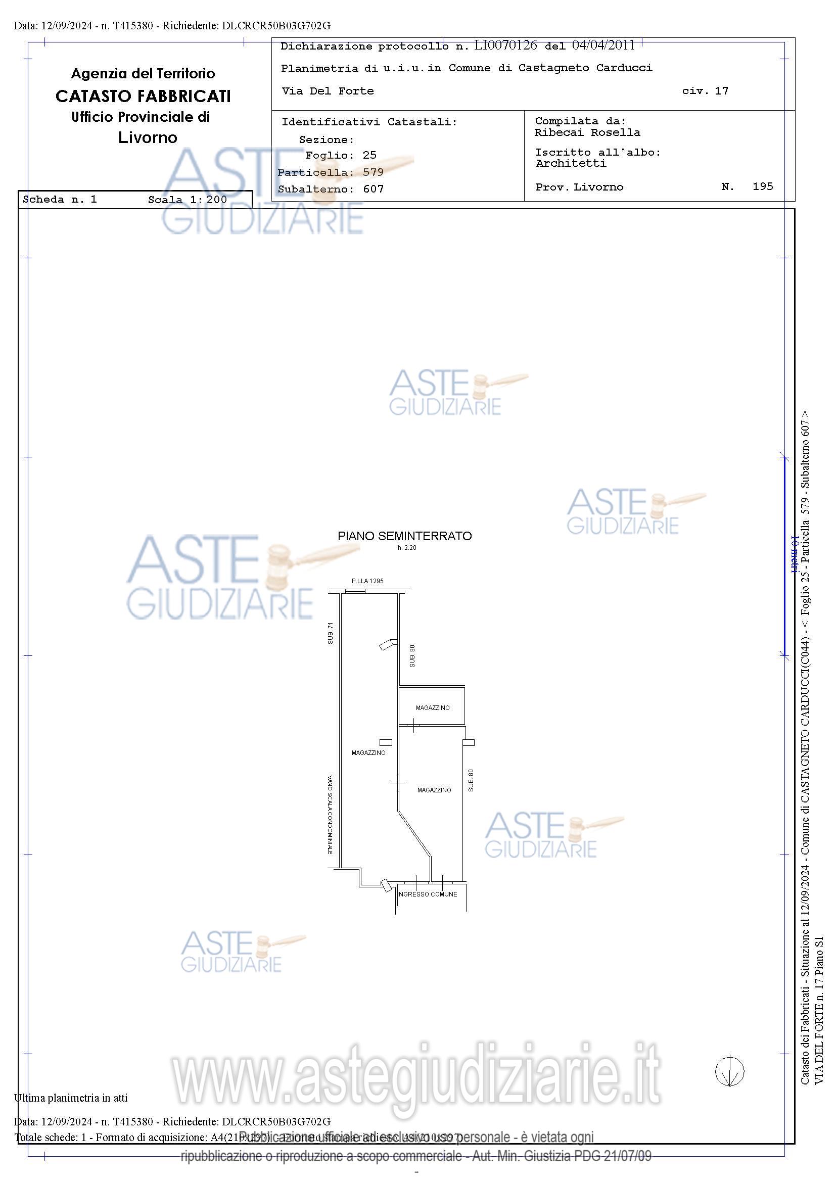 Vendita all'asta Senza incanto, con gara telematica asincrona - LOTTO 2: Piena proprietà di fondo ad uso magazzino, al piano S1, composto da tre vani con accesso tramite due porte in alluminio anodizzato. Prezzo base € 32.475,00 (offerta minima € 24.356,00). Data inizio operazioni di vendita: 12/03/2026 ore 11:00. Giudice Simona Capurso. Professionista delegato alla vendita Avv. Ilaria Morelli - Email "avvmorelli@imorelli.it"; Cell. 3333440589. Custode Giudiziario Ivg - Email "prenotazionilivorno@astagiudiziaria.com". Rif. Tribunale di Livorno - Espropriazione immobiliare (cartabia) n. 88/2024