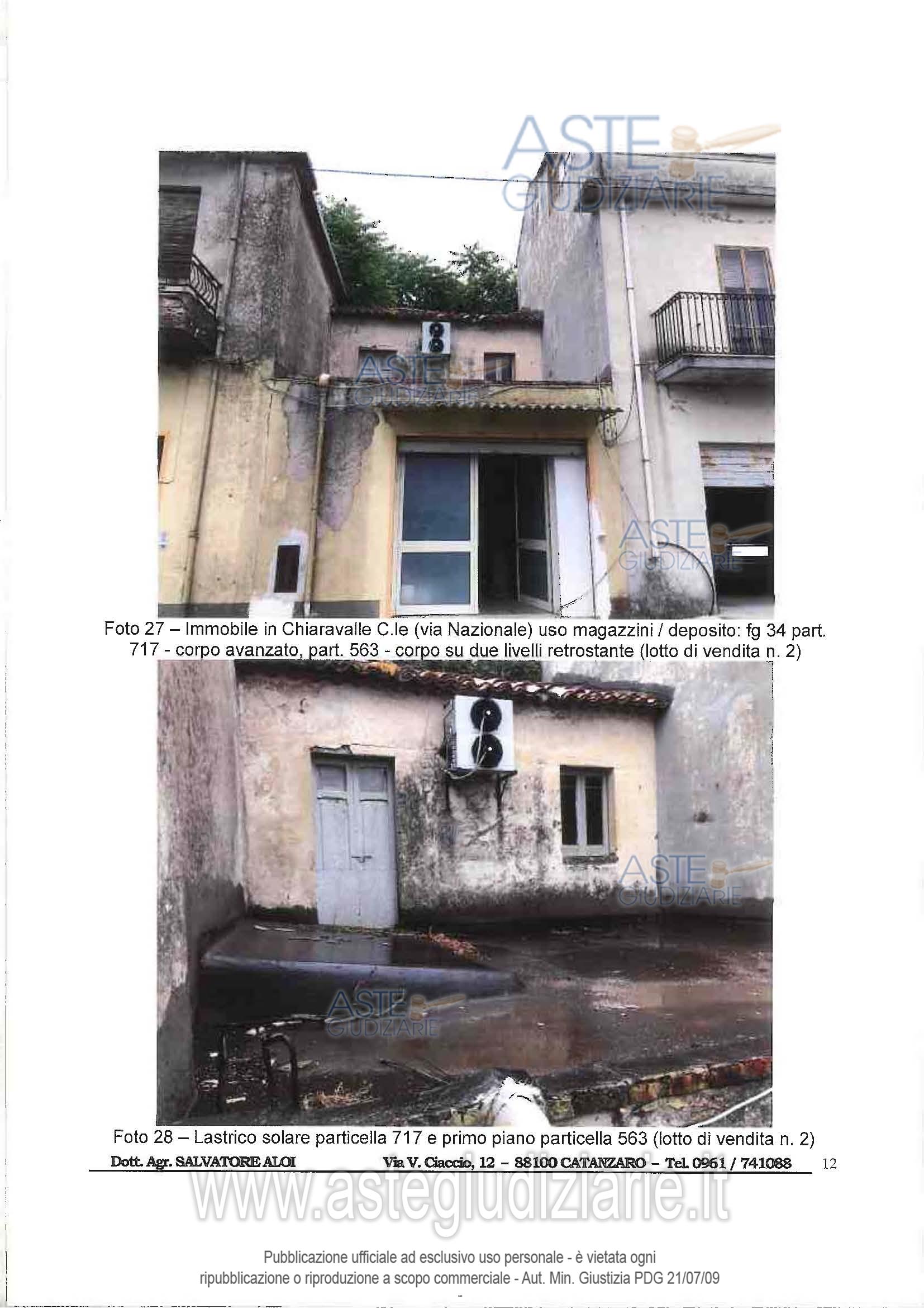 Vendita all'asta Senza incanto, con gara telematica asincrona - LOTTO 2: Piena proprietà per la quota di 1000/1000 di fabbricato, su 2 livelli adibito a magazzini depositi, in Chiaravalle C.le (CZ) alla Via Nazionale n. 58, superficie lorda complessiva commerciale di circa mq. 89,00 circa, in Catasto Fabbricati al Foglio 34, mappale 563, categoria A/4, Rendita € 41,83,00 ed al Foglio 34, mappale 717, categoria C/2, rendita € 47,51, come meglio descritto nella relazione tecnica di stima a firma del Dott. Agr. Salvatore Aloi, esperto nominato dal GE nella procedura RGE 76/2019. Prezzo base € 5.184,00 (offerta minima € 3.888,00). Data inizio operazioni di vendita: 05/05/2026 ore 10:00. Professionista delegato alla vendita Not. Rocco Guglielmo - Email "rguglielmo@notariato.it"; Tel. 0961 745517. Custode Giudiziario Not. Rocco Guglielmo - Email "rguglielmo@notariato.it"; Tel. 0961745517. Rif. Tribunale di Catanzaro - Esecuzione immobiliare post legge 80 n. 40/2013