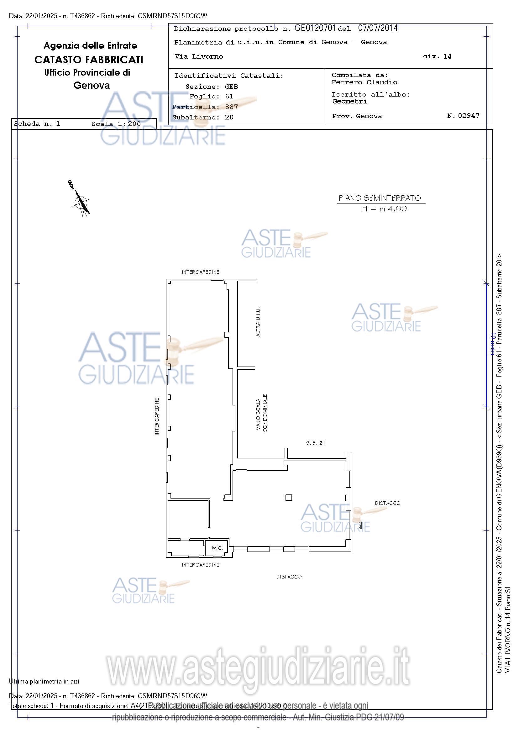 Vendita all'asta Senza incanto, con gara telematica sincrona mista - LOTTO UNICO: Lotto Unico formato da un magazzino ubicato a Genova (GE) - Via Livorno, civ. 14, posto al piano seminterrato;• distribuzione locali: l'immobile si sviluppa con una conformazione planimetrica costituita da due poligoni di forma rettangolare disposti ortogonalmente tra loro, due vani principali, un ripostiglio ed un servizio igienico. Prezzo base € 154.400,00 (offerta minima € 115.800,00). Data vendita 14/11/2025 ore 14:00. Professionista delegato alla vendita Dott. Michele Moggia - Email "m.moggia@studiocbi.it"; Tel. 010562505. Custode Giudiziario So.Ve.Mo. Srl - Email "immobiliare@sovemo.com". Rif. Tribunale di Genova - Espropriazione immobiliare (cartabia) n. 523/2024