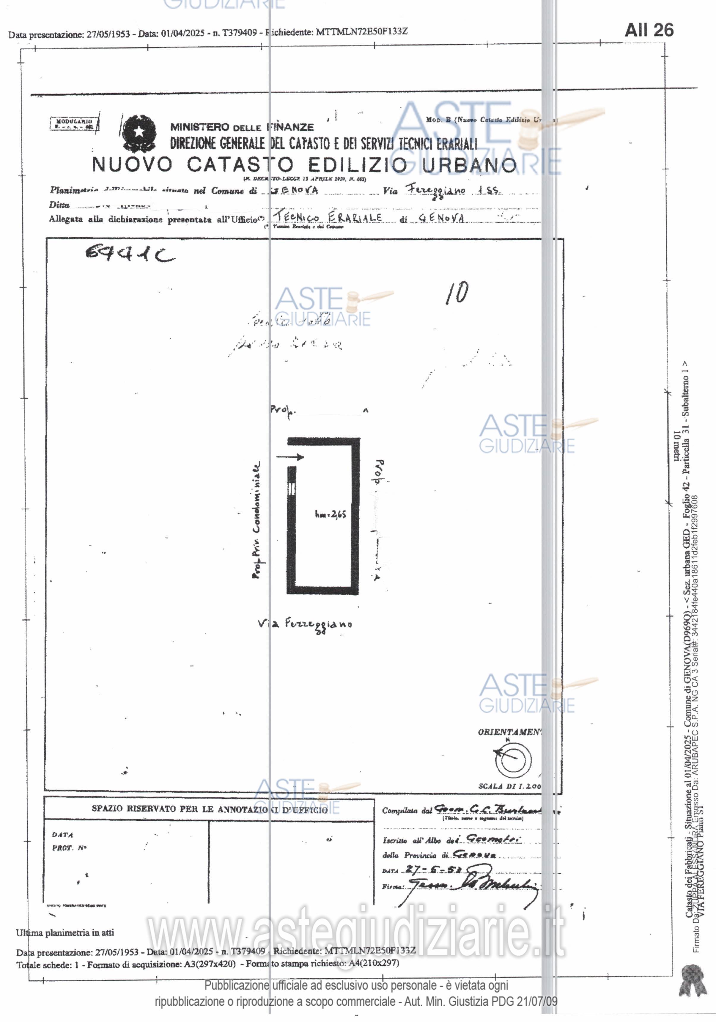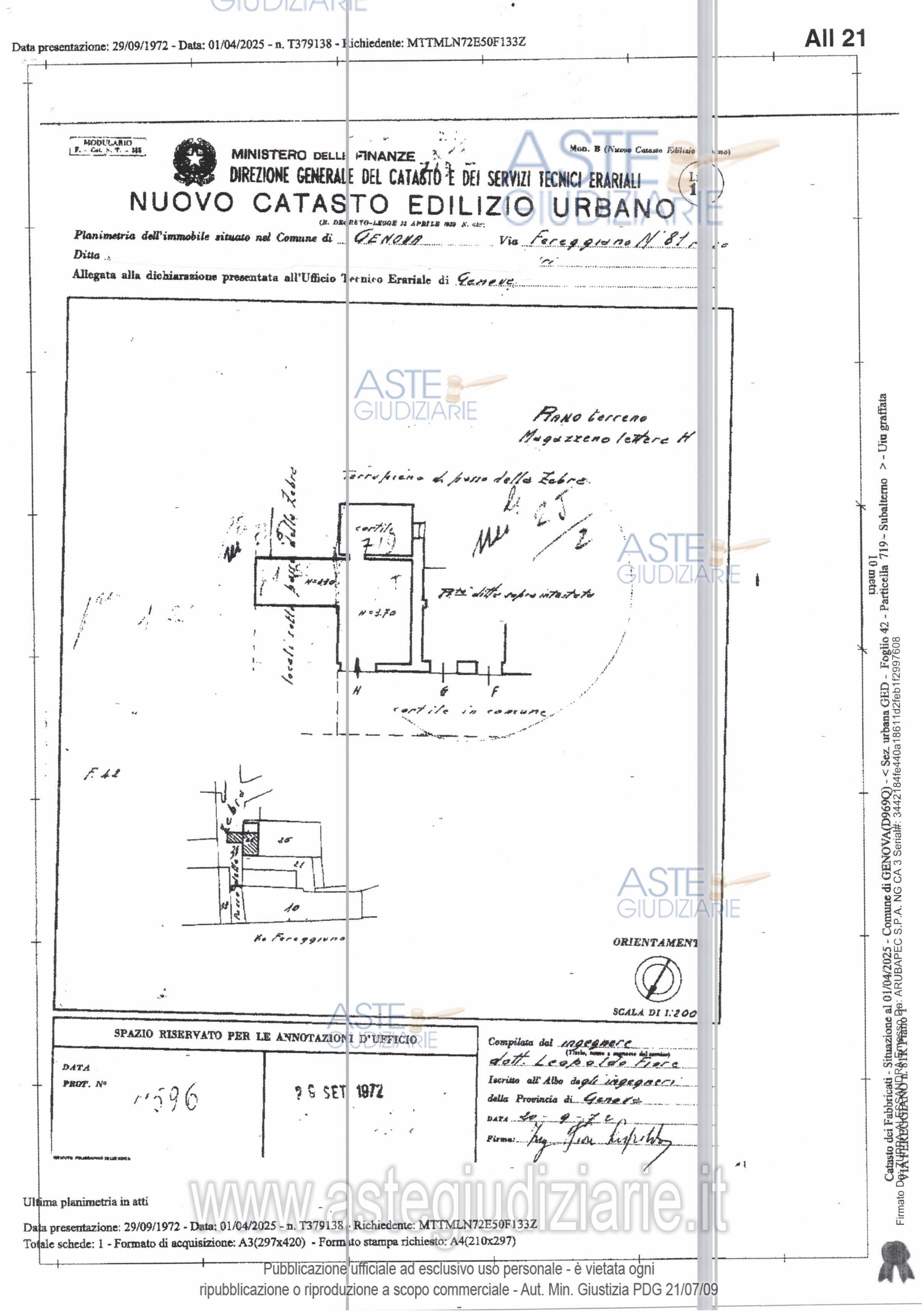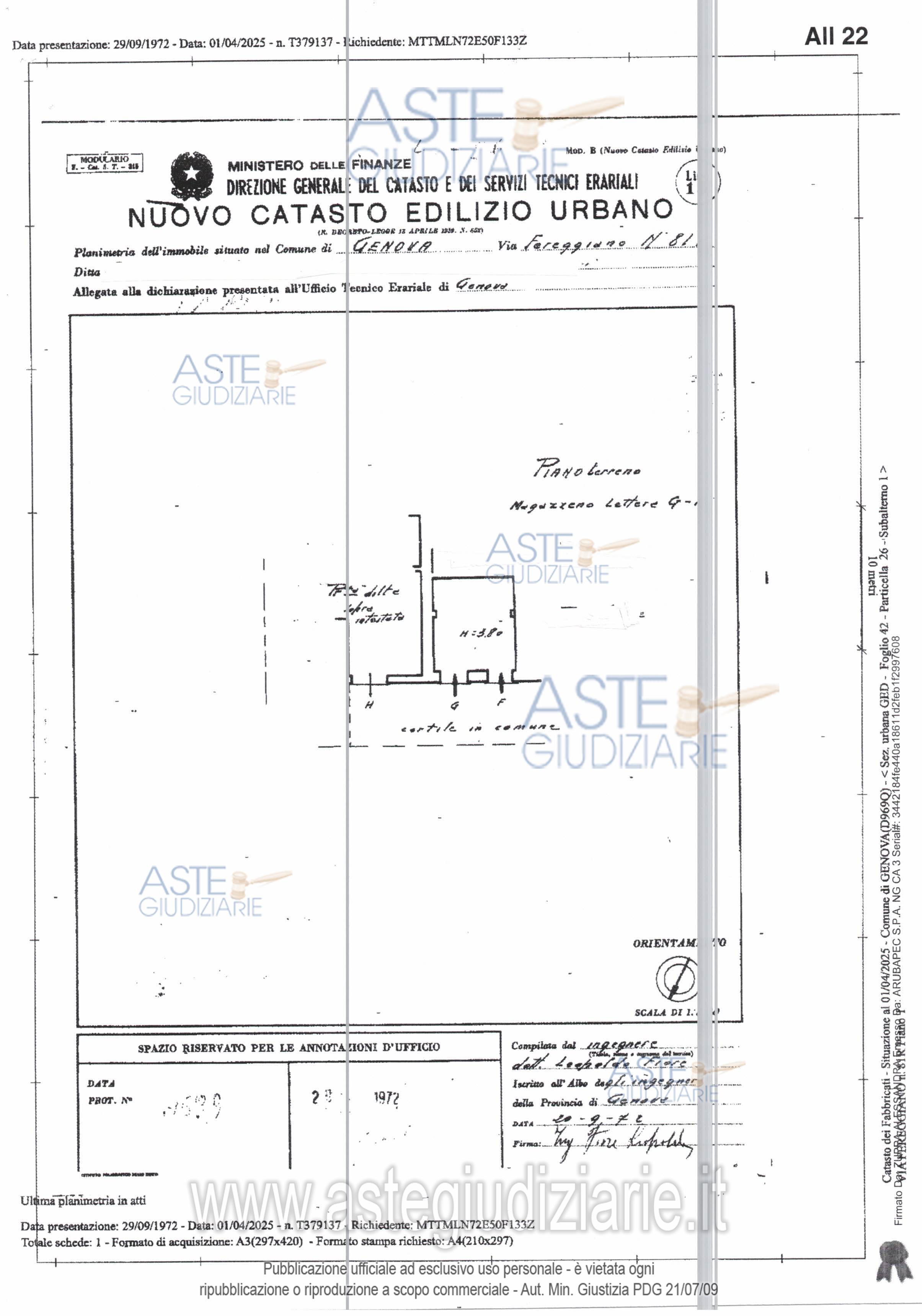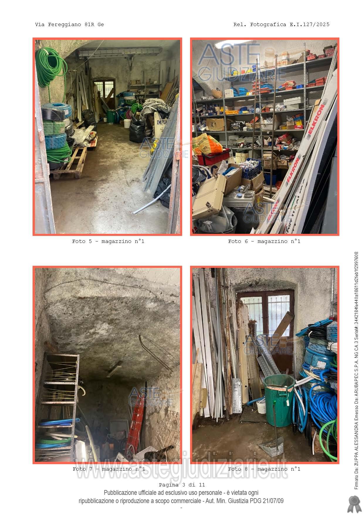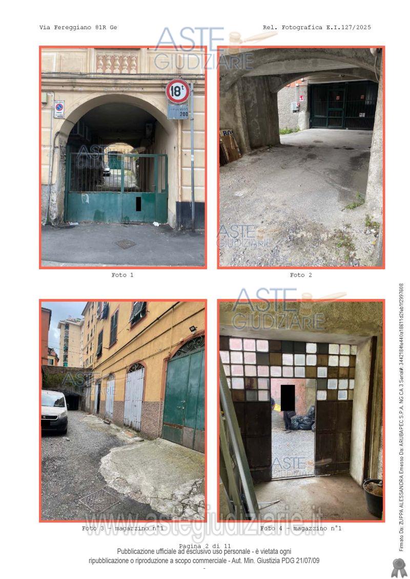 Vendita all'asta Senza incanto, con gara telematica sincrona mista - LOTTO UNICO: Lotto 1 - Bene 1 1/1 Diritto di proprietà magazzino ubicato a Genova (GE), Via Fereggiano 81 rosso, piano terra, superficie convenzionale mq. 66,; locale ad uso magazzino, con unico ingresso, situato al piano terra dell'immobile distinto con il cvi. 1 di Passo della Zebra, con annesso sul lato sud piccolo cortile, il tutto con accesso carrabile e pedonale tramite passaggio privato dal civico 81 rosso di Via Fereggiano. Prezzo base € 25.047,00 (offerta minima € 18.785,25). Data vendita 27/05/2026 ore 12:00. Professionista delegato alla vendita Avv. Paola Bruni Prencipe - Email "studioavvbruni@libero.it"; Cell. 3272357296; Tel. 0104075392. Custode Giudiziario Dott. So.Ve.Mo. Srl So.Ve.Mo Srl - Email "visitegenova@sovemo.com"; Cell. 0105299253; Tel. 0105299253. Rif. Tribunale di Genova - Espropriazione immobiliare (cartabia) n. 127/2025