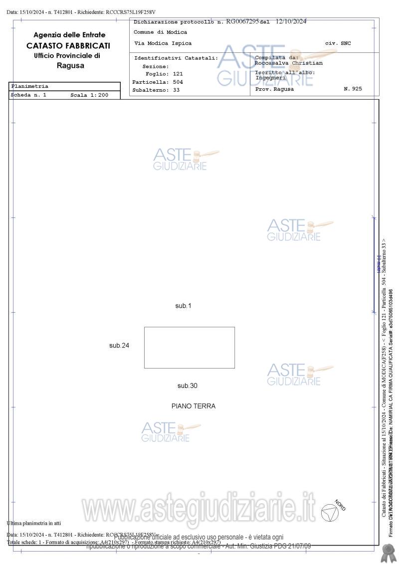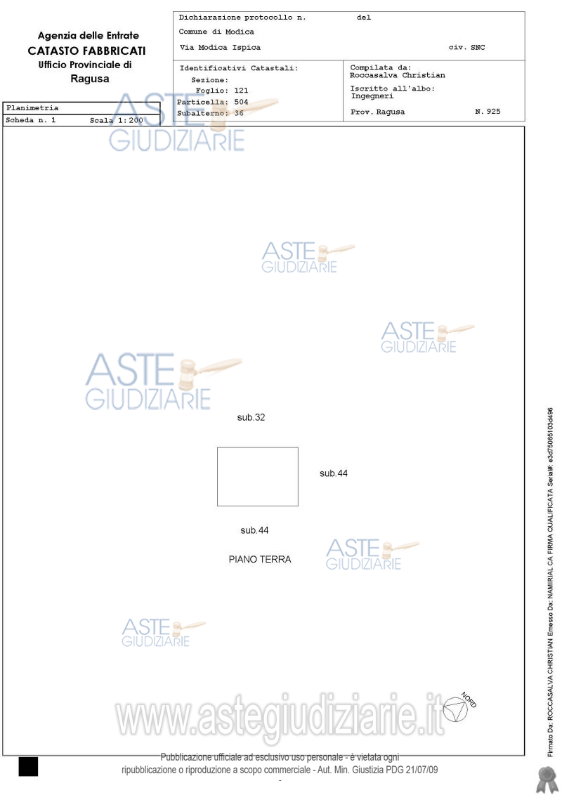 Vendita all'asta Senza incanto, con gara telematica sincrona mista - LOTTO 7: Locale magazzino sito al piano terra in Via Modica-Ispica snc, identificato al N.C.E.U. al foglio 121, particella 504, subalterno 23, categoria C/2, superficie commerciale di 100,70 mq, rendita catastale € 227,76. Area di pertinenza censita col subalterno 43 (categoria C/6). Prezzo base € 32.083,00 (offerta minima € 32.083,00). Data vendita 05/02/2026 ore 18:30. Professionista delegato alla vendita Dott. Graziana Baglieri. Custode Giudiziario Dott. Graziana Baglieri - Email "grazianabaglieri@gmail.com". Curatore Dott. Graziana Baglieri. Rif. Tribunale di Ragusa - Nuovo concordato preventivo n. 4/2021