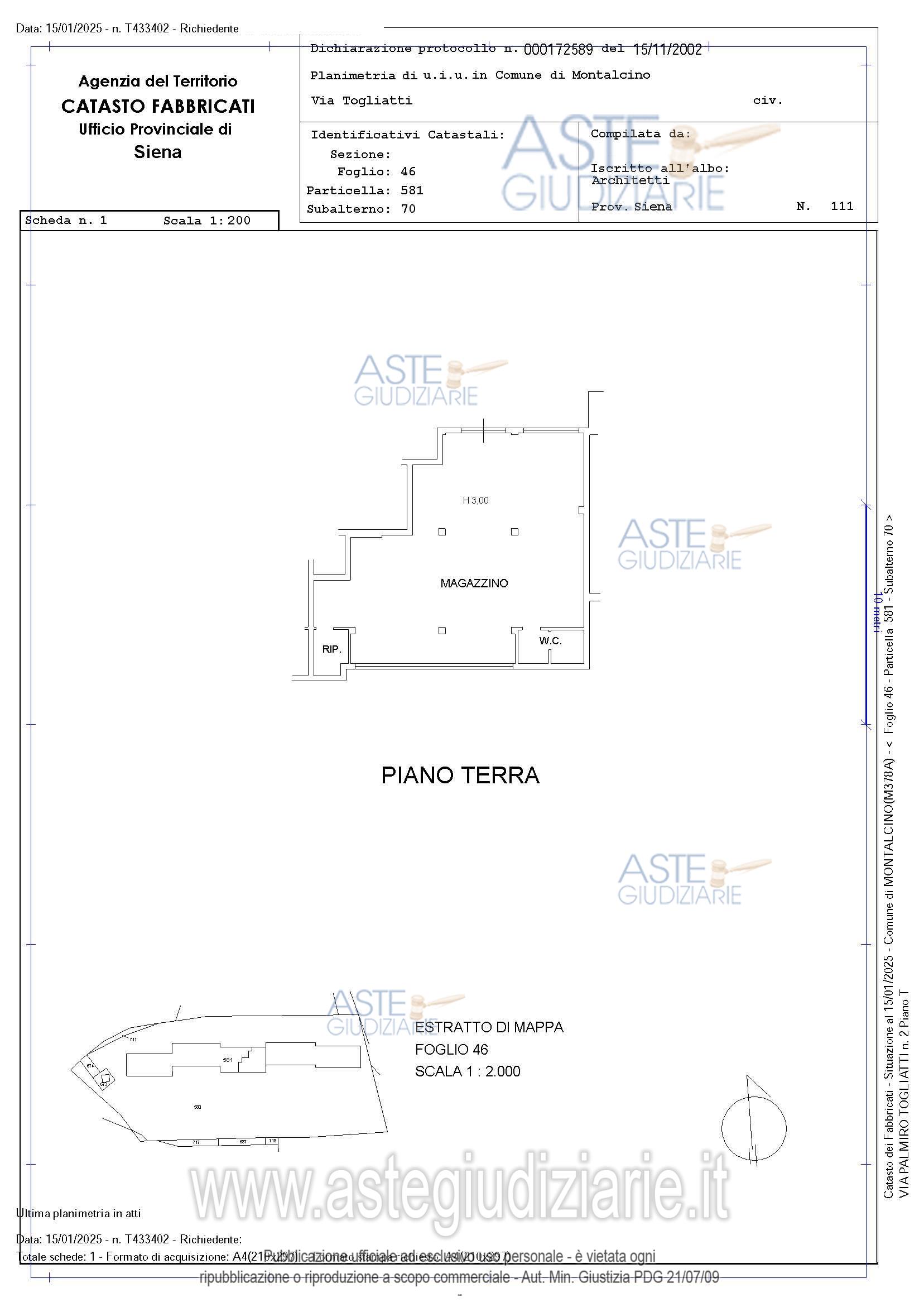 Vendita all'asta Senza incanto, con gara telematica asincrona - LOTTO UNICO: IN COMUNE DI MONTALCINO (SI) – Frazione Torrenieri -: piena e perfetta proprietà per una quota pari all’intero della porzione di fabbricato ad uso commerciale, attualmente utilizzata come magazzino e laboratorio artigianale, ubicata al piano terra del maggior fabbricato con accesso dalla via Palmiro Togliatti n° 2A, composto di tre locali principali oltre anti-bagno, bagno e ripostiglio. Prezzo base € 46.000,00 (offerta minima € 46.000,00). Data inizio operazioni di vendita: 19/05/2026 ore 12:00. Giudice Dott. Marta Dell'unto. Rif. Tribunale di Siena - Liquidazione controllata(cci) n. 7/2024