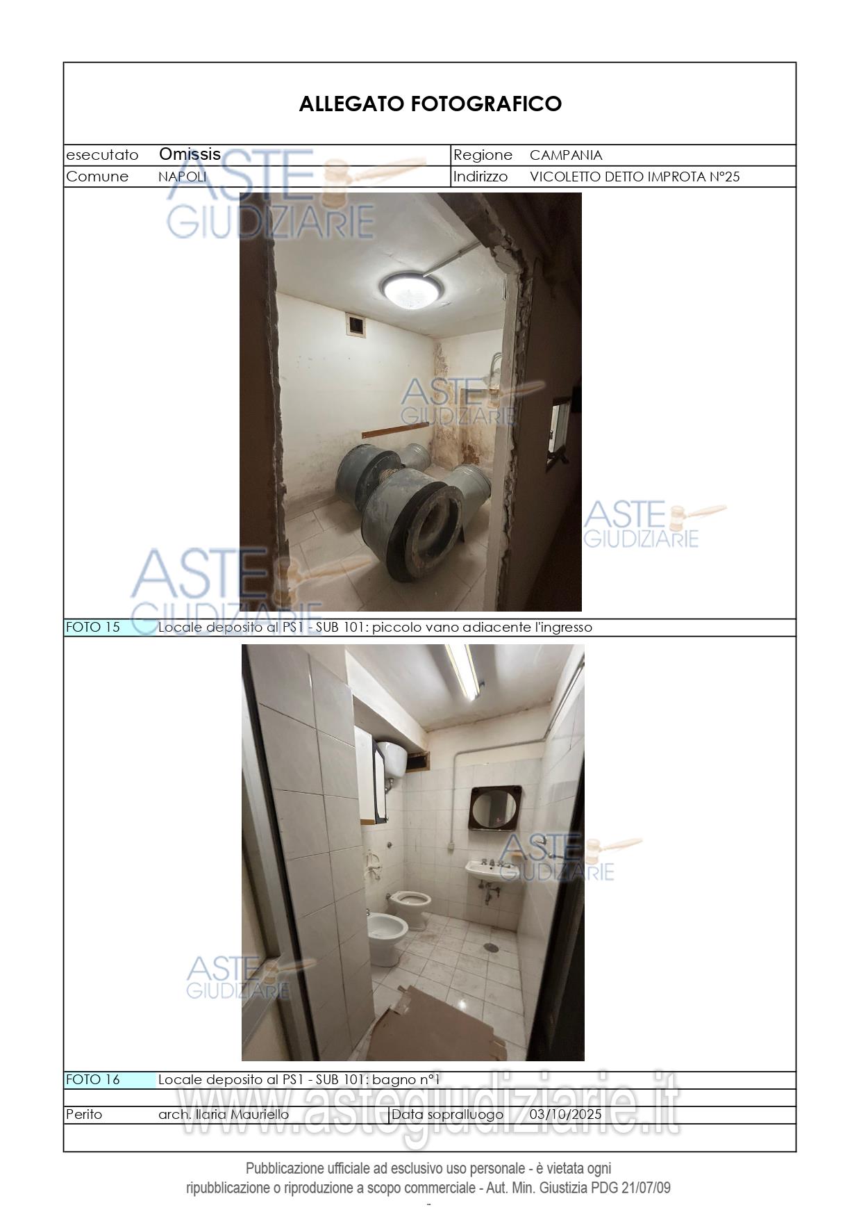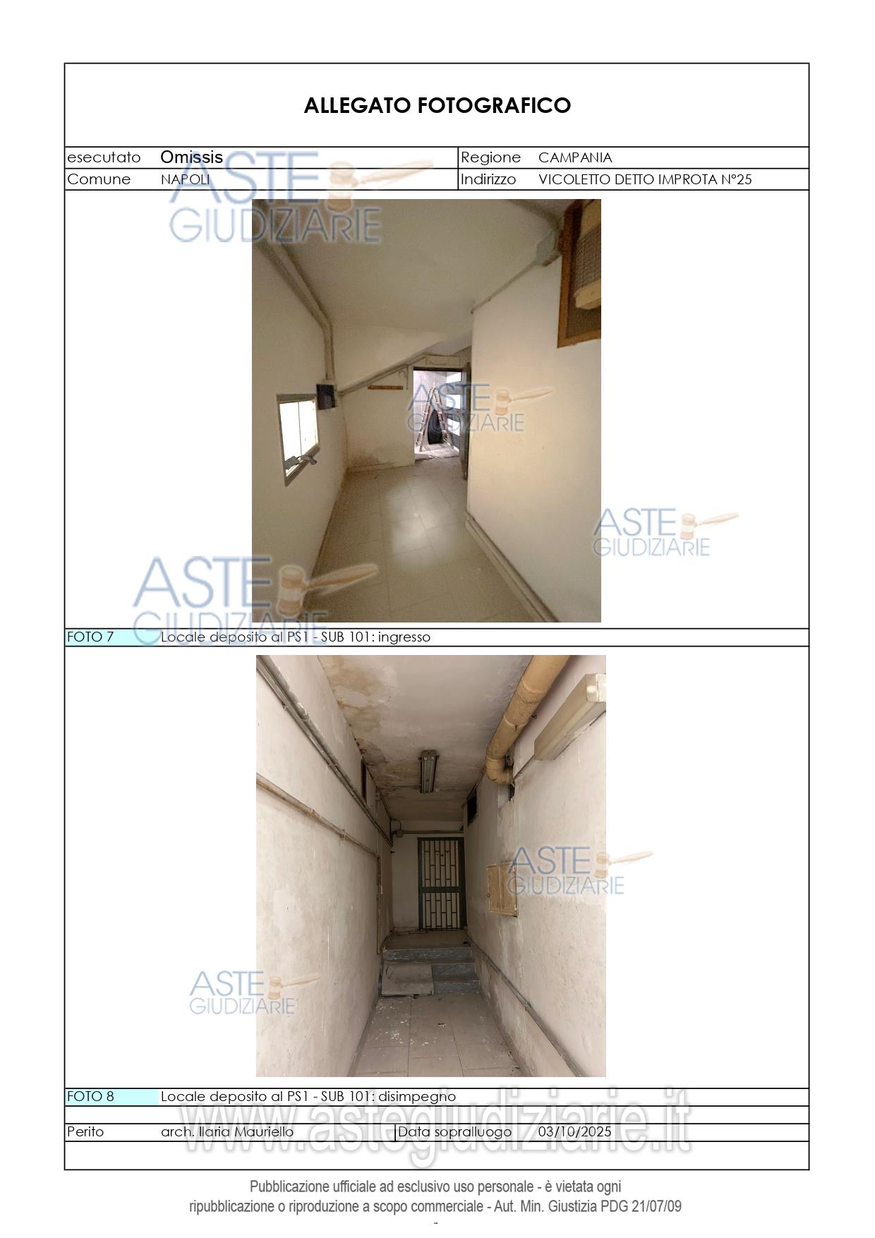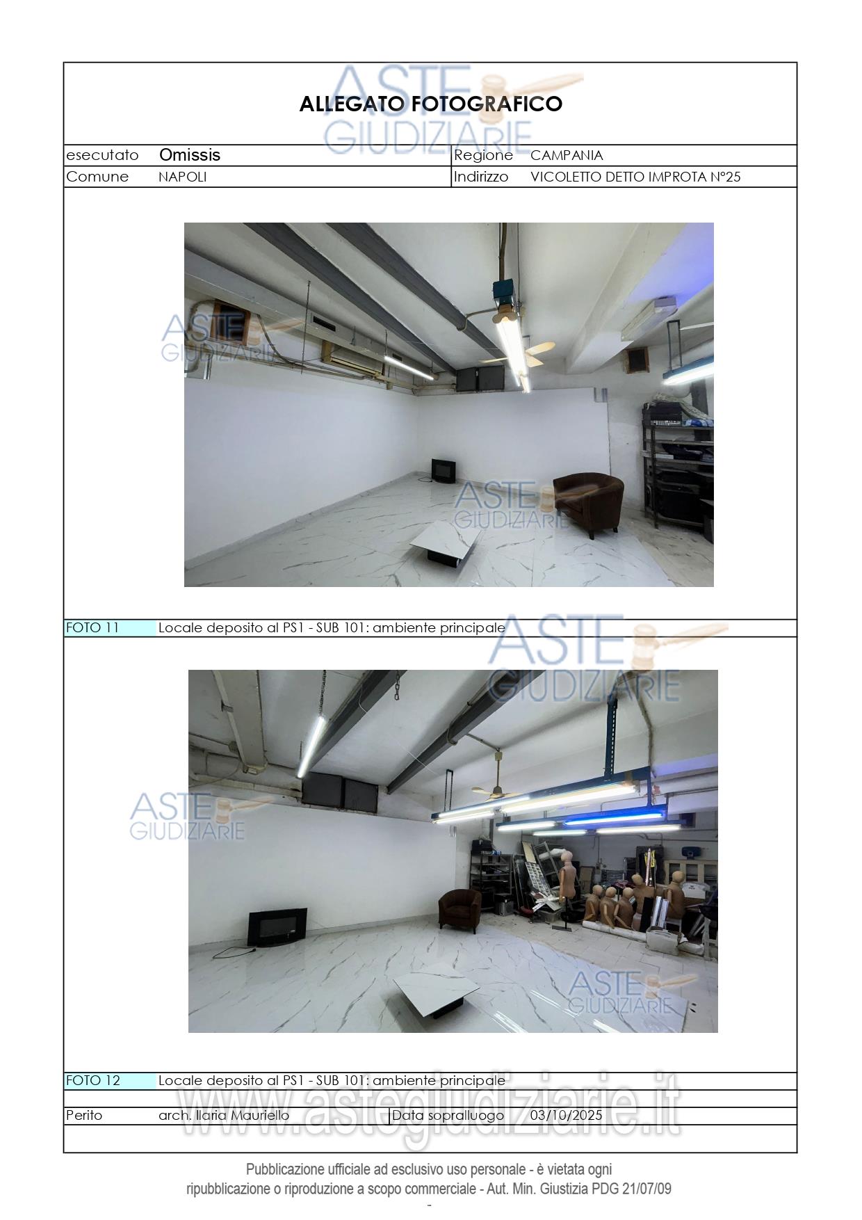 Vendita all'asta Senza incanto, con gara telematica asincrona - LOTTO UNICO: Piena ed intera proprietà di immobile in Napoli 80144, al Vicoletto detto Improta n. 25 consistente in un locale deposito, ubicato al piano seminterrato della superficie netta pari a circa mq 120, composto da ingresso, piccolo ambiente adiacente l’ingresso, ampio ambiente principale, n. 2 bagni; ripostiglio e disimpegni. Prezzo base € 51.000,00 (offerta minima € 38.250,00). Data inizio operazioni di vendita: 21/07/2026 ore 16:00. Giudice: Margherita Lojodice.