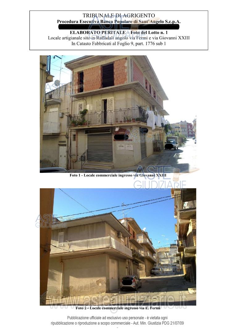 Vendita all'asta Senza incanto, con gara telematica sincrona mista - LOTTO 1: Lotto 1: magazzino dest. Lab. Artigianale in Raffadali (Ag) Via Giovanni XXIII – Via E. Fermi mq 91 c.ca al NCEU fg. 9 mapp. 1776 sub 1 cat. C/1 cl. 4. Prezzo base € 22.941,57 (offerta minima € 17.210,00). Data vendita 20/03/2026 ore 16:30. Professionista delegato alla vendita Dott. Giuseppe Antonio Lentini - Email "giuseppeantoniolentini@gmail.com"; Cell. 3385659043; Tel. 0922553407. Custode Giudiziario Dott. Giuseppe Antonio Lentini - Email "giuseppeantoniolentini@gmail.com"; Cell. 3385659043; Tel. 0922553407. Rif. Tribunale di Agrigento - Esecuzione immobiliare post legge 80 n. 3/2011