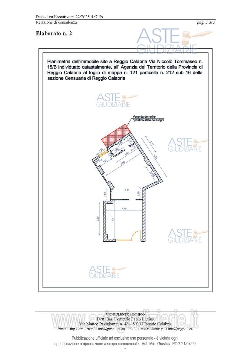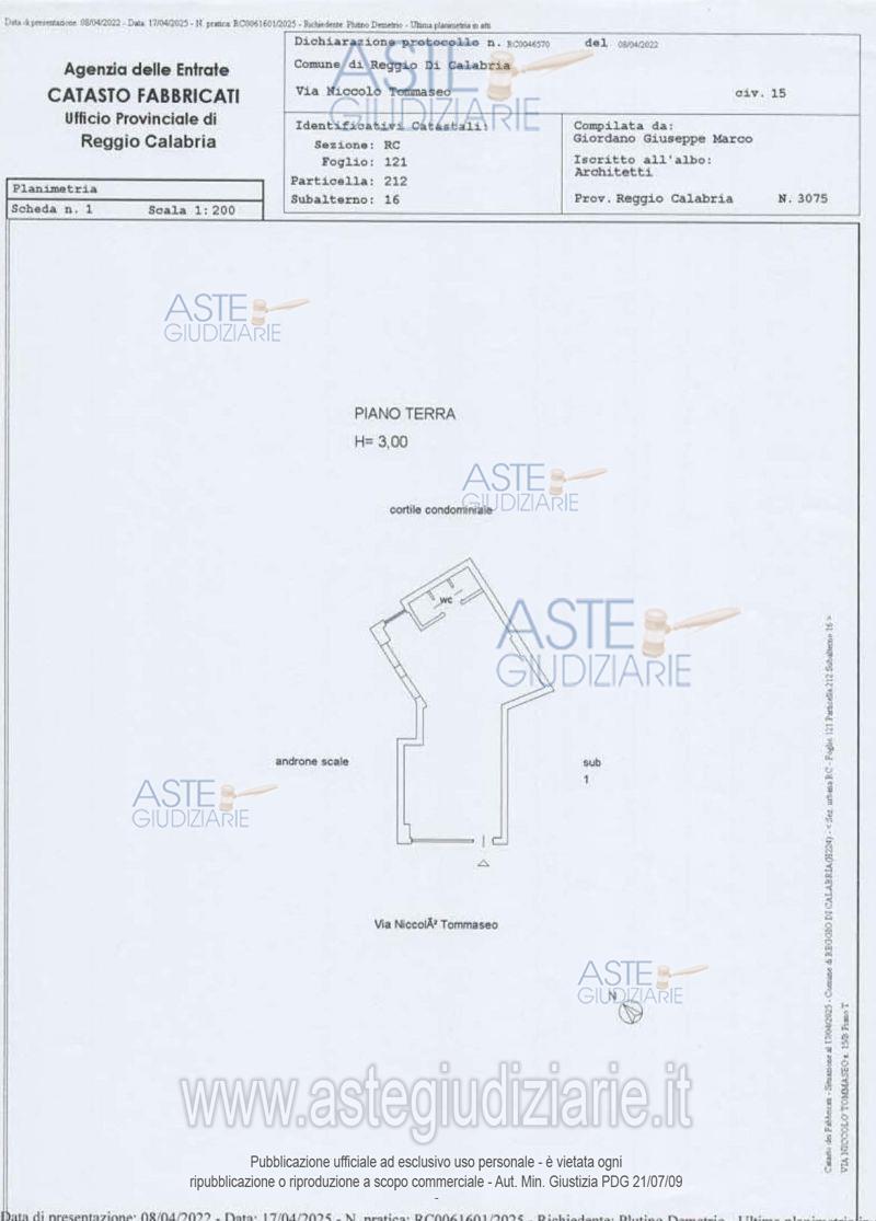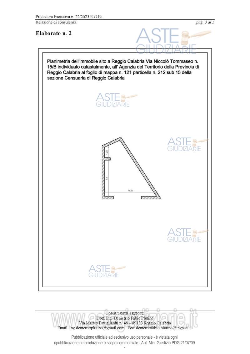 Vendita all'asta Senza incanto, con gara telematica asincrona - LOTTO UNICO: Locale sito in Reggio Calabria, Via Nicolò Tommaseo n. 15, riportato al N.C.E.U. Zona Censuaria di Reggio Calabria, Foglio di mappa n. 121, part. n. 212, sub. 15 (piano terra, cat. C/2, Classe 4, Consistenza 23 mq);. Prezzo base € 48.000,00 (offerta minima € 36.000,00). Data inizio operazioni di vendita: 16/06/2026 ore 16:30. Giudice Dott. Stefano Cantone. Professionista delegato alla vendita Avv. Maria Concetta Lo Iacono - Email "mariaconcetta.loiacono@gmail.com"; Tel. 3282021796. Custode Giudiziario Avv. Maria Concetta Lo Iacono - Email "mariaconcetta.loiacono@gmail.com"; Tel. 3282021796. Rif. Tribunale di Reggio di Calabria - Esecuzione immobiliare post legge 80 n. 22/2025