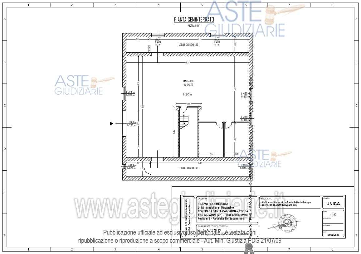 Vendita all'asta Senza incanto, con gara telematica asincrona - LOTTO UNICO: Locale ad uso magazzino sito al piano seminterrato di un edificio plurifamiliare in Contrada Santa Calcagna, Rocca San Giovanni (CH). Il bene è censito al foglio 9, particella 516, sub 5 del Comune di Rocca San Giovanni (CH) di categoria C/2, di classe 1, consistenza catastale di mq. 237 e vani 1, rendita Euro 624,24. Prezzo base € 44.831,25 (offerta minima € 33.623,43). Data inizio operazioni di vendita: 19/05/2026 ore 11:00. Giudice Chiara D'alfonso. Professionista delegato alla vendita Dott. Nicoletta Massimini - Email "nicolettamassimini@gmail.com"; Cell. 3492611532. Custode Giudiziario Ivg - Email "ivglanciano@gmail.com"; Tel. 0872715361. Rif. Tribunale di Lanciano - Espropriazione immobiliare (cartabia) n. 8/2025