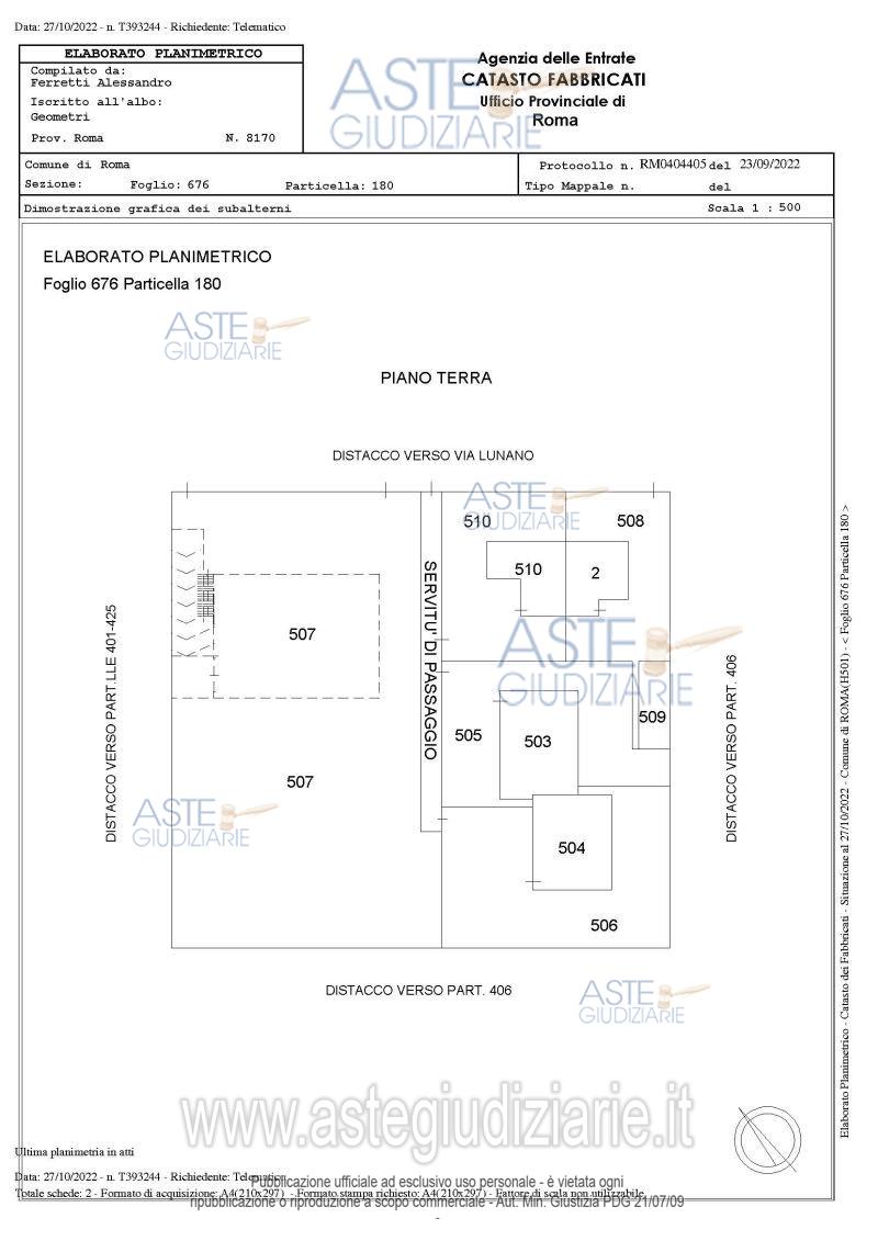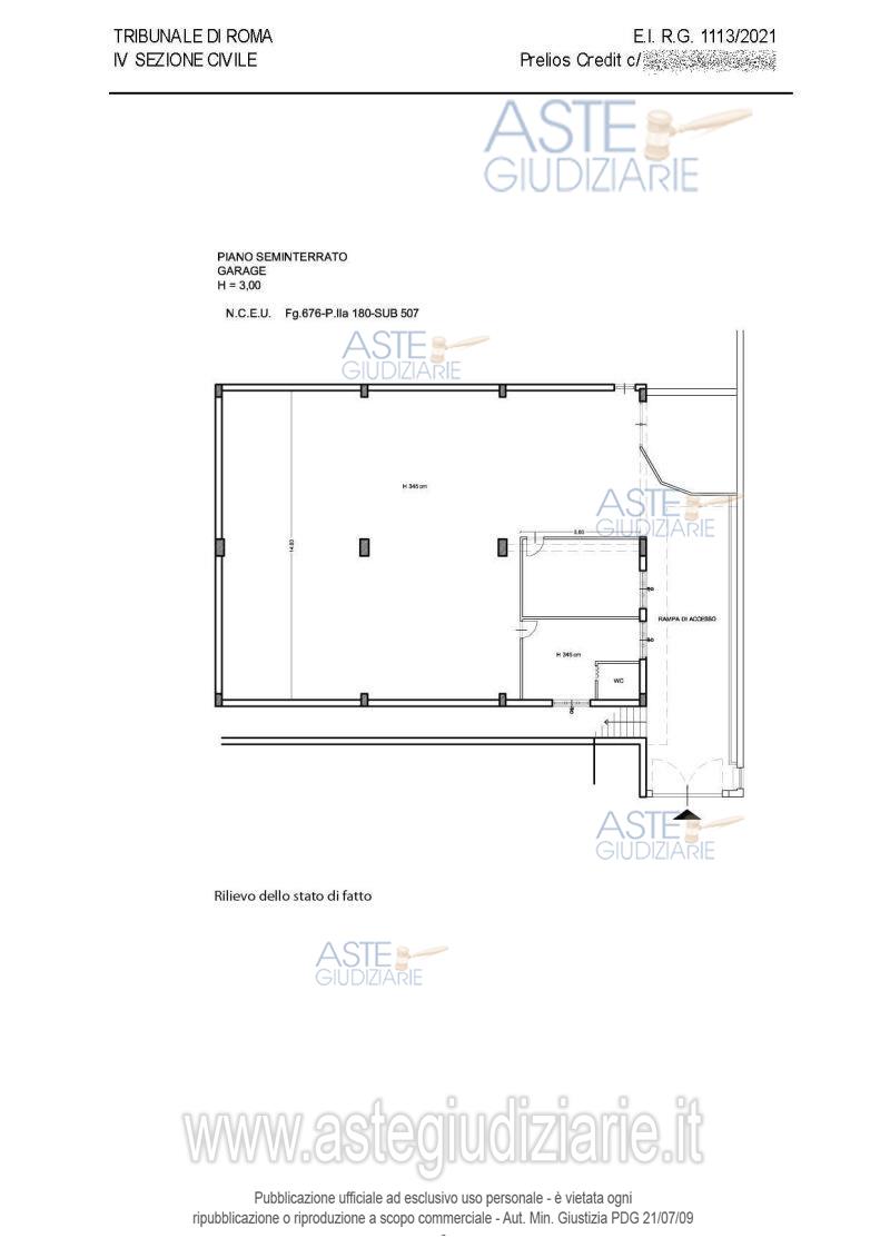 Vendita in attesa dell'emissione del nuovo bando d'asta. LOTTO 02: Quota pari a 100/100 del diritto di proprietà su compendio immobiliare sito in Roma Via Lunano 20C e precisamente:locale garage, posto al piano S1, costituito da un ampio locale a destinazione autorimessa, posto al piano seminterrato collegato tramite una rampa al piano terra, ed una superficie pertinenziale di circa 1.600 mq. Ultimo prezzo base € 99.840,00 (offerta minima € 74.880,00). Giudice Federica D'ambrosio. Professionista delegato alla vendita Avv. Manuela Morbioli. Custode Giudiziario Ivg Di Roma Srl - Email "pvp@visiteivgroma.it"; Tel. 0689569801. Rif. Tribunale di Roma - Esecuzione immobiliare post legge 80 n. 1113/2021