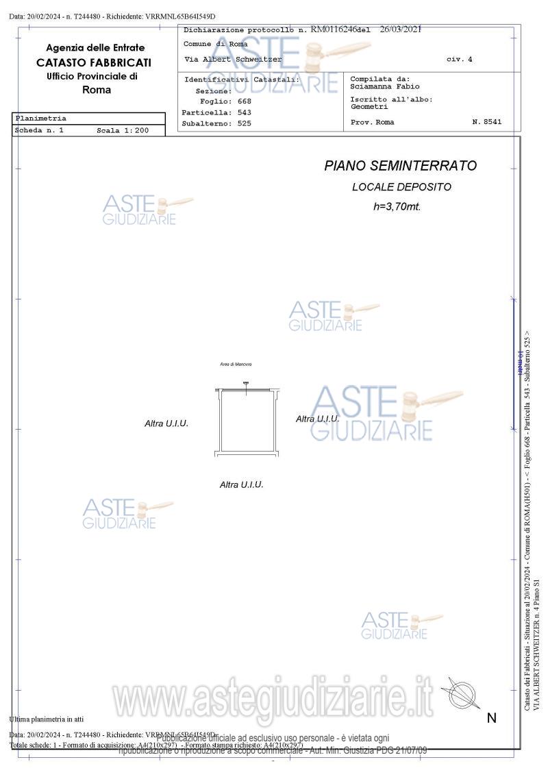 Vendita all'asta Senza incanto, con gara telematica asincrona - LOTTO 9: Quota pari a 1/1 del diritto di superficie su Magazzino ubicato a Roma (RM) - via Albert Schweitzer 4, interno 9, piano S1 Identificato al Catasto Fabbricati del Comune di Roma al foglio 668 part 543 sub 525 zc 6 cat C2 cl 7 sup cast 21 mq RC € 52,99 piano S1.Il magazzino confina con area di manovra, magazzini int.8 e 10, vano scala M salvo altri. Prezzo base € 1.360,00 (offerta minima € 1.020,00). Data inizio operazioni di vendita: 26/03/2026 ore 11:00. Giudice Dott. Raffaele Russo. Professionista delegato alla vendita Not. Cesare Felice Giuliani. Custode Giudiziario Ivg Di Roma Srl - Email "pvp@visiteivgroma.it"; Tel. 0689569801. Rif. Tribunale di Roma - Esecuzione immobiliare post legge 80 n. 1090/2022