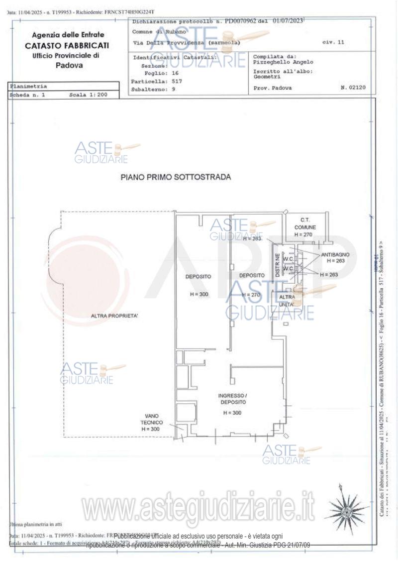 Vendita all'asta Senza incanto, con gara telematica sincrona - LOTTO 2: Lotto 2 - piena proprietà di unità immobiliare ad uso magazzino/deposito, facente parte del fabbricato condominiale sito in Comune di Rubano (PD), località Sarmeola, via Della Provvidenza con ingresso dai civici nn. 13 e 15 e precisamente consiste in un magazzino/deposito al piano interrato (altezza interna variabile da mt. 2,70 a mt. 3,00), suddiviso in più locali, completo di due W.C. con antibagno, per una superficie commerciale di mq. 270. Occupato con titolo. Prezzo base € 103.600,00 (offerta minima € 77.700,00). Data vendita 21/04/2026 ore 10:00. Giudice Rossi. Professionista delegato alla vendita Not. Michelangelo Casciano - Email "aste@apepnotai.it"; Tel. 049651228. Custode Giudiziario Apep - Email "visita@apepnotai.it"; Tel. 049651228. Rif. Tribunale di Padova - Espropriazione immobiliare (cartabia) n. 36/2025