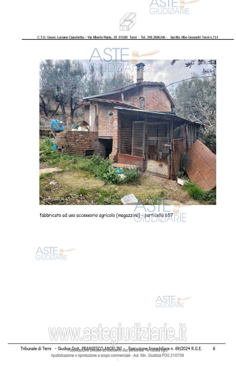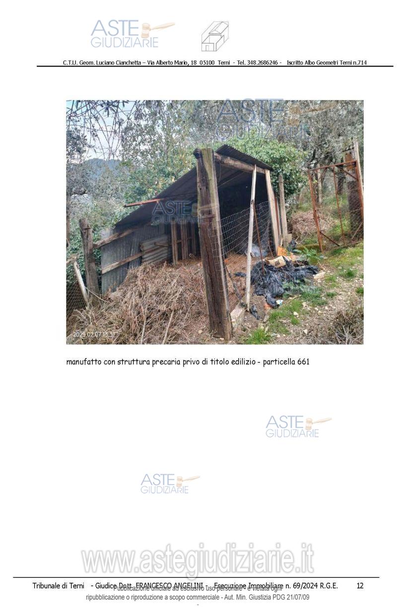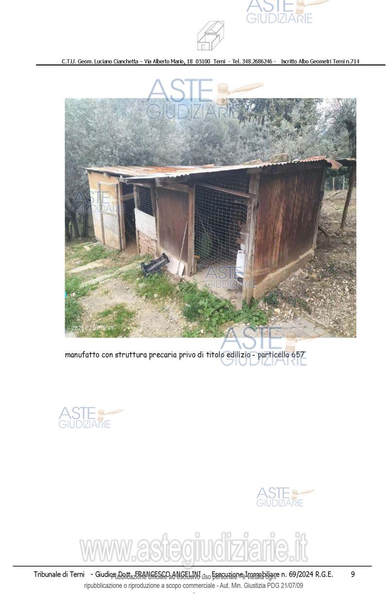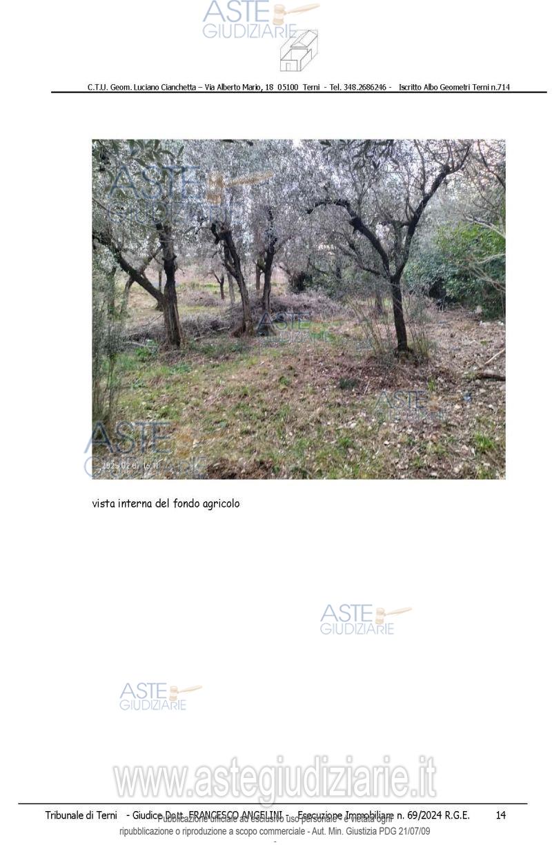 Vendita all'asta Senza incanto, con gara telematica asincrona - LOTTO 2: piena proprietà di rate di terreno agricolo e sovrastanti fabbricati/manufatti, che formano un unico appezzamento delimitato da recinzioni, accessibile da strada comunale di Toano e da altra strada gravata da servitù di passaggio il tutto meglio dettagliato nella perizia alla quale si rimanda. Prezzo base € 9.820,00 (offerta minima € 7.365,00). Data inizio operazioni di vendita: 15/04/2026 ore 14:15. Giudice Francesco Angelini. Professionista delegato alla vendita Avv. Emiliano Strinati - Email "clericostrinati.studio@gmail.com"; Tel. 0744432001. Custode Giudiziario Avv. Emiliano Strinati - Email "clericostrinati.studio@gmail.com"; Tel. 0744432001. Rif. Tribunale di Terni - Espropriazione immobiliare (cartabia) n. 69/2024