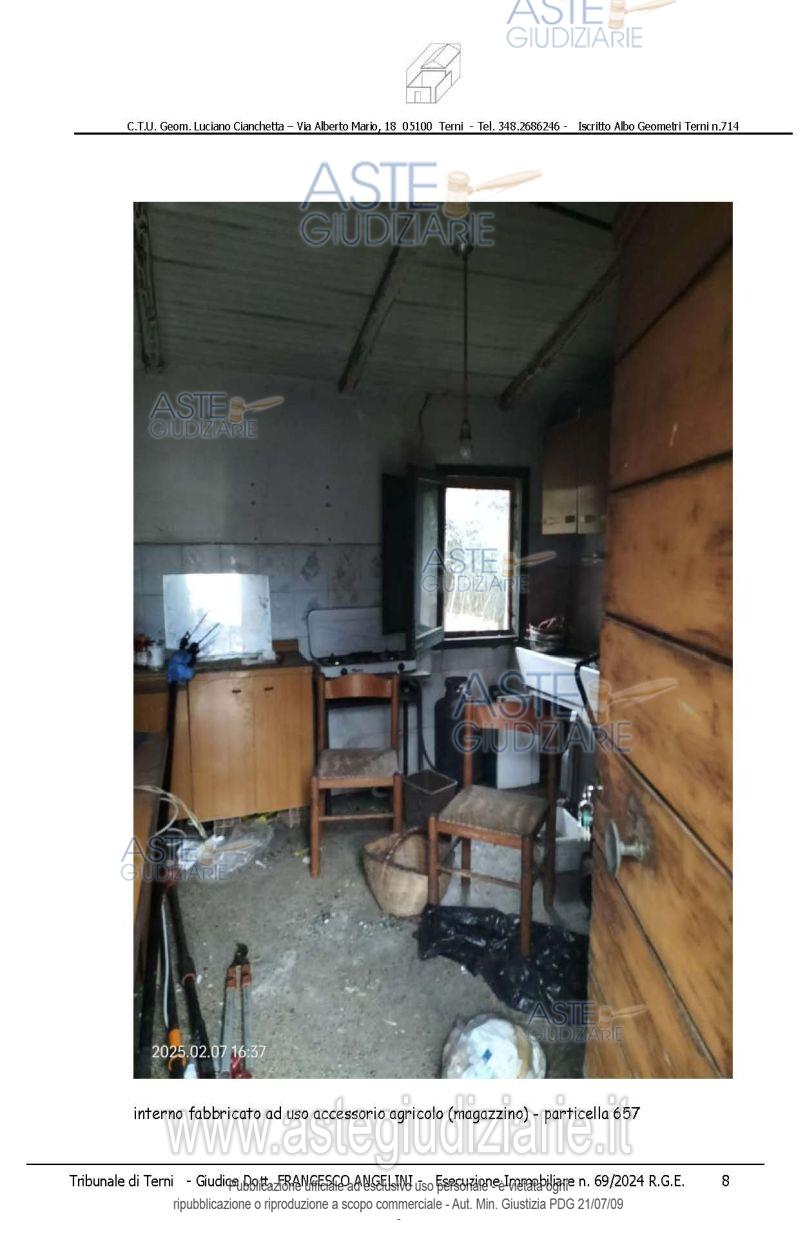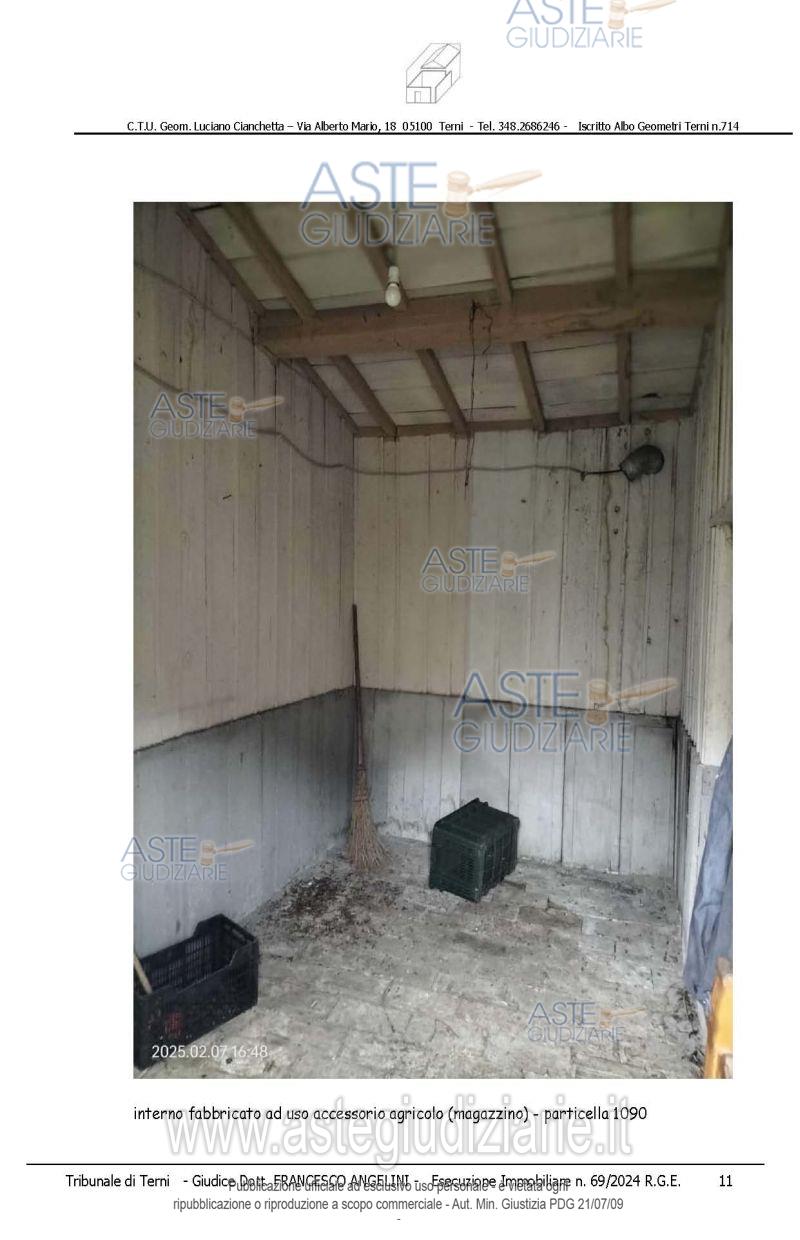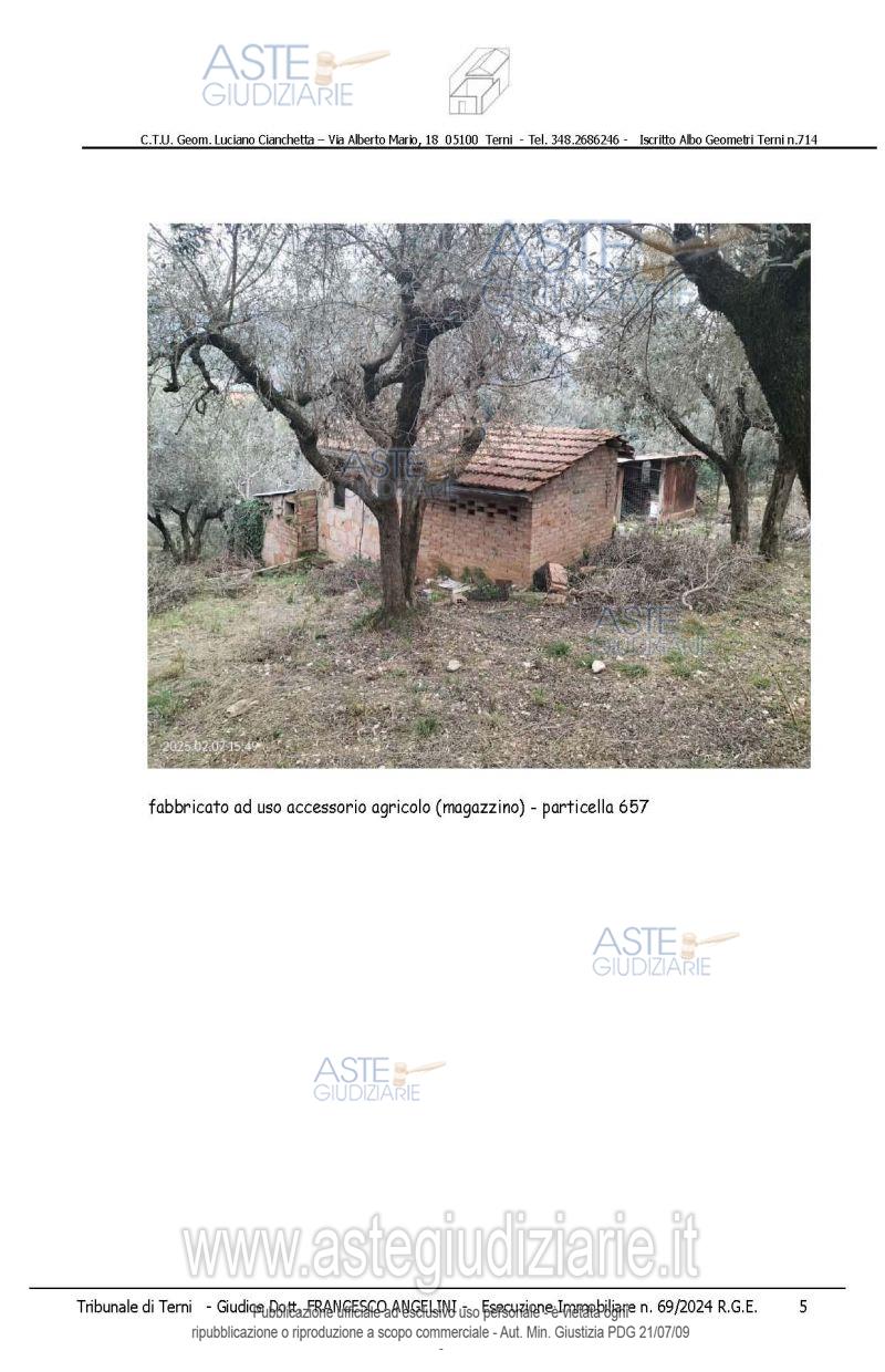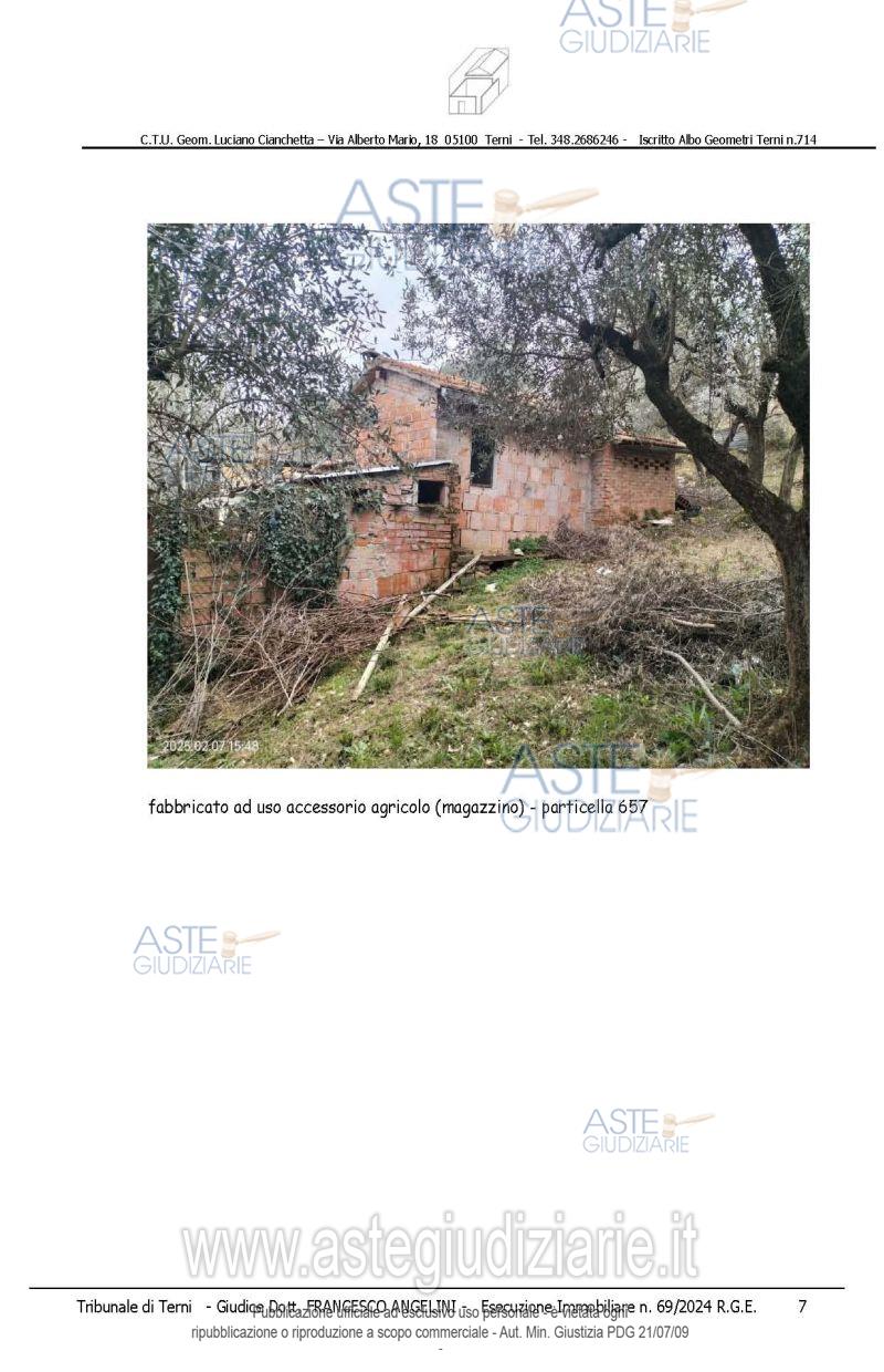 Vendita all'asta Senza incanto, con gara telematica asincrona - LOTTO 2: piena proprietà di rate di terreno agricolo e sovrastanti fabbricati/manufatti, che formano un unico appezzamento delimitato da recinzioni, accessibile da strada comunale di Toano e da altra strada gravata da servitù di passaggio il tutto meglio dettagliato nella perizia alla quale si rimanda. Prezzo base € 9.820,00 (offerta minima € 7.365,00). Data inizio operazioni di vendita: 15/04/2026 ore 14:15. Giudice Francesco Angelini. Professionista delegato alla vendita Avv. Emiliano Strinati - Email "clericostrinati.studio@gmail.com"; Tel. 0744432001. Custode Giudiziario Avv. Emiliano Strinati - Email "clericostrinati.studio@gmail.com"; Tel. 0744432001. Rif. Tribunale di Terni - Espropriazione immobiliare (cartabia) n. 69/2024