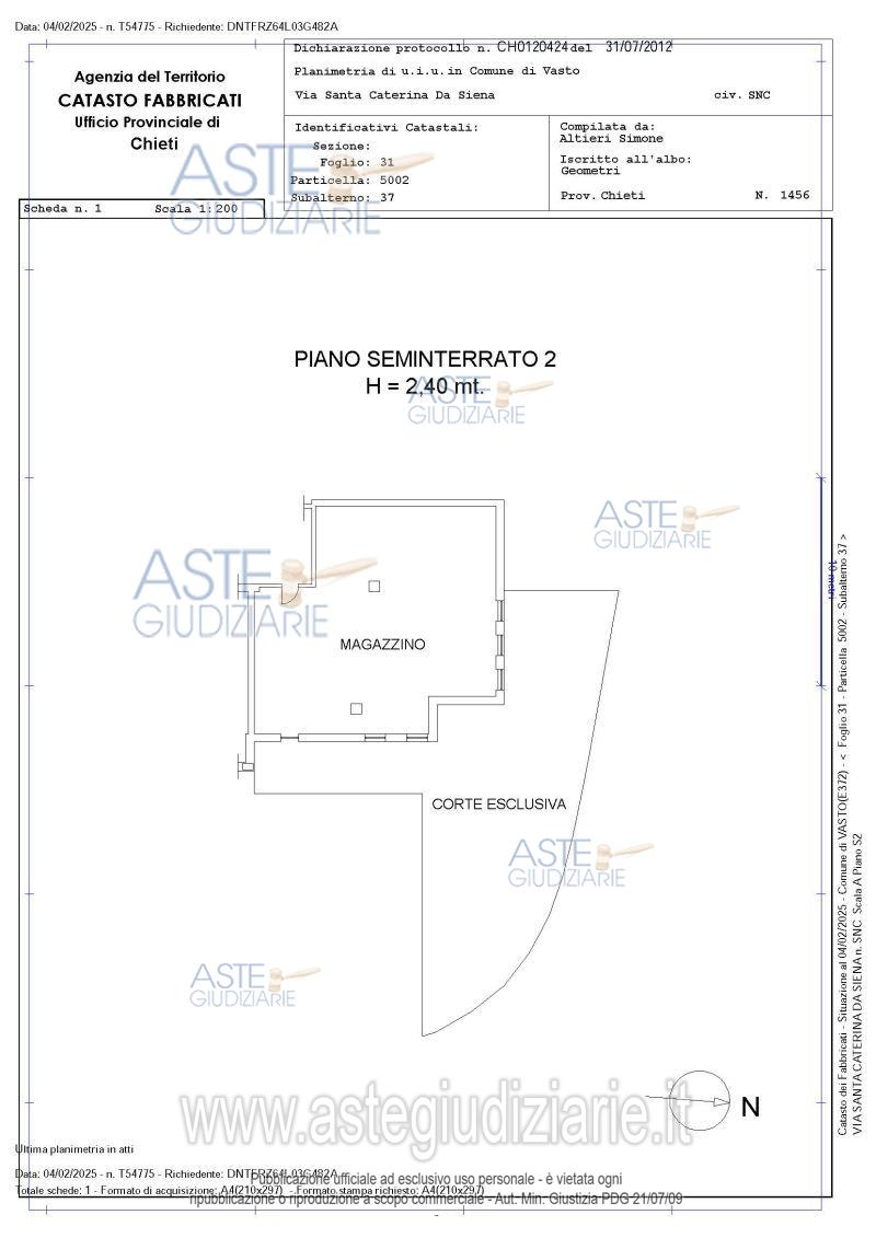 Vendita all'asta Senza incanto, con gara telematica asincrona - LOTTO 6: Full ownership rights of the warehouse in its raw state of 137 square meters cadastral on the S2 floor with exclusive courtyard, accessible both from the condominium entrance on the S2 floor of the main building at via Santa Caterina da Siena n.110, Building A, and from the external east side. Prezzo base € 41.100,00 (offerta minima € 41.100,00). Data inizio operazioni di vendita: 23/10/2025 ore 11:00. In caso di più offerte valide si procederà a gara che inizierà il 23/10/2025 ore 11:00 e terminerà il 30/10/2025 ore 12:00. Giudice Dott. Elio Bongrazio. Curatore Dott. Luca Cosentino. Rif. Tribunale di Pescara - Fallimentare (nuovo rito) n. 1/2024