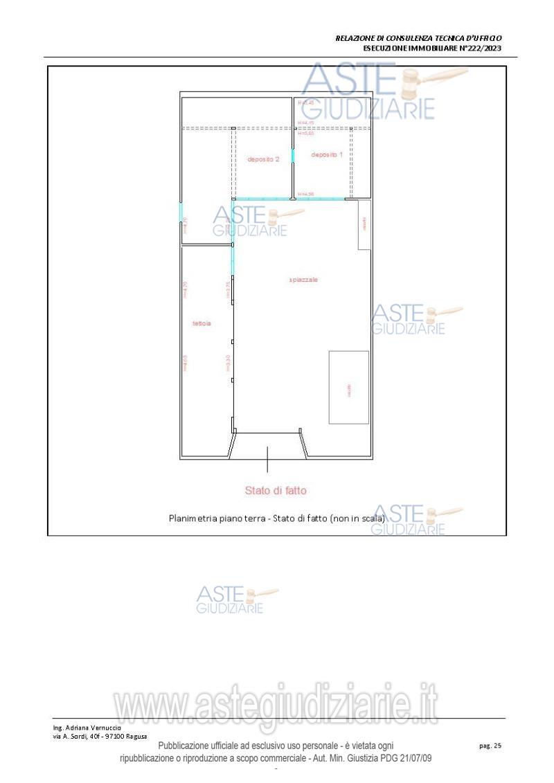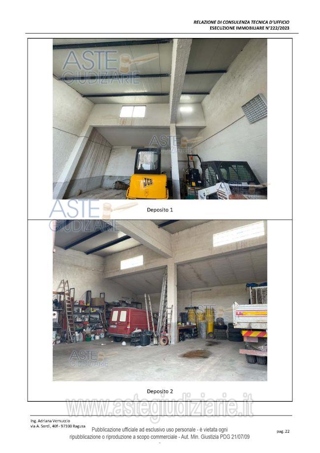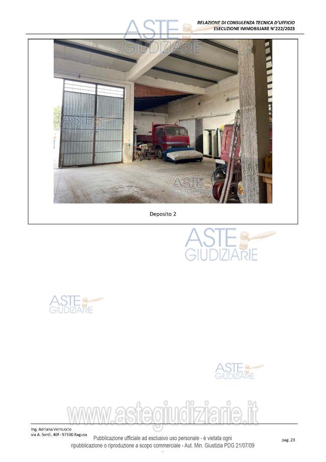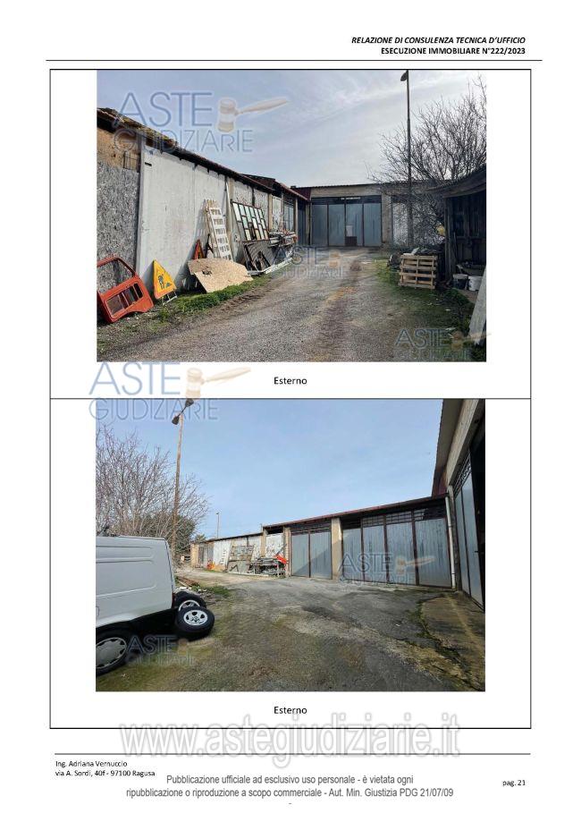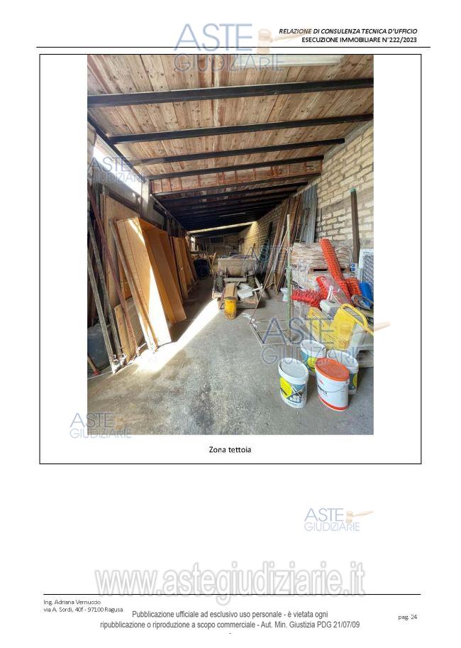 Vendita all'asta Senza incanto, con gara telematica sincrona mista - LOTTO 2: Tettoia adibita a ricovero attrezzi di circa 426 metri quadrati. Prezzo base € 27.844,00 (offerta minima € 20.883,00). Data vendita 22/04/2026 ore 16:00. Giudice Carlo Di Cataldo. Professionista delegato alla vendita Dott. Epifanio Massimo Bua - Email "epifaniobua@yahoo.it". Custode Giudiziario Dott. Epifanio Massimo Bua - Email "epifaniobua@yahoo.it". Rif. Tribunale di Ragusa - Espropriazione immobiliare (cartabia) n. 222/2023
