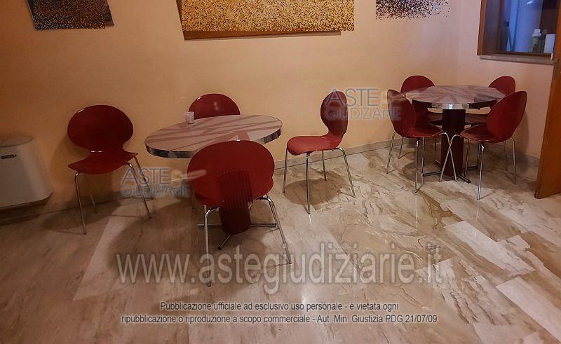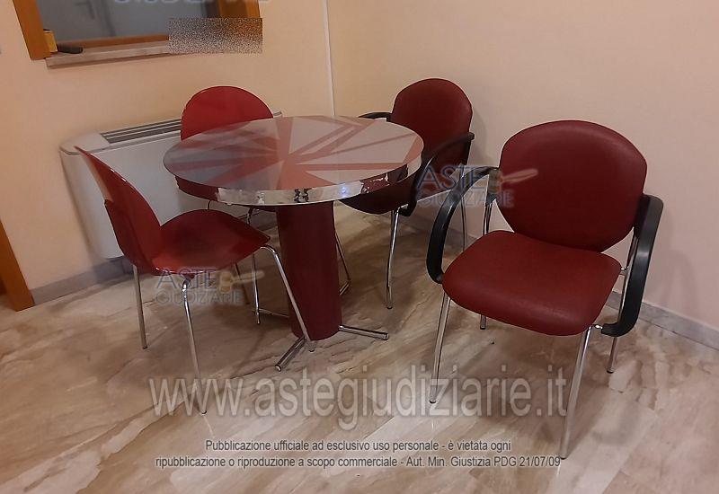 Vendita all'asta Senza incanto, con gara telematica asincrona - LOTTO 143: Si rinvengono n. 3 tavoli rotondi rivestiti in plastica; n. 12 sedie in plexiglass di cui n. 2 con braccioli di