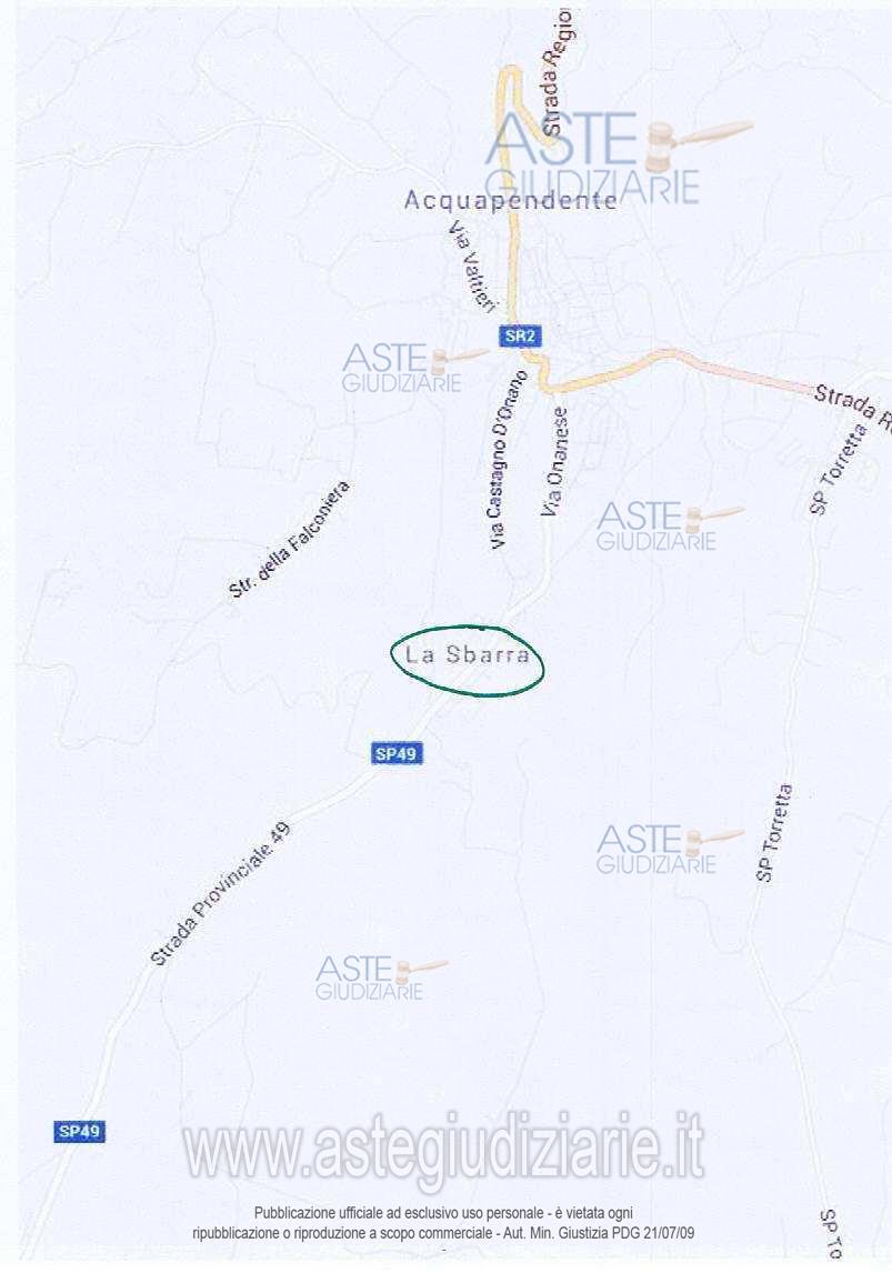 Vendita all'asta Senza incanto, con gara telematica asincrona - LOTTO 1: Piena proprietà dei seguenti immobili siti nel Comune di Acquapendente (VT) in località “La Sbarra”:1 - un immobile, già adibito parte a ristorante, parte a negozio e parte per la lavorazione delle carni, 2 - una tettoia aperta Gli immobili di cui al punto 1 e 2 hanno in comune un’area di pertinenza Nella vendita sono comprese le aree di sedime dei fabbricati 3 - un terreno parte agricolo e parte edificabile . Prezzo base € 69.294,00 (offerta minima € 51.970,25). Data inizio operazioni di vendita: 03/06/2026 ore 11:00. Professionista delegato alla vendita Dott. Cristiana Maurizi - Email "dott.maurizi@gmail.com"; Tel. 0761270186. Custode Giudiziario Dott. Cristiana Maurizi - Email "dott.maurizi@gmail.com"; Tel. 0761270186. Rif. Tribunale di Viterbo - Esecuzione immobiliare post legge 80 n. 185/2013