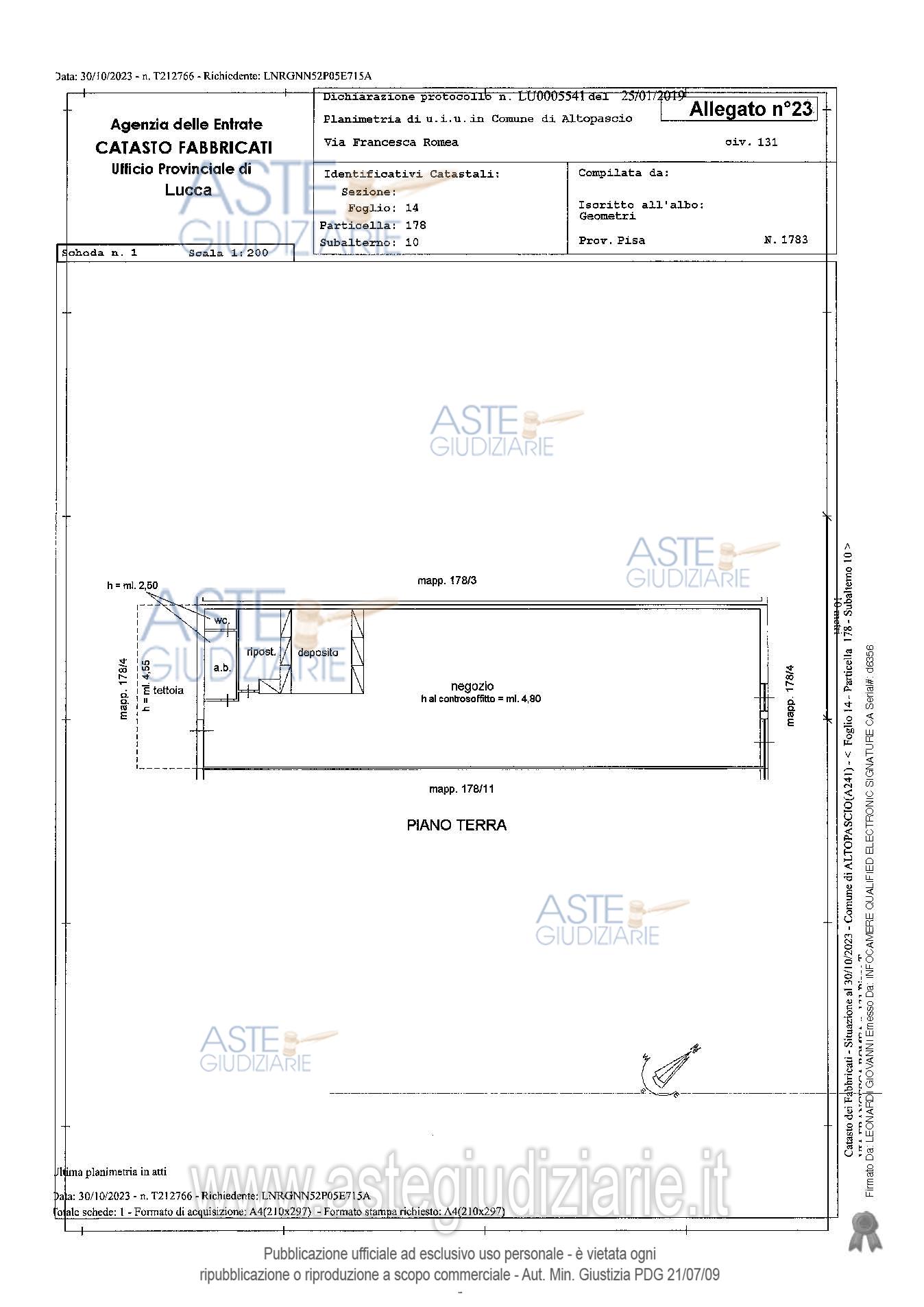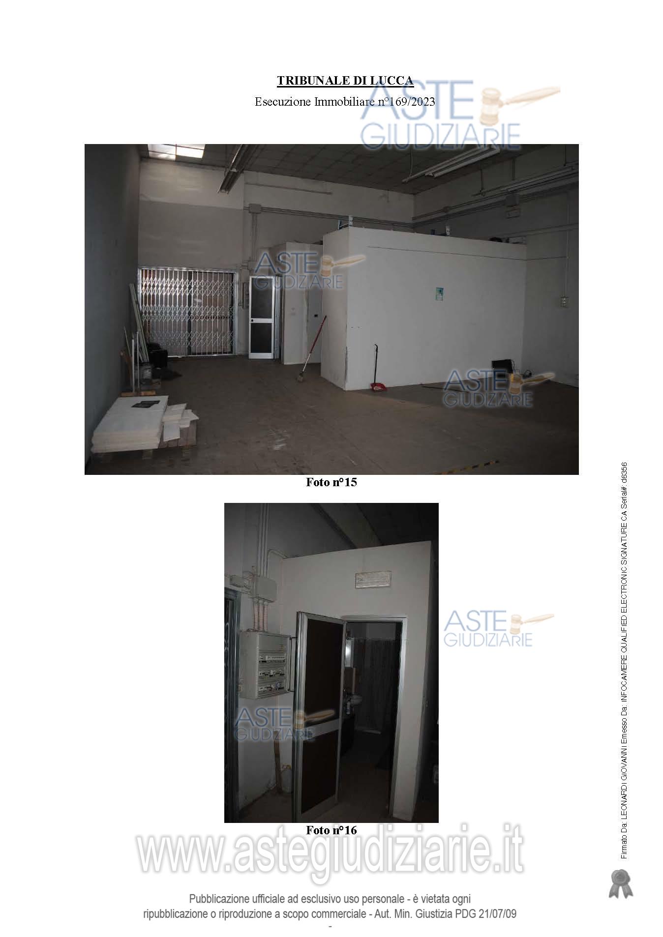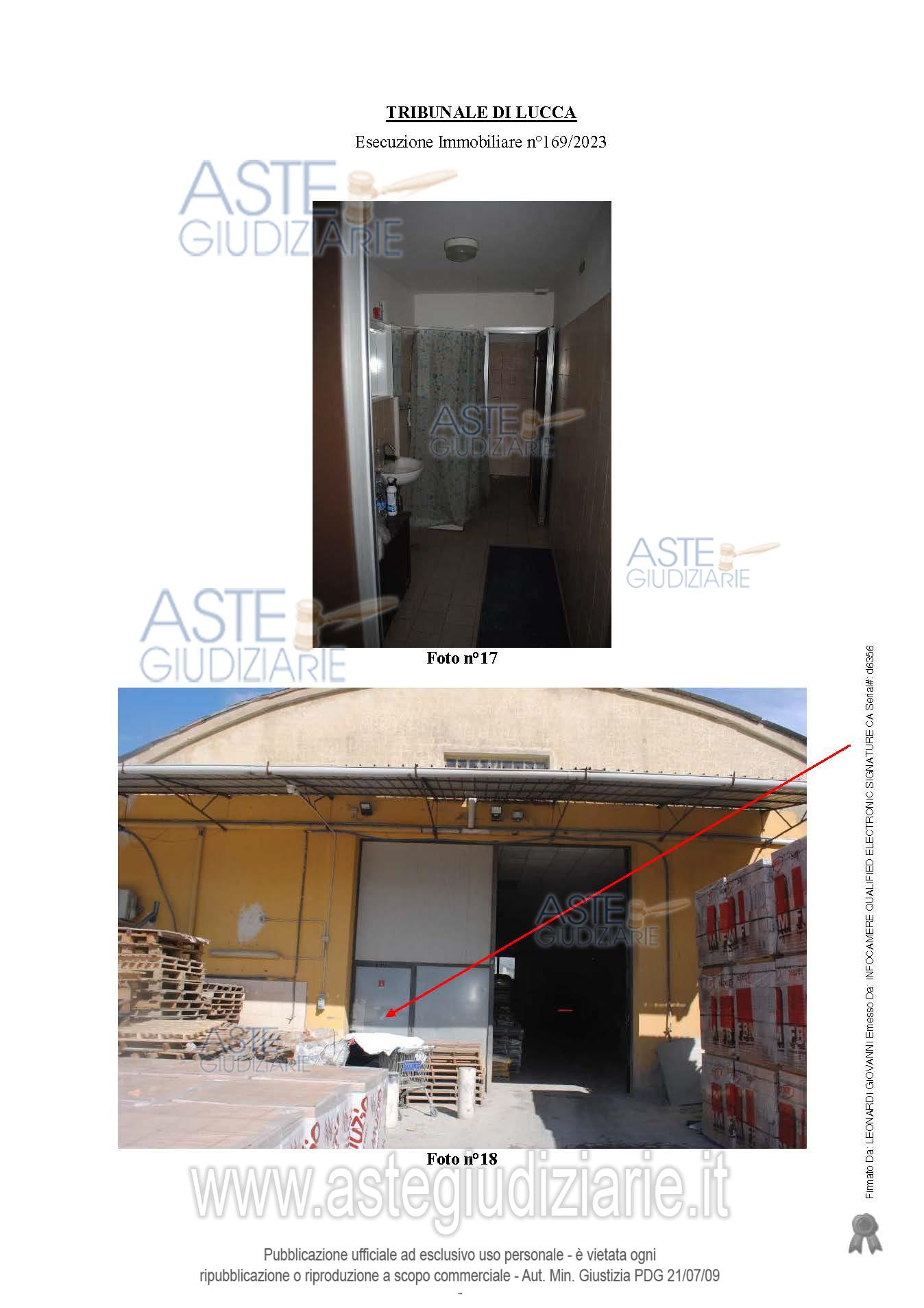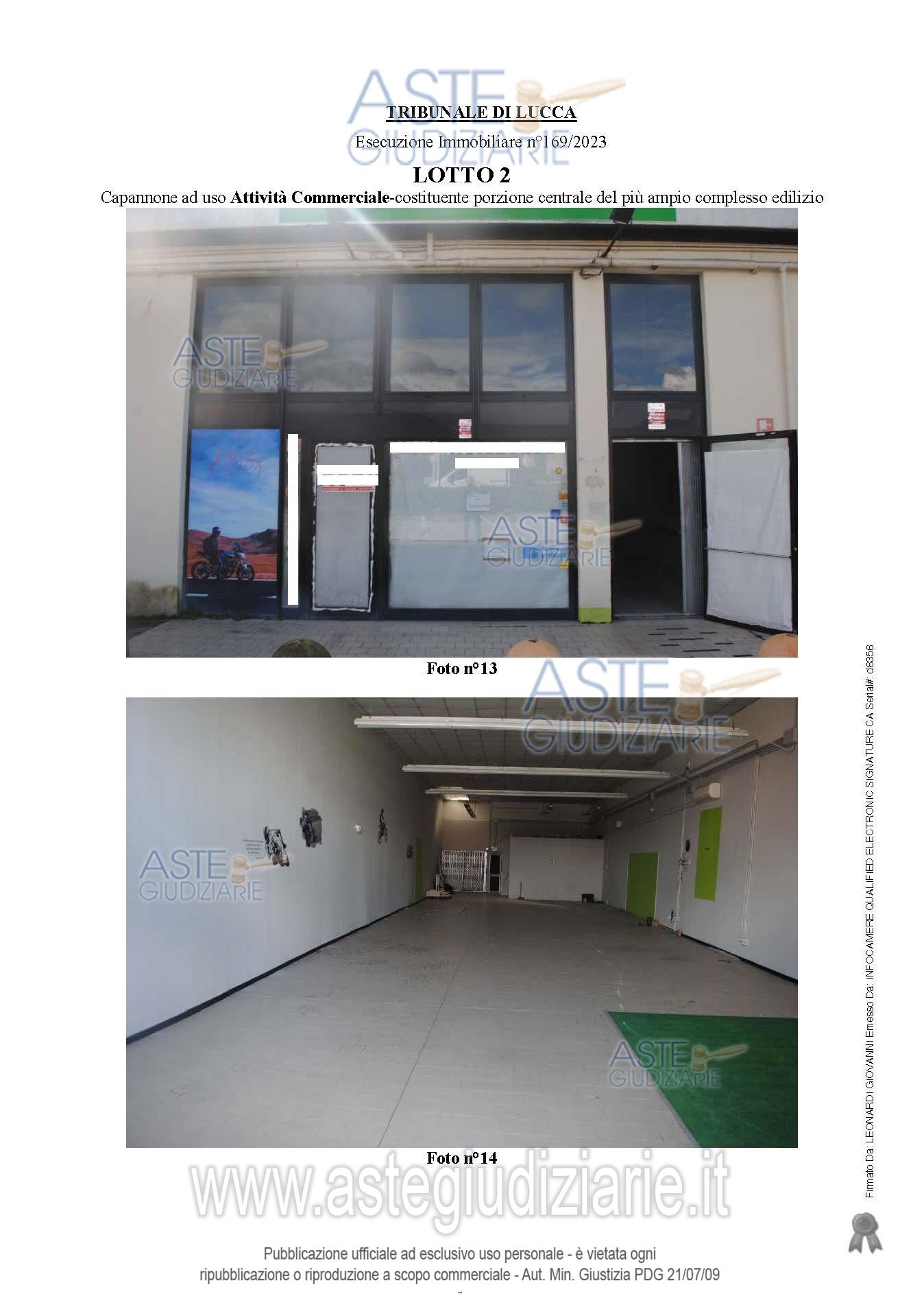 Vendita all'asta Senza incanto, con gara telematica sincrona mista - LOTTO 2: LOTTO DUE. La piena proprietà per la quota di 1/1 su capannone ad uso Attività Commerciale, costituente porzione centrale del più ampio complesso edilizio con varie destinazioni, incastrato ai capannoni descritti al LOTTO 1 e al LOTTO 3, posto nel Comune di ALTOPASCIO (LU), Via Francesca Romea n.131. Prezzo base € 53.865,00 (offerta minima € 40.398,75). Data vendita 20/01/2026 ore 10:00. Professionista delegato alla vendita Avv. Mario Del Bianco - Email "avv.mariodelbianco@gmail.com"; Tel. 0583490838. Custode Giudiziario Ivg Lucca - Sofir Srl - Email "custodieivg@gmail.com"; Tel. 0583418555. Rif. Tribunale di Lucca - Espropriazione immobiliare (cartabia) n. 169/2023