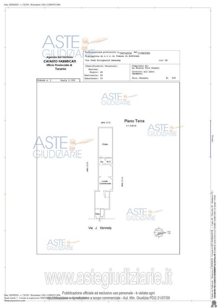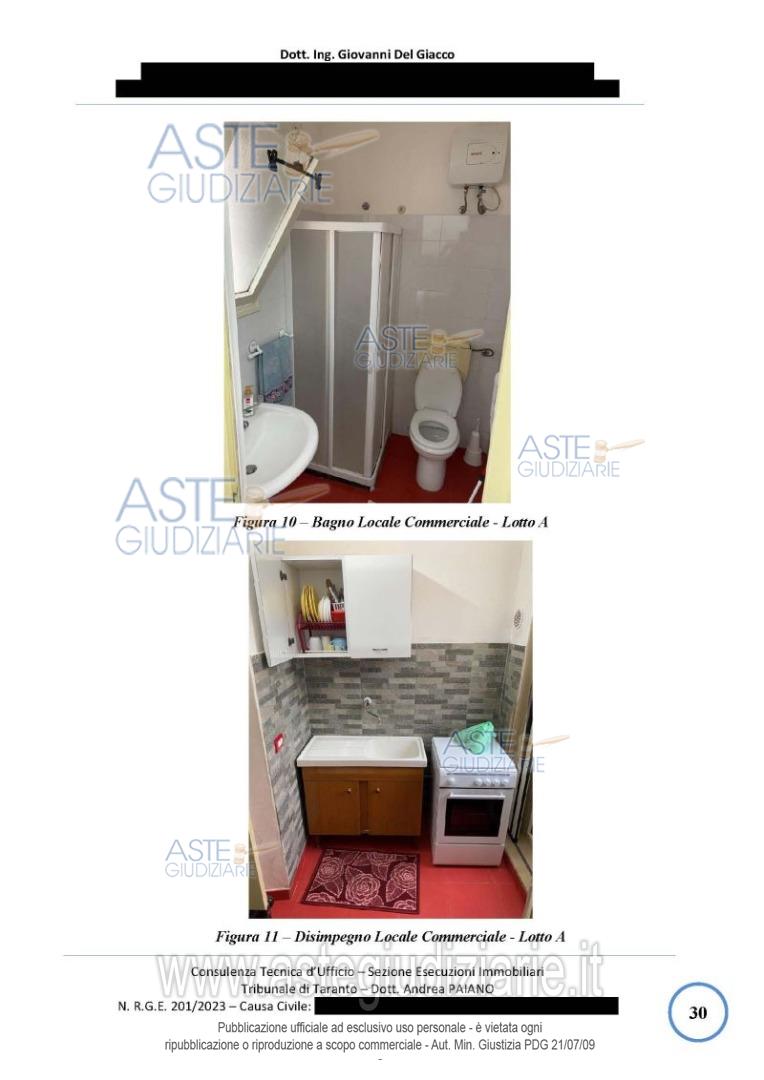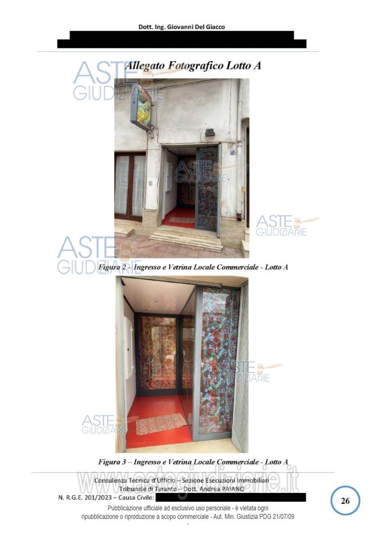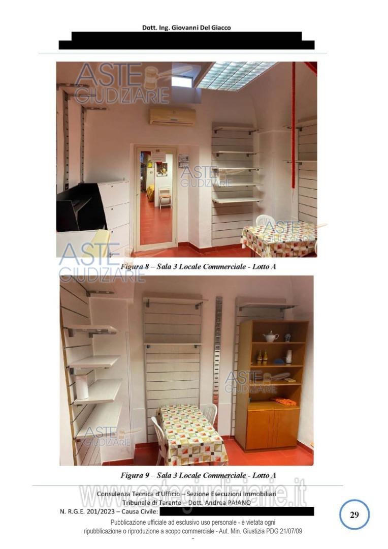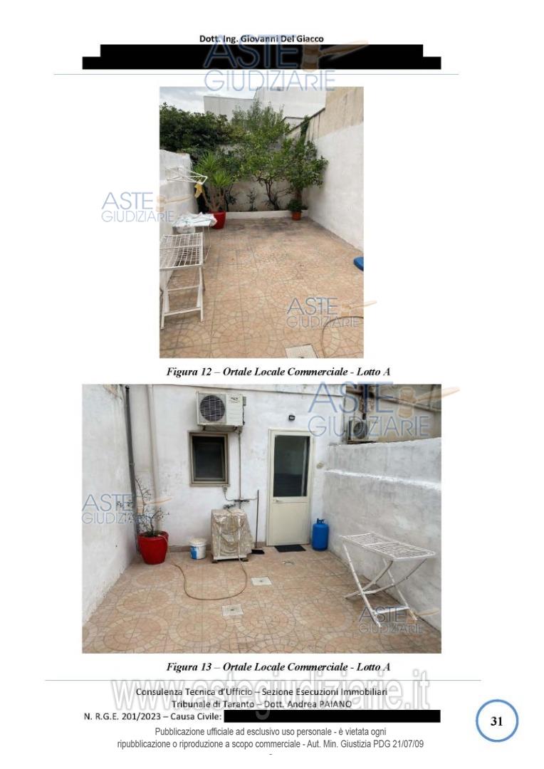 Vendita in attesa dell'emissione del nuovo bando d'asta. LOTTO 1: LOTTO 1 (lotto A di perizia): Piena proprietà di un locale commerciale al piano terra suddiviso in ingresso, vetrina, area espositiva 1, area espositiva 2, area espositiva 3, disimpegno, WC e cortile di pertinenza con con un ortale esclusivo di circa 30mq. Ultimo prezzo base € 18.140,62 (offerta minima € 13.605,46). Giudice Andrea Paiano. Professionista delegato alla vendita Avv. Fabiana Miraglia - Email "avvfabianamiraglia@gmail.com"; Tel. 099-4533500. Custode Giudiziario Ivg Taranto - Email "ivgta.visiteimmobili@gmail.com". Rif. Tribunale di Taranto - Esecuzione immobiliare post legge 80 n. 201/2023