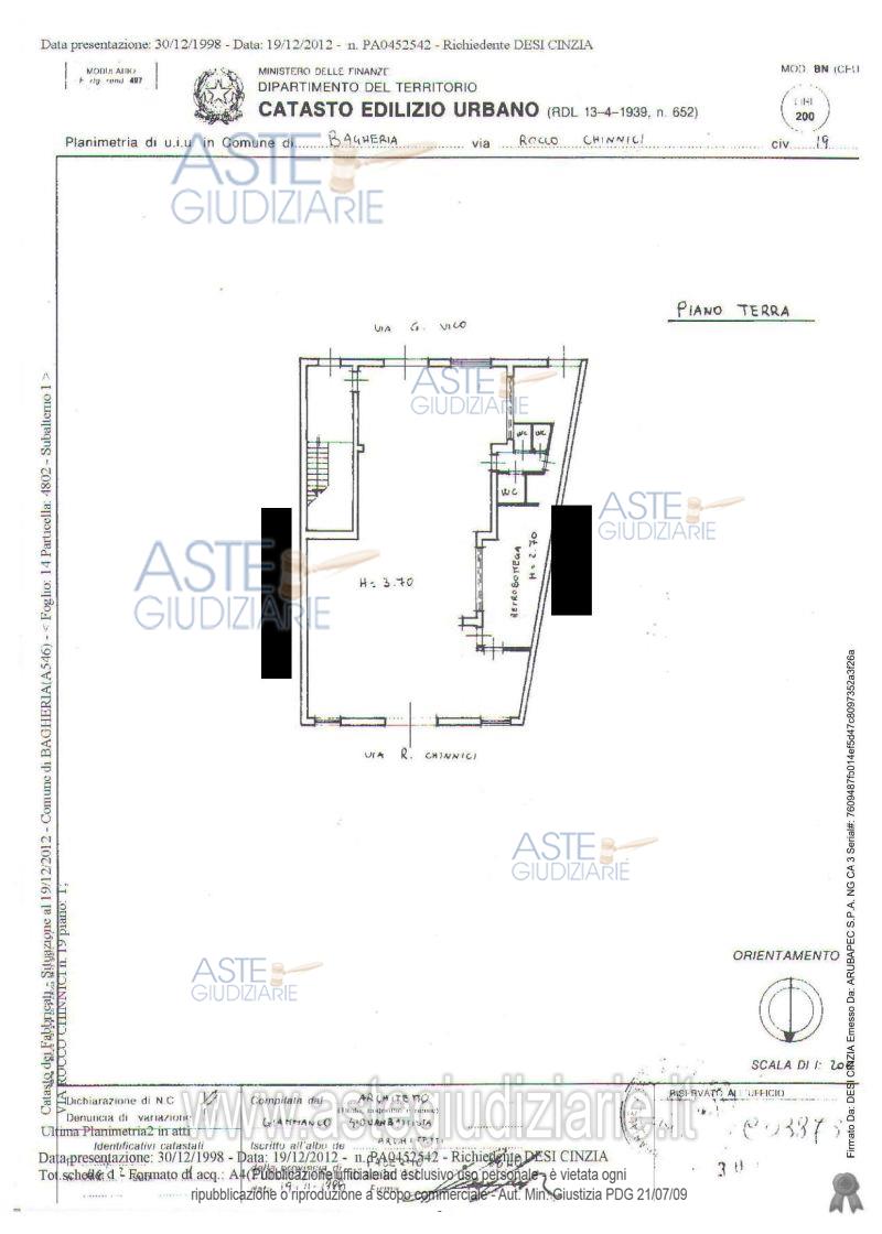 Vendita all'asta Senza incanto, con gara telematica sincrona mista - LOTTO UNICO: diritto di piena proprietà di un locale esteso mq. 182, adibito a ristorazione, sito a Bagheria in via Rocco Chinnici n.19, piano terra, composto da una grande sala ristorazione, un locale cucina ed un gruppo w.c. In catasto al Comune di Bagheria, partita 1012896, foglio 14, particella 4802, sub.1, Via Rocco Chinnici, 19 P.T. cat. C/1, Classe 6, cons. 162, sup. cat. 182 mq., rendita € 3.053,81. Prezzo base € 100.415,00 (offerta minima € 75.311,25). Data vendita 29/10/2025 ore 13:30. Professionista delegato alla vendita Avv. Daniele Fresta - Email "videcadeleghe@gmail.com"; Cell. 3517658698; Tel. 0917285446. Custode Giudiziario Avv. Daniele Fresta - Email "videcadeleghe@gmail.com"; Cell. 3517658698; Tel. 0917285446. Rif. Tribunale di Palermo - Esecuzione immobiliare post legge 80 n. 291/2005