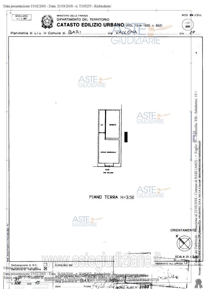 Vendita all'asta Senza incanto, con gara telematica asincrona - LOTTO UNICO: Piena e perfetta proprietà del locale commerciale ubicato al piano terra del maggior fabbricato con accesso dalla via Vallona n. 27, composto di un vano, disimpegno e bagno. Prezzo base € 44.285,00 (offerta minima € 44.285,00). Data inizio operazioni di vendita: 13/01/2026 ore 10:00. In caso di più offerte valide si procederà a gara che inizierà il 13/01/2026 ore 10:00 e terminerà il 20/01/2026 ore 12:00. Giudice Dott. Michele De Palma. Curatore Avv. Cinzia Capano - Tel. 080 5214992. Rif. Tribunale di Bari - Fallimentare (nuovo rito) n. 15/2017