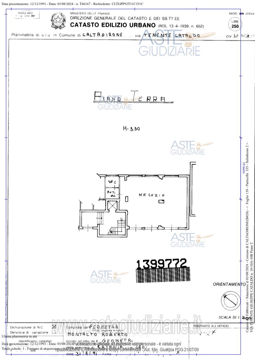 Vendita all'asta Senza incanto, con gara telematica sincrona mista - LOTTO UNICO: Negozio al piano T sito in Caltagirone (CT), via Tenente Cataldo nn. 12-12a-12b, identificato al Catasto Fabbricati al foglio 139, particella 535, sub 2, categoria C/1, classe 5, consistenza 102 mq, rendita € 1.475,00. L'immobile si sviluppa su un'unica elevazione al piano terra ed è composto da una sala unica, un wc e un anti wc. Non è dotato di impianto di riscaldamento. La superficie interna calpestabile è pari a 95 mq. La superficie commerciale è pari a 110 mq. Prezzo base € 61.312,50 (offerta minima € 45.984,37). Data vendita 17/04/2026 ore 18:30. Giudice Agata Maria Patrizia Cavallaro. Professionista delegato alla vendita Avv. Graziella Randazzo - Email "graziellarandazzo@libero.it"; Cell. 3386143968; Tel. 0933339751. Custode Giudiziario Avv. Graziella Randazzo - Email "graziellarandazzo@libero.it"; Cell. 3386143968; Tel. 0933339751. Rif. Tribunale di Caltagirone - Esecuzione immobiliare post legge 80 n. 6/2024