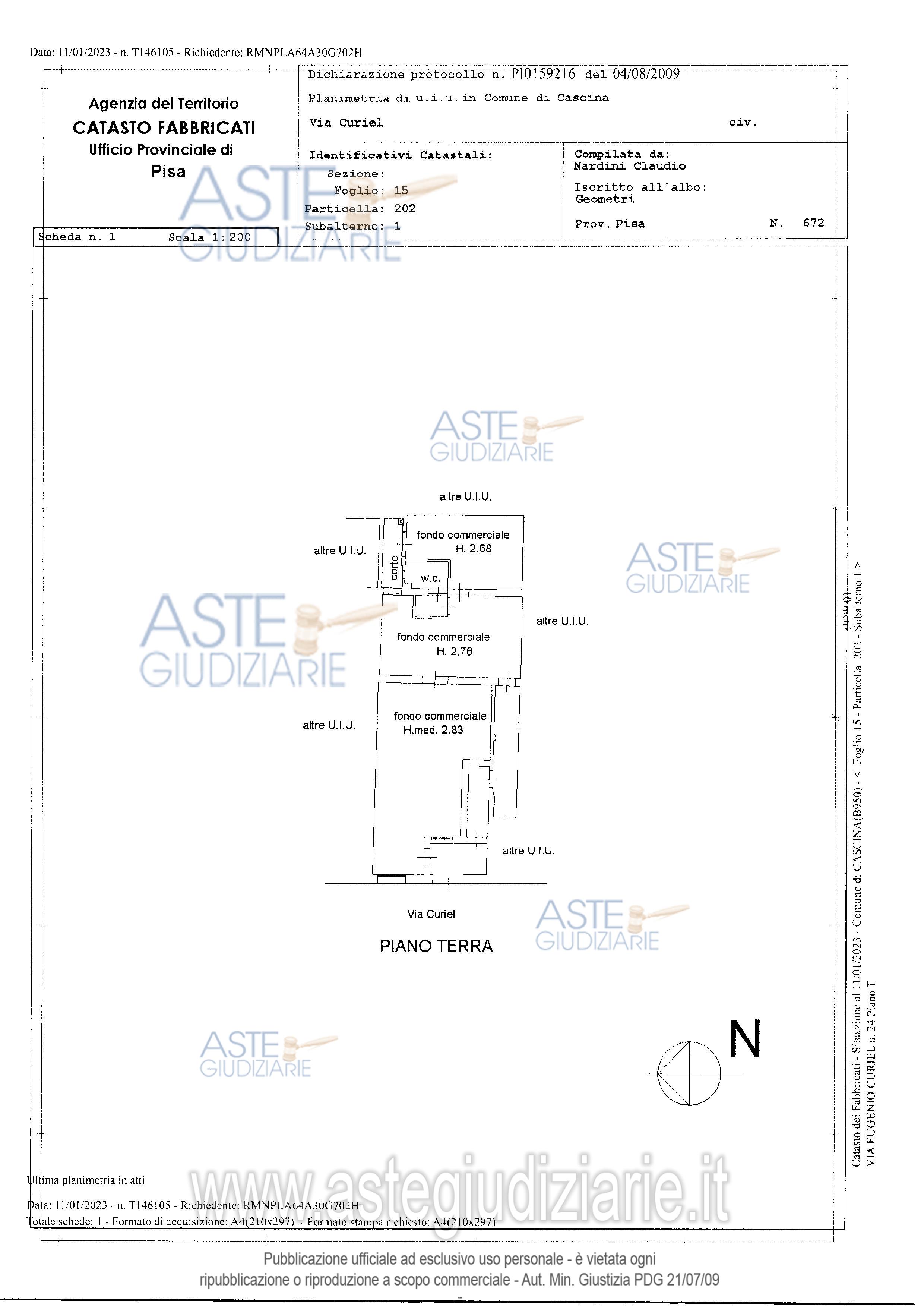 Vendita all'asta Senza incanto, con gara telematica asincrona - LOTTO 2: Fondo ad uso commerciale in Cascina (PI), Via Curiel n. 26. Superficie lorda mq. 111 circa. Composto da ingresso, vano commerciale, due vani ad uso magazzino, servizio igienico e piccola chiostra. Prezzo base € 31.324,21 (offerta minima € 23.493,16). Data inizio operazioni di vendita: 16/12/2025 ore 15:00. Rif. Tribunale di Pisa - Volontaria giurisdizione n. 1505/2018