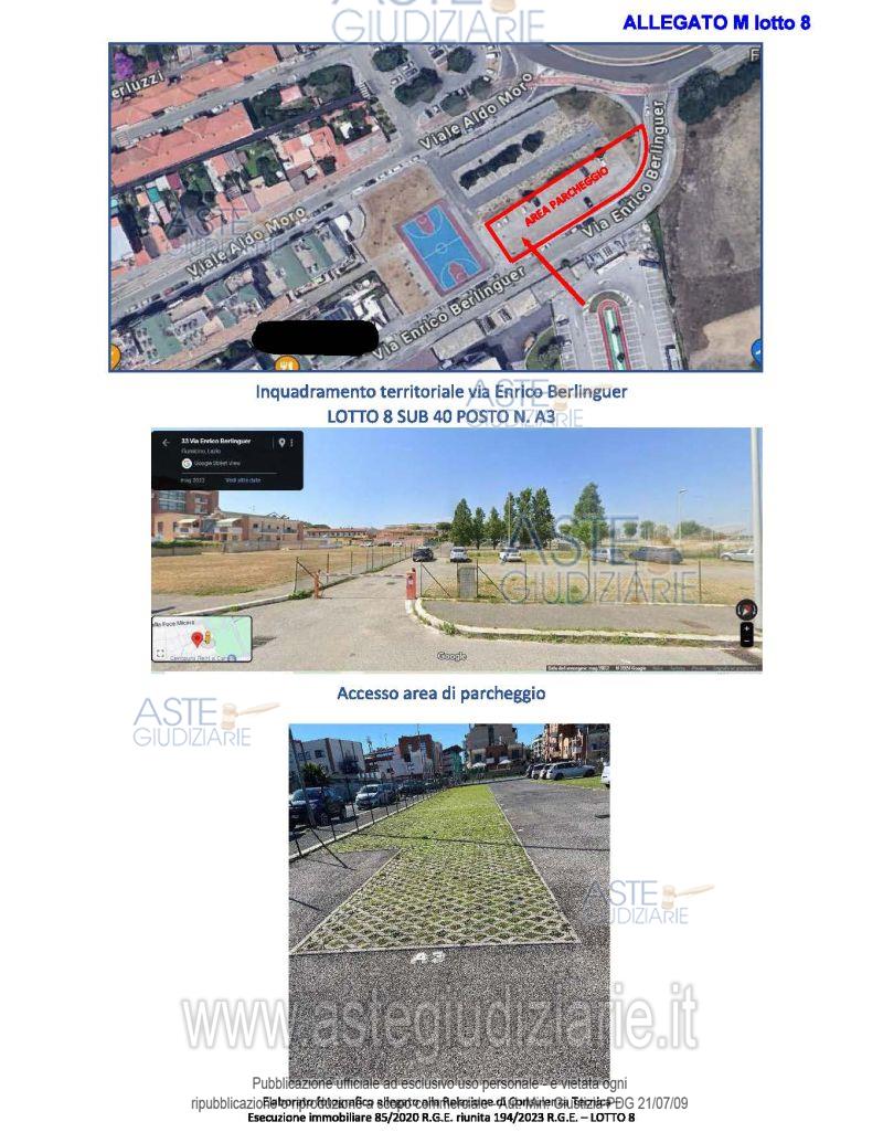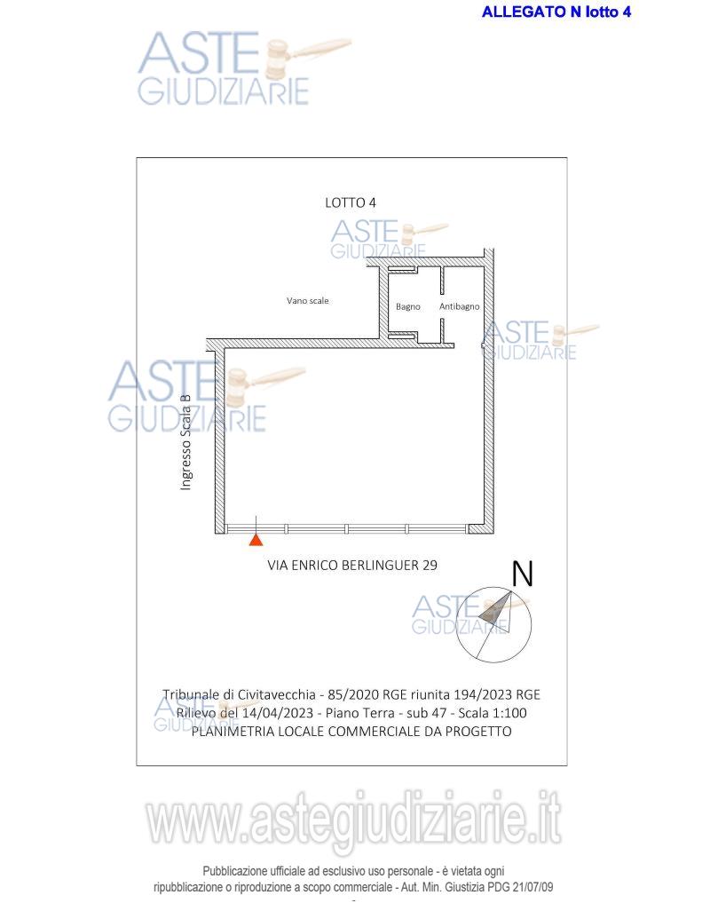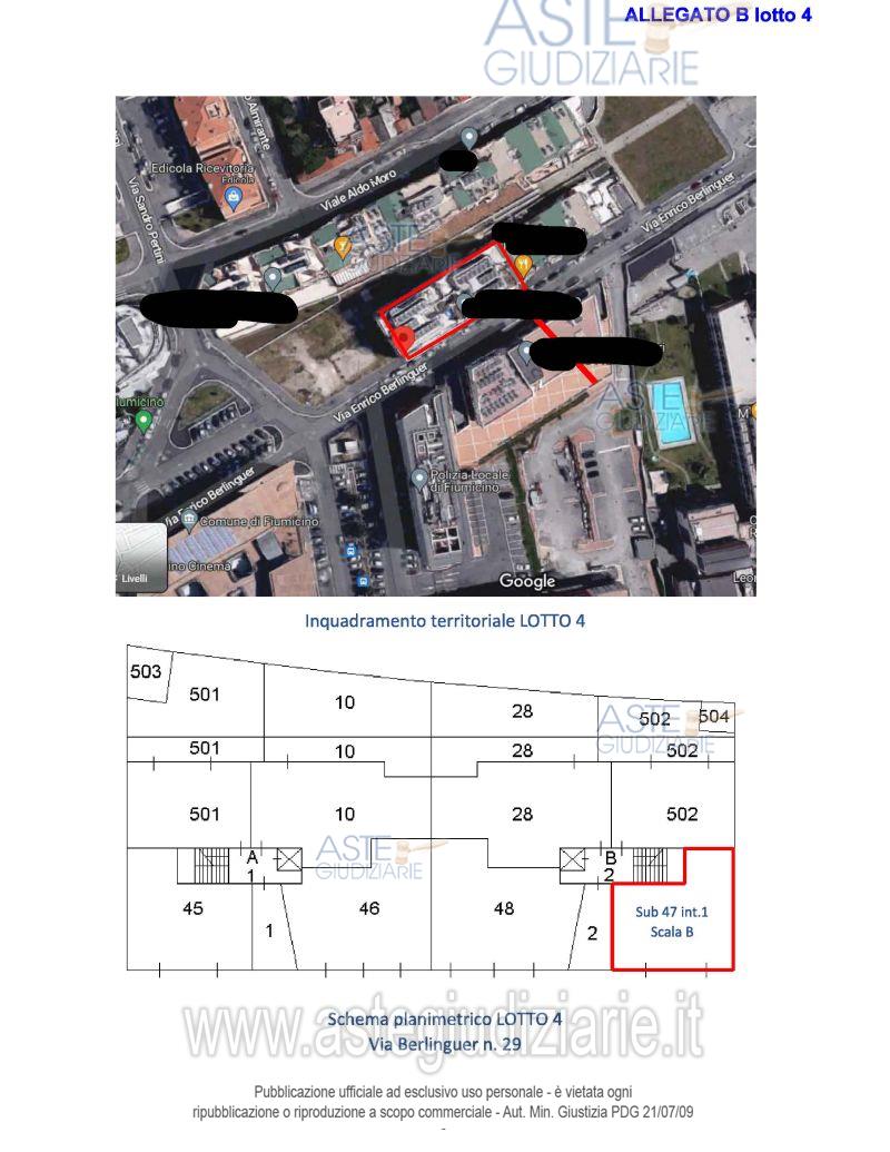 Vendita all'asta Senza incanto, con gara telematica asincrona - LOTTO 4: LOTTO 4: locale commerciale nel Comune di Fiumicino, via Enrico Berlinguer n.29,P.T. scala “B” int. 1,cons.49 mq, sup.cat. tot. 54 mq, l’immobile presenta due vetrine poste sulla Via di cui una destinata all’accesso al locale. LOTTO 8: posto auto scoperto in via Enrico Berliguer snc al P.T. cons. 12 mq, sup. cat.12 mq, il posto auto è all’interno di un’area condominiale. Per la completa descrizione degli immobili sia rinvia alla relazione di consulenza tecnica ed agli allegati del CTU incaricato. Prezzo base € 69.000,00 (offerta minima € 51.750,00). Data inizio operazioni di vendita: 23/03/2026 ore 16:00. Giudice Stefano Palmaccio. Professionista delegato alla vendita Avv. Isabella Calderai - Email "isabellacalderai@gmail.com"; Tel. 3208106971. Custode Giudiziario Avv. Isabella Calderai - Email "isabellacalderai@gmail.com"; Tel. 3208106971. Rif. Tribunale di Civitavecchia - Esecuzione immobiliare post legge 80 n. 85/2020