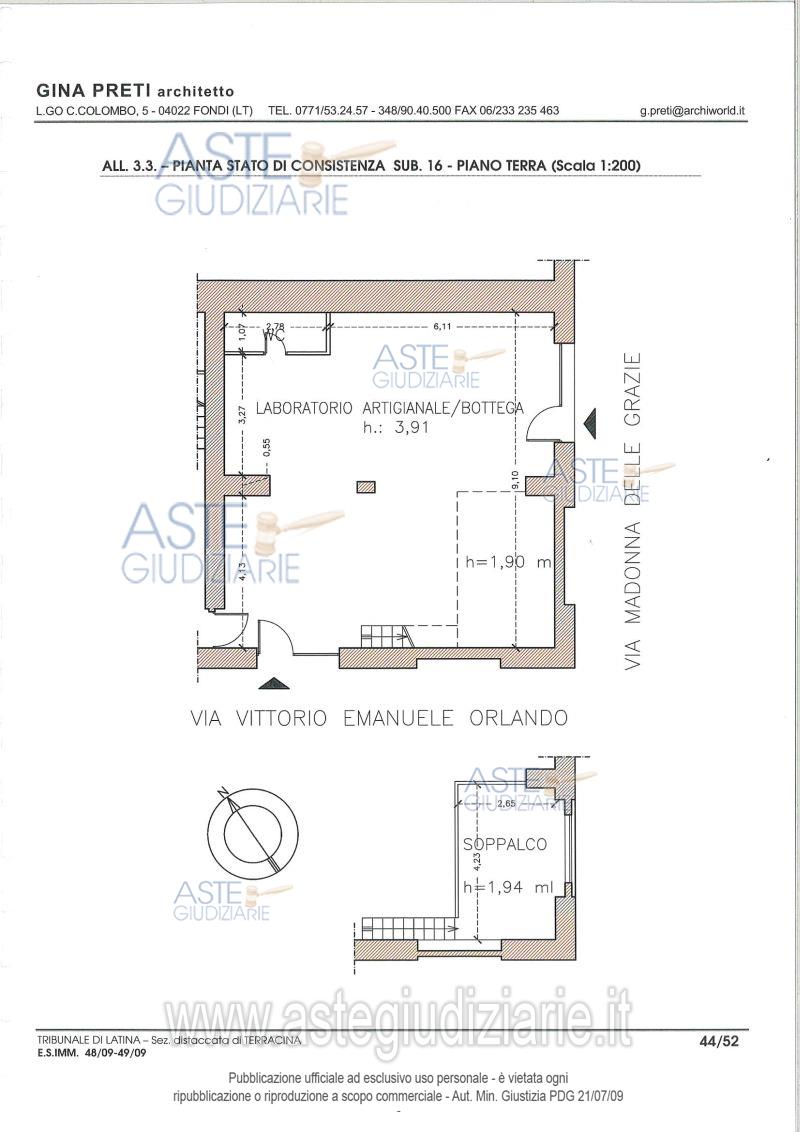 Vendita all'asta Senza incanto, con gara telematica asincrona - LOTTO 2: Piena proprietà di locale al piano terra ad uso artigianale- commerciale di mq. 92 utili. Prezzo base € 50.625,00 (offerta minima € 37.968,75). Data inizio operazioni di vendita: 06/05/2026 ore 16:00. Professionista delegato alla vendita Avv. Fabio De Felice - Email "claudiadefelice@avvdefelice.it"; Cell. 3356180722. Custode Giudiziario Avv. Fabio De Felice - Email "claudiadefelice@avvdefelice.it"; Cell. 3356180722. Rif. Tribunale di Latina - Esecuzione immobiliare n. 20048/2009