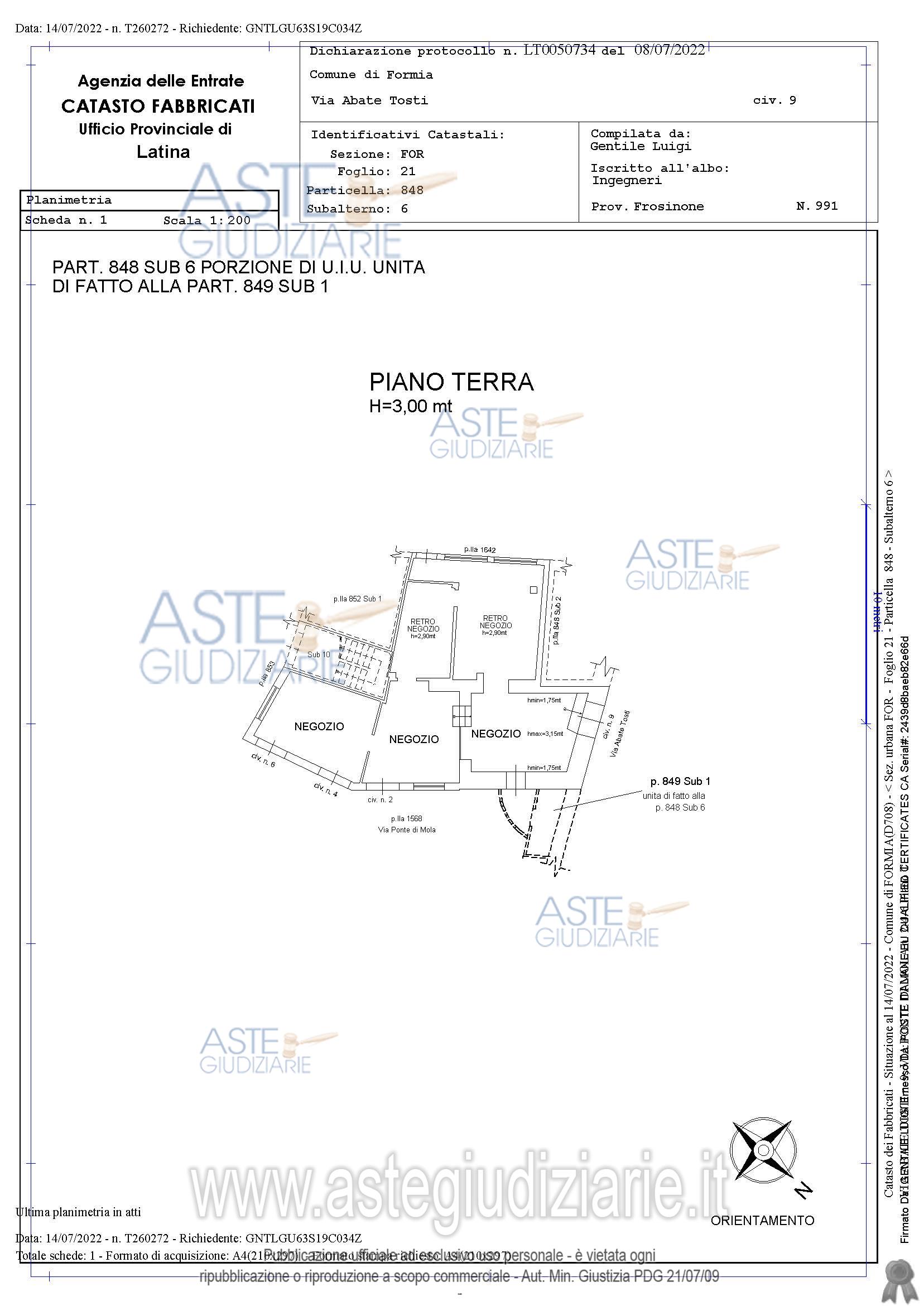 Vendita all'asta Senza incanto, con gara telematica asincrona - LOTTO UNICO: LOTTO 1Piena proprietà negozio in Formia (Lt) con accesso su Via Ponte di Mola n. 2-4-6 e Via Abate Tosti n. 9, piano terra in fabbricato su quattro livelli oltre quota parte beni comuni non censibili (vano scala).In Catasto fabbricati S.U. FOR. al foglio 21 p.lla 848 Sub 6 z.c. 1, cat. C/1 classe 2, consistenza 72 mq, rendita Euro 1.427,90. Confini: p.lla 849 sub 1, p.lla 848 Sub 10, p.lla 852 Sub 1, salvo altri.Superficie commerciale con annessi: mq 89,37. Occupato. Prezzo base € 99.840,00 (offerta minima € 74.880,00). Data inizio operazioni di vendita: 05/02/2026 ore 15:30. Professionista delegato alla vendita Avv. Elisabetta Di Mascio - Email "avvelidimascio@libero.it"; Tel. 3384932595. Custode Giudiziario Avv. Elisabetta Di Mascio - Email "avvelidimascio@libero.it"; Tel. 3384932595. Rif. Tribunale di Cassino - Esecuzione immobiliare post legge 80 n. 142/2021