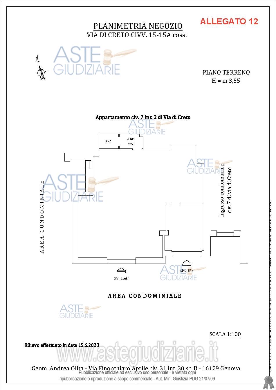 Vendita all'asta Con incanto, con gara telematica sincrona mista - LOTTO 4543504: LOTTO 1 - Piena proprietà dell’immobile uso commerciale sito in Genova (GE), Via di Creto, distinto con i civici n. 13A Rosso e 13B Rosso del fabbricato avente civico n. 7, posto al piano terreno -superficie lorda pari a circa 65,00 mq. Prezzo base € 23.400,00 (offerta minima € 17.550,00). Data vendita 21/05/2026 ore 14:00. Professionista delegato alla vendita Gelli Claudio - Email "GELLI@M7ASSOCIATI.COM"; Tel. 010588182. Custode Giudiziario Dott. So.Ve.Mo Srl - Email "visitegenova@sovemo.com"; Tel. 0105299253. Rif. Tribunale di Genova - Esecuzione immobiliare post legge 80 n. 122/2023
