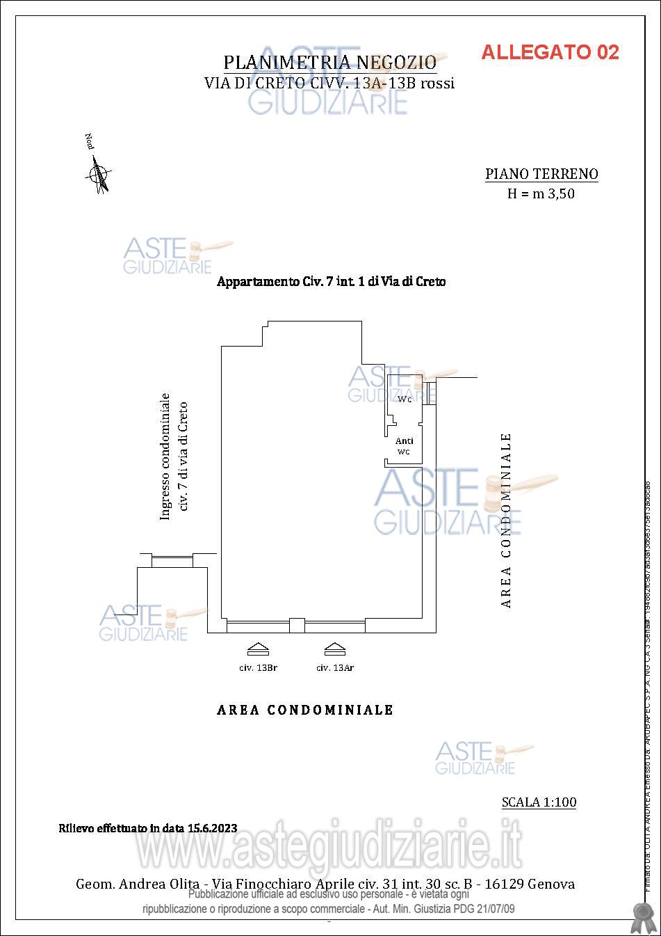 Vendita all'asta Senza incanto, con gara telematica sincrona mista - LOTTO 4543585: LOTTO 2 - Piena proprietà dell’immobile, sito in Genova (GE), Via di Creto, distinto con i civici n. 15 Rosso e 15A Rosso del fabbricato avente civico n. 7, posto al piano terreno. Il negozio è costituito da un ampio locale e da uno di dimensioni più contenute, annesso anti bagno e un wc senza finestra. L’unità immobiliare sviluppa complessivamente una superficie lorda pari a circa 88,00 mq. Prezzo base € 34.650,00 (offerta minima € 25.987,50). Data vendita 21/05/2026 ore 14:00. Professionista delegato alla vendita Gelli Claudio - Email "GELLI@M7ASSOCIATI.COM"; Tel. 010588182. Custode Giudiziario Dott. So.Ve.Mo Srl - Email "visitegenova@sovemo.com"; Tel. 0105299253. Rif. Tribunale di Genova - Esecuzione immobiliare post legge 80 n. 122/2023