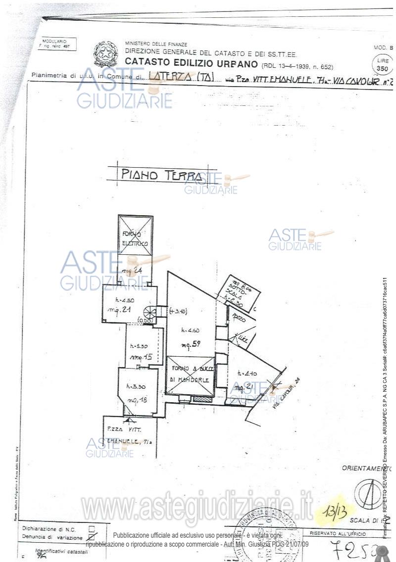 Vendita all'asta Senza incanto, con gara telematica asincrona - LOTTO UNICO: Piena proprietà dell’unita immobiliare a destinazione commerciale sita in Laterza (TA) con acceso dalla P.zza Vittorio Emanuele, n. 71/A, posta al piano terra. Il locale è suddiviso in negozio per una superficie di circa 101 mq ed in deposito della superficie di circa 121 mq. Prezzo base € 157.104,00 (offerta minima € 117.828,00). Data inizio operazioni di vendita: 04/02/2026 ore 16:00. Giudice Dott. Andrea Paiano. Professionista delegato alla vendita Avv. Roberto Pugliese. Custode Giudiziario Avv. Roberto Pugliese - Email "puglieseavvroby@libero.it". Rif. Tribunale di Taranto - Esecuzione immobiliare post legge 80 n. 148/2018