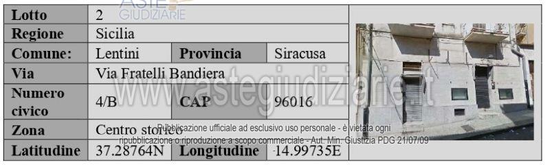 Vendita all'asta Competitiva, con gara telematica sincrona mista - LOTTO 2: Negozio in Lentini (SR) via F.lli Bandiera n.4/A, costituito da un locale a piano terra, con relative pertinenze; in NCEU foglio 91 part 53 sub 1-2-5, oggi foglio 91 P.lla 8442, sub 6, in zona residenziale, prossima al centro storico – zona centrale – non occupato – ante 1967 ed in regola sotto il profilo urbanistico. Prezzo base € 30.797,00 (offerta minima € 23.097,00). Data vendita 14/05/2026 ore 11:00. Curatore Avv. Flavio Agostini - Email "F.AGOSTINI@PEC.SERVIZIPOSTA.IT"; Cell. 3474685528. Rif. Tribunale di Siracusa - Fallimentare n. 54/1997