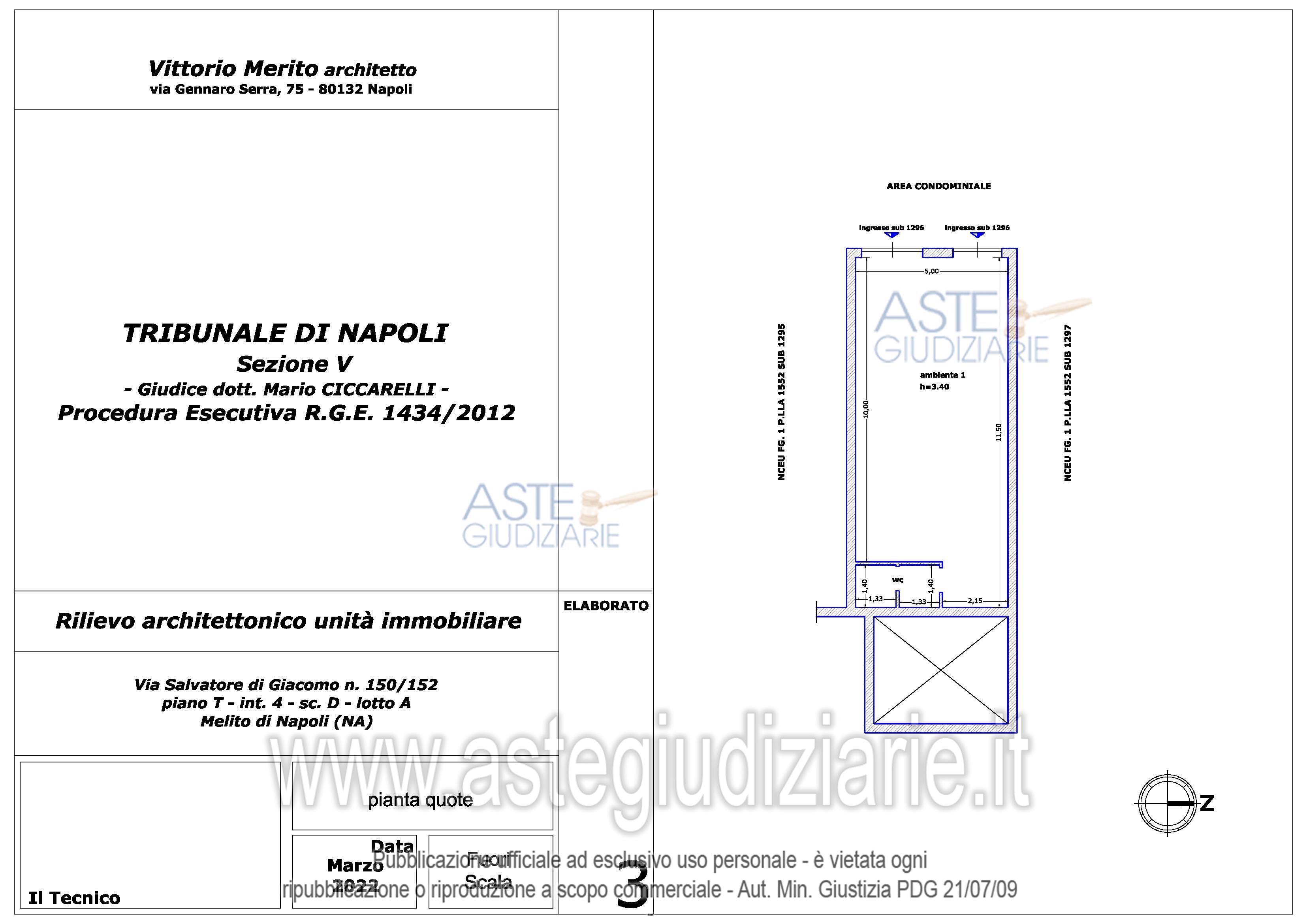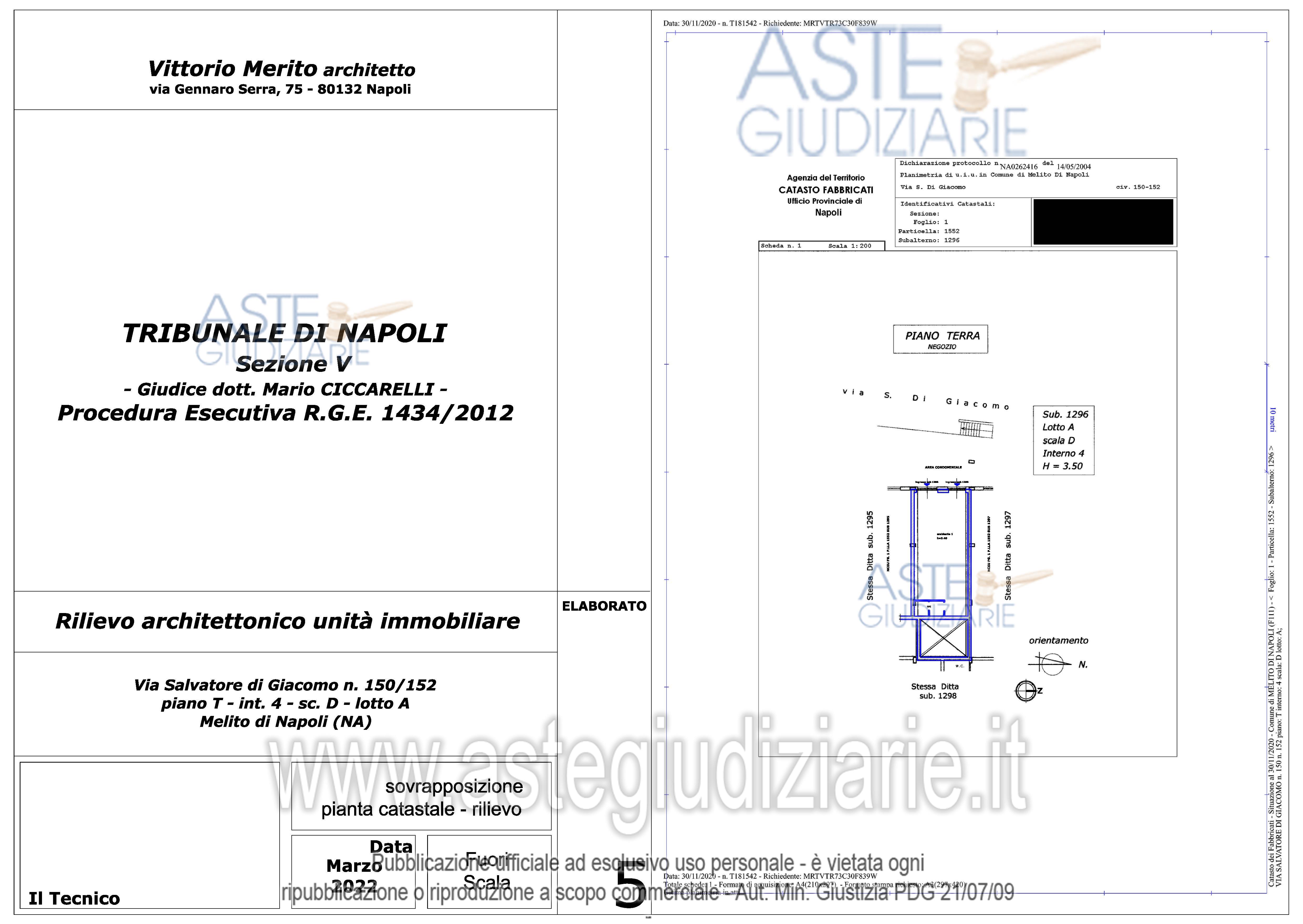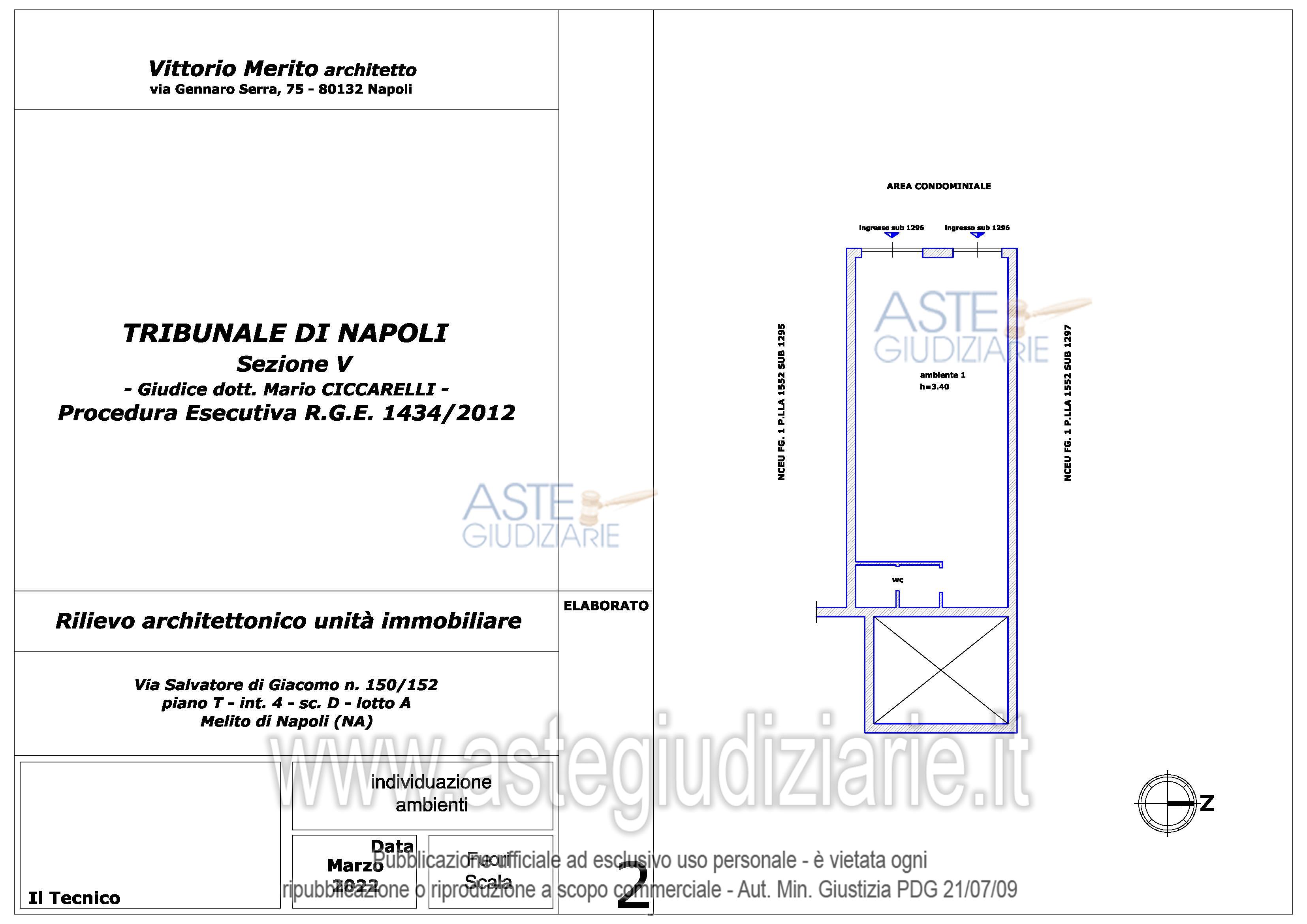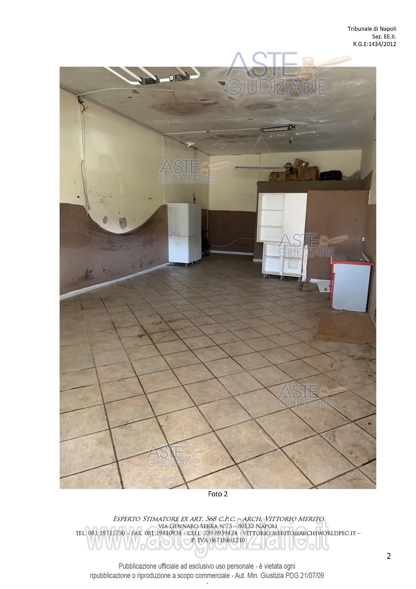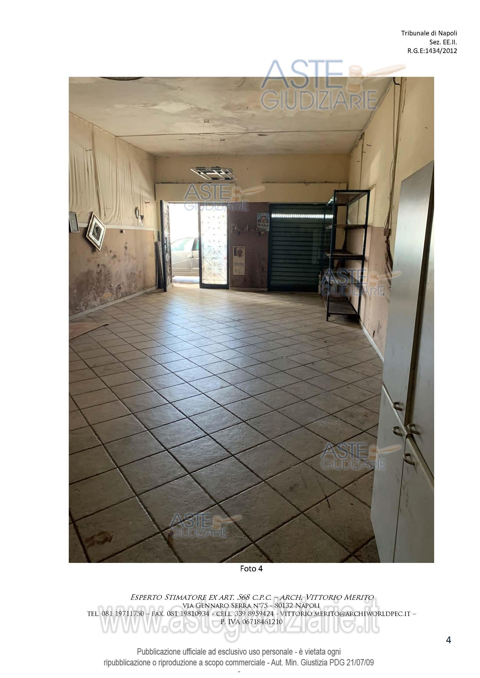 Vendita all'asta Senza incanto, con gara telematica asincrona - LOTTO 13: Piena e intera proprietà del seguente immobile sito in Melito di Napoli alla Via Salvatore di Giacomo n. 150-152: Locale commerciale al piano T, interno 4, scala D, lotto A, sup. cat. 59 mq. Prezzo base € 6.702,00 (offerta minima € 5.027,00). Data inizio operazioni di vendita: 06/05/2026 ore 09:30. Giudice Dott. Mario Ciccarelli. Professionista delegato alla vendita Avv. Valeria Collicelli - Email "valcollicelli@yahoo.it"; Cell. 3292619009. Custode Giudiziario Avv. Valeria Collicelli - Email "valcollicelli@yahoo.it"; Cell. 3292619009. Rif. Tribunale di Napoli - Esecuzione immobiliare post legge 80 n. 1434/2012