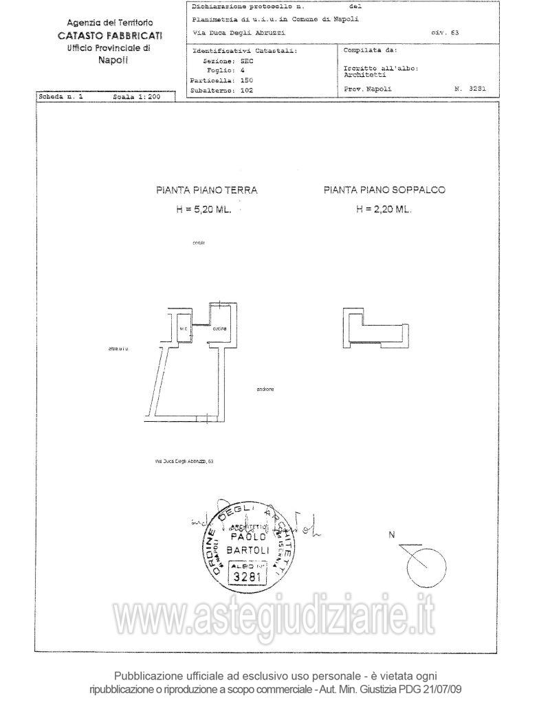 Vendita in attesa dell'emissione del nuovo bando d'asta. LOTTO UNICO: Piena proprietà dell'unità immobiliare sita in Napoli, alla via Duca degli Abruzzi n.63, di locale commerciale posto al piano terra, di un edificio di tre piani fuori terra, in Napoli , ove è stato realizzato un soppalco in carpenteria metallica al quale si accede a mezzo di una scala metallica. Ultimo prezzo base € 25.312,50 (offerta minima € 18.984,37). Giudice Federica D'auria. Professionista delegato alla vendita Avv. Federica Cioffi - Email "avv.federicacioffi@gmail.com"; Cell. 3382127746. Custode Giudiziario Avv. Federica Cioffi - Email "avv.federicacioffi@gmail.com"; Cell. 3382127746. Rif. Tribunale di Napoli - Esecuzione immobiliare post legge 80 n. 257/2010
