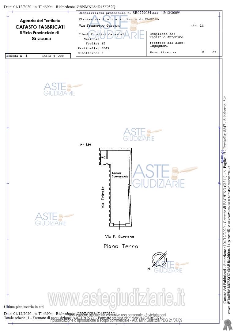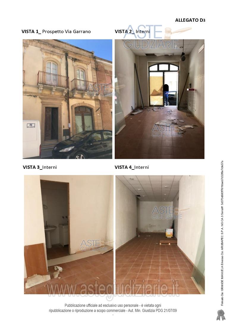 Vendita in attesa dell'emissione del nuovo bando d'asta. LOTTO 3: piena proprietà di basso commerciale sito in Pachino (SR), Via Garrano n. 14, posto a piano terra di un fabbricato ubicato fra la via Garrano e la via Trieste (in N.C.E.U. del Comune di Pachino al foglio 15, p.lla 8847, sub. 3, mq. 47, cat. C/1, cl. 4). Ultimo prezzo base € 22.781,25 (offerta minima € 17.085,94). Giudice Alessia Romeo. Professionista delegato alla vendita Avv. Gabriele Galota - Email "galota.gabriele@gmail.com"; Tel. 09311562510. Custode Giudiziario Avv. Gabriele Galota - Email "galota.gabriele@gmail.com"; Tel. 09311562510. Rif. Tribunale di Siracusa - Esecuzione immobiliare post legge 80 n. 156/2020