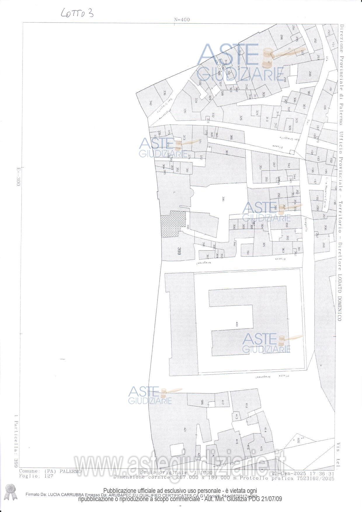 Vendita all'asta Senza incanto, con gara telematica sincrona mista - LOTTO 3: LOTTO TRE: - piena proprietà dell’immobile sito in Palermo, Via S. Agostino n. 101, piano T, censito al C.F. del Comune di Palermo al foglio 127, particella 399, sub. 5, zona 1, cat. C/1, classe 8, consistenza 13 mq, rendita euro 257,82. Prezzo base € 25.000,00 (offerta minima € 18.750,00). Data vendita 21/04/2026 ore 10:00. Professionista delegato alla vendita Avv. Lorenzo Lo Verso - Email "lorenzo.loverso@libero.it"; Cell. 3317114606; Tel. 091516903. Custode Giudiziario Avv. Lorenzo Lo Verso - Email "lorenzo.loverso@libero.it"; Cell. 3317114606; Tel. 091516903. Rif. Tribunale di Palermo - Espropriazione immobiliare (cartabia) n. 294/2024