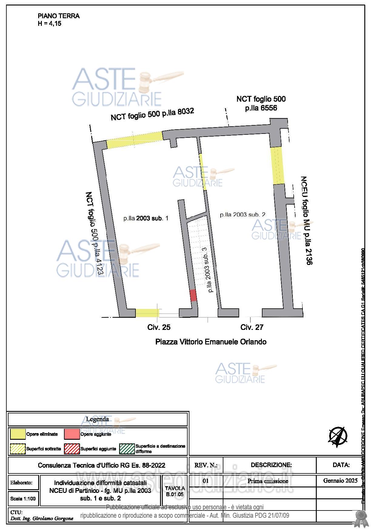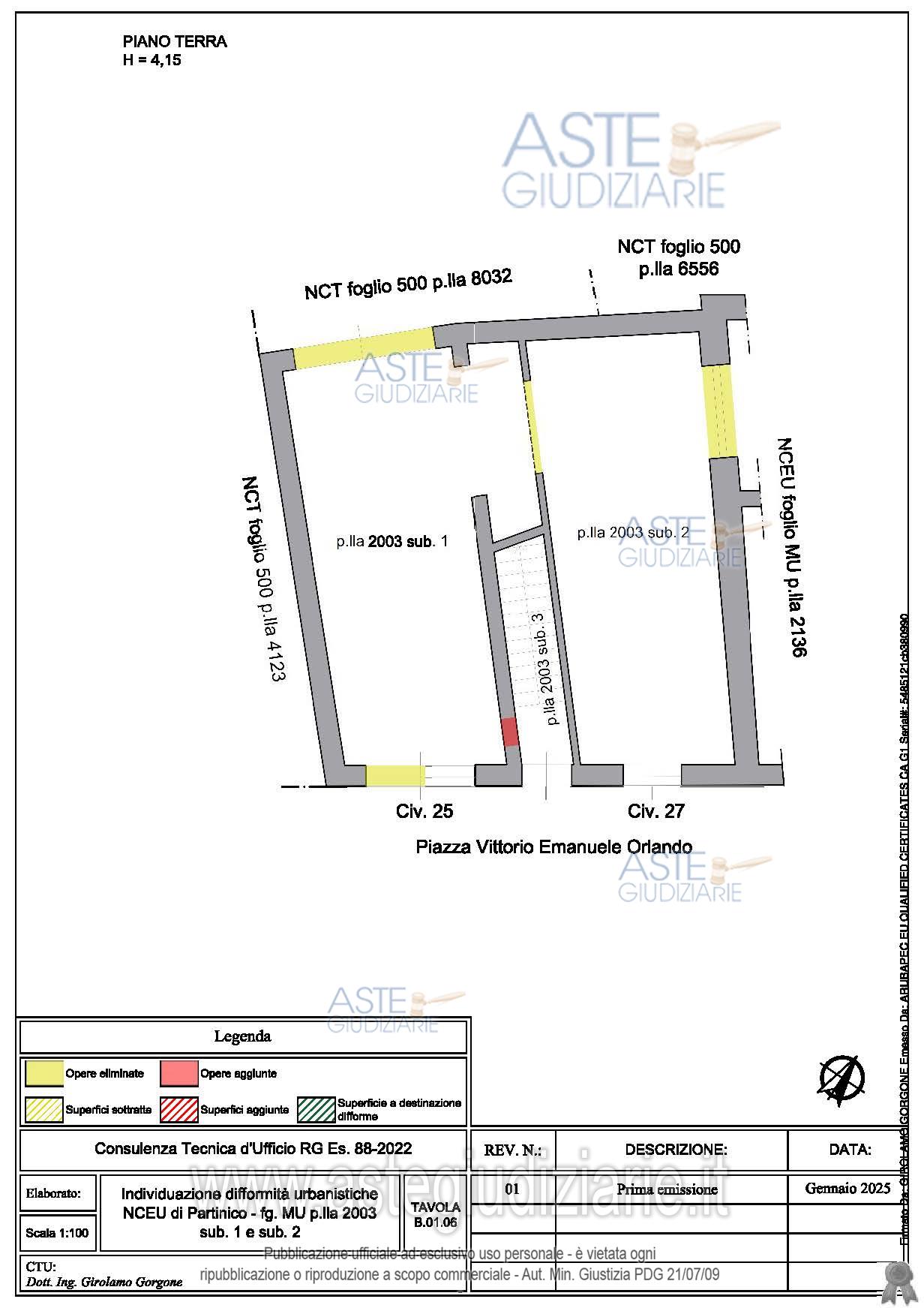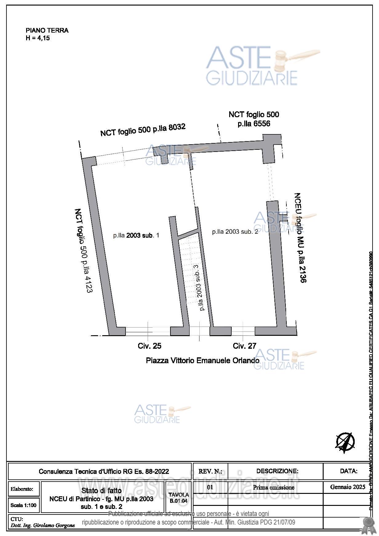 Vendita all'asta Senza incanto, con gara telematica sincrona mista - LOTTO 2: Piena proprietà di due negozi siti in Partinico, Piazza Vittorio Emanuele Orlando ai civici n.25/27, piano terra, identificati all’N.C.E.U. di detto Comune al fg MU, part. 2003 sub 1, cat C/1, Cl 4, Cons.41 m2, Sup. Cat. tot: 49 m2 e? sub 2, cat C/1, Cl 5, Cons 38 m2, Sup. Cat. tot: 45 m2. L’immobile si presenta inagibile, inutilizzabile allo stato attuale, nella parte posteriore presenta i segni delle macerie che hanno interessato i solai sovrastanti. Prezzo base € 56.585,80 (offerta minima € 42.439,25). Data vendita 21/11/2025 ore 09:30. Giudice Valentina Imperiale. Professionista delegato alla vendita Avv. Alessandro Mineo - Email "alessandro.mineo@libero.it"; Cell. 3388659800; Tel. 0916497440. Custode Giudiziario Avv. Alessandro Mineo - Email "alessandro.mineo@libero.it"; Cell. 3388659800; Tel. 0916497440. Rif. Tribunale di Palermo - Esecuzione immobiliare post legge 80 n. 88/2022