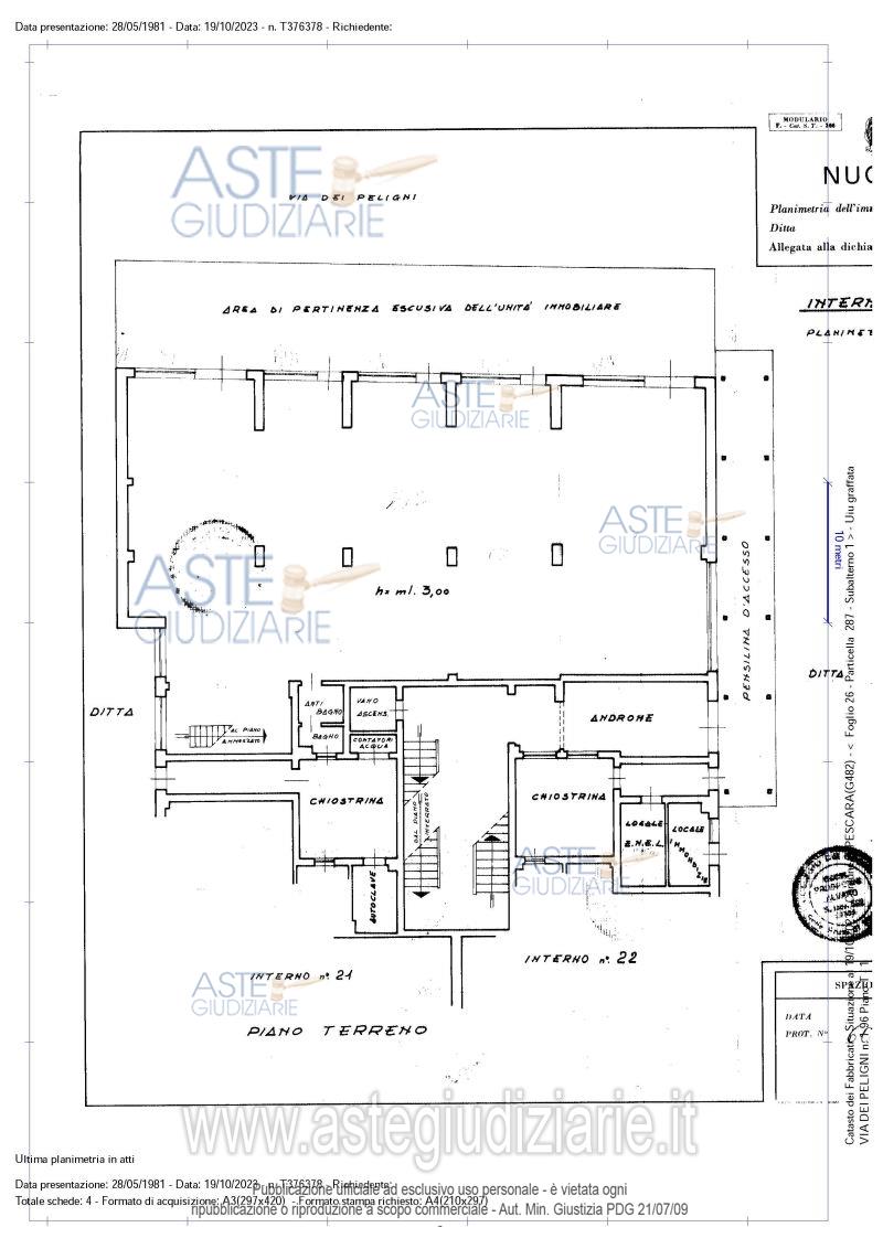 Vendita all'asta Senza incanto, con gara telematica asincrona - LOTTO 1: Locale negozio al piano terra con piano ammezzato (soppalco). Sono di pertinenza dell'immobile l'area antistante al piano terra e il piccolo lastrico solare a livello del piano ammezzato entrambi prospicienti via Dei Peligni. Prezzo base € 209.941,20 (offerta minima € 157.455,90). Data inizio operazioni di vendita: 30/04/2026 ore 12:00. Giudice Dott. Federica Colantonio. Curatore Avv. Antonella Santeusanio. Rif. Tribunale di Pescara - Fallimentare (nuovo rito) n. 18/2022