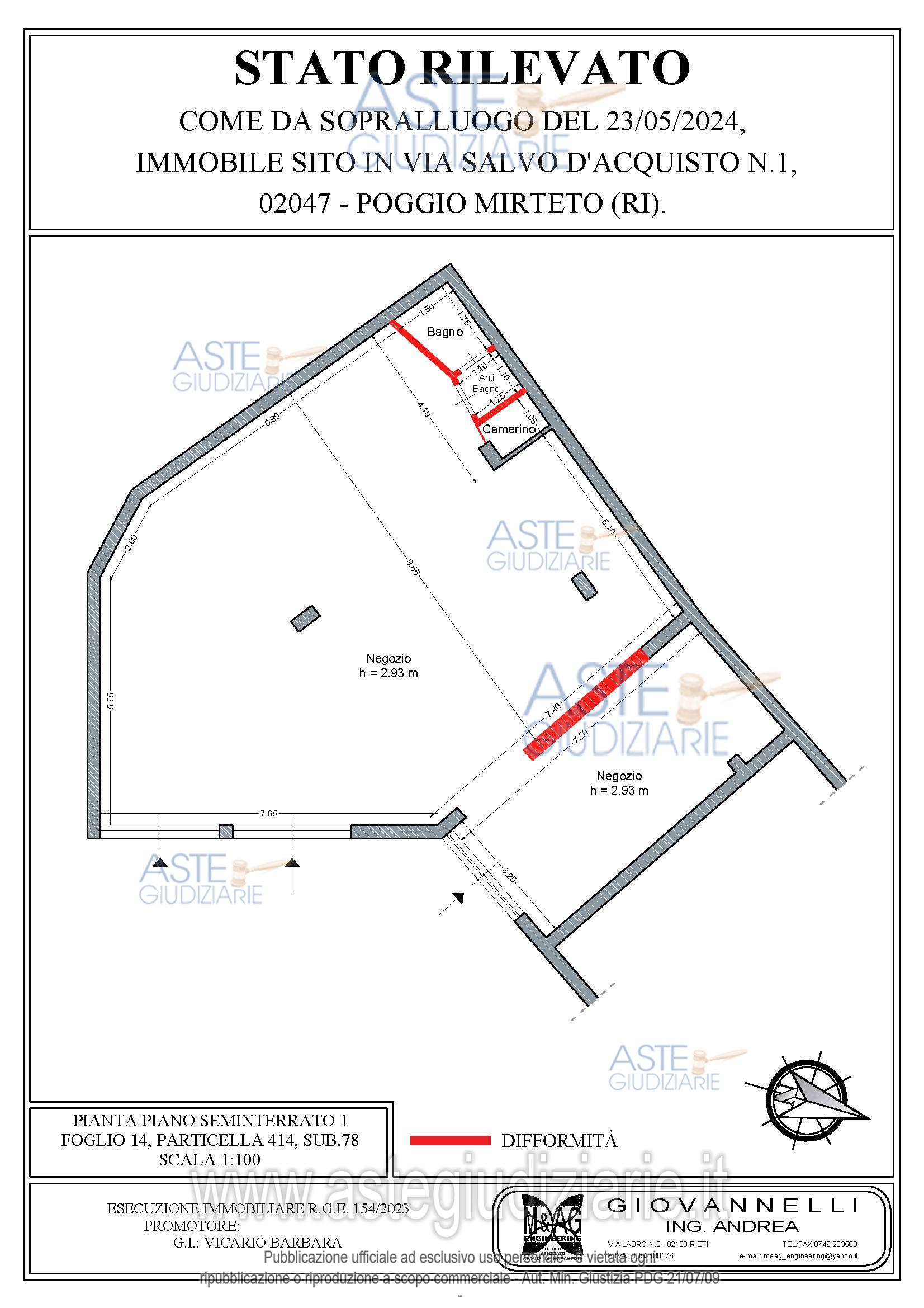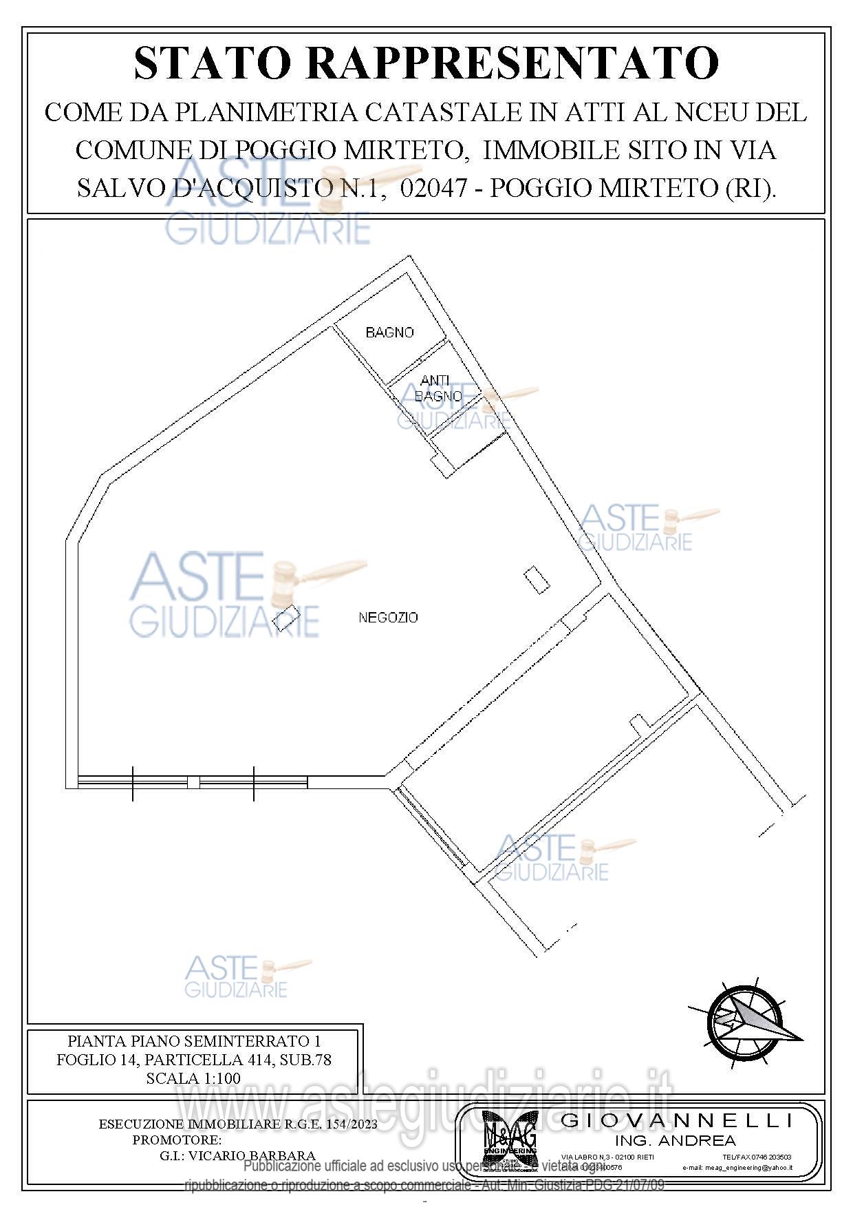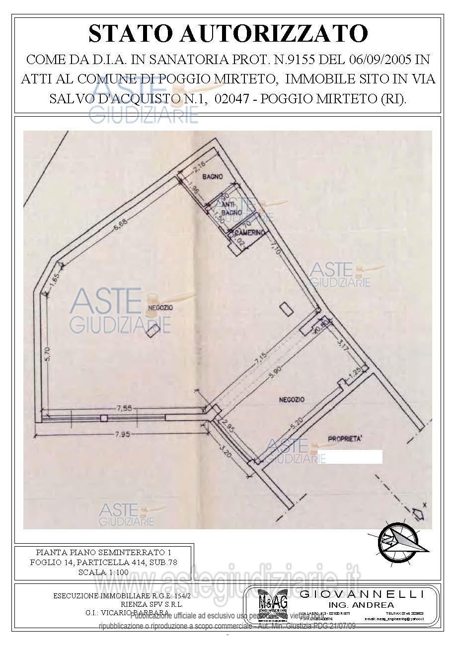 Vendita all'asta Senza incanto, con gara telematica asincrona - LOTTO UNICO: Negozio in Poggio Mirteto (RI), Via S. D’Acquisto 1, pressi centro storico. Ampio locale su unico livello (piano strada/seminterrato) in fabbricato condominiale composto da: locale uso esposizione merce, camerino, antibagno, bagno senza finestre. Presenti impianti (da verificare funzionalità): idrotermosanitario, climatizzazione (aria calda/fredda/split su parete), energia elettrica. Normale stato conservativo; non richiede manutenzione straordinaria; può essere immediatamente utilizzato. Prezzo base € 74.362,50 (offerta minima € 55.771,87). Data inizio operazioni di vendita: 27/05/2026 ore 12:30. Professionista delegato alla vendita Avv. Roberto Di Giovanni - Email "robertodigiovanni08@libero.it"; Cell. 3493743159; Tel. 3493743159. Custode Giudiziario Avv. Roberto Di Giovanni - Email "robertodigiovanni08@libero.it"; Cell. 3493743159; Tel. 3493743159. Rif. Tribunale di Rieti - Espropriazione immobiliare (cartabia) n. 154/2023