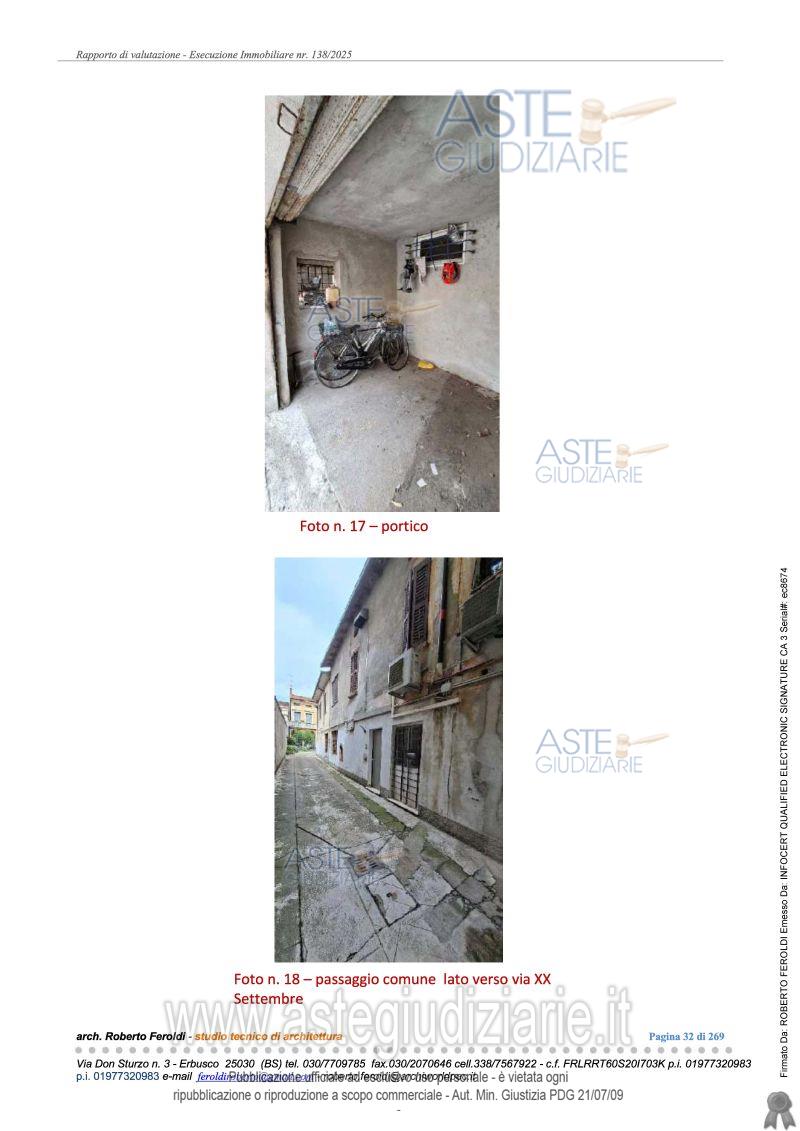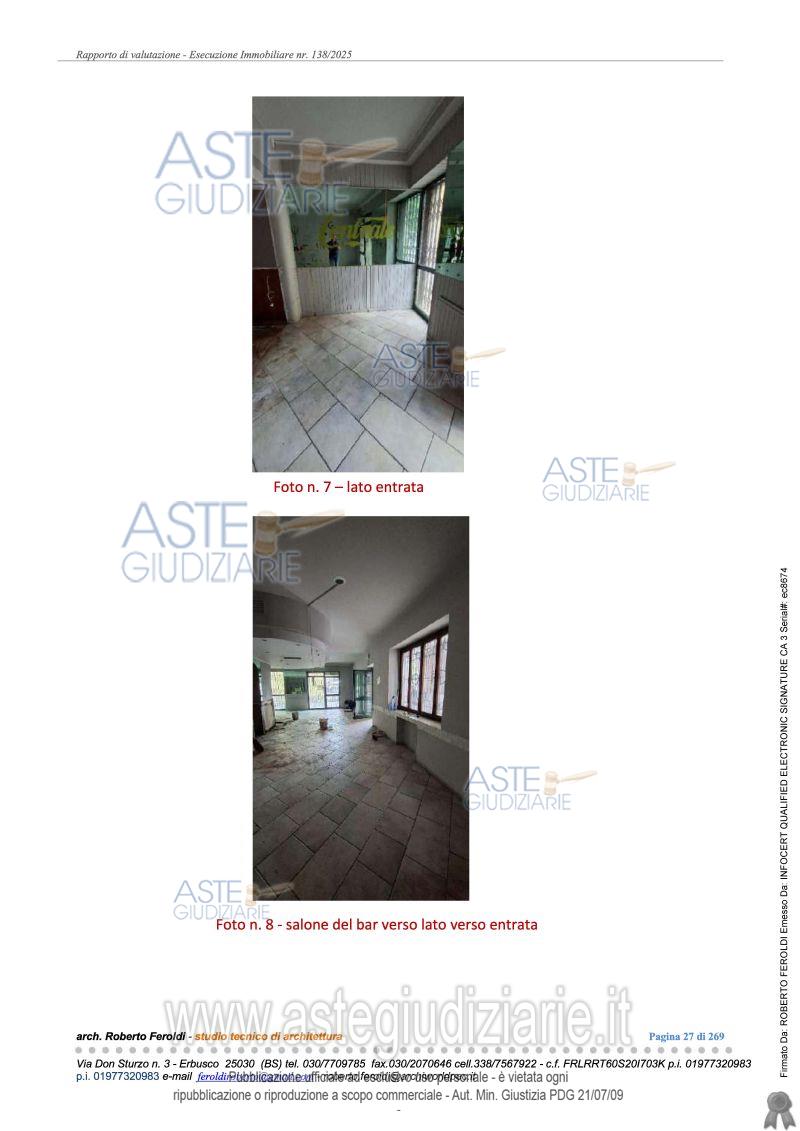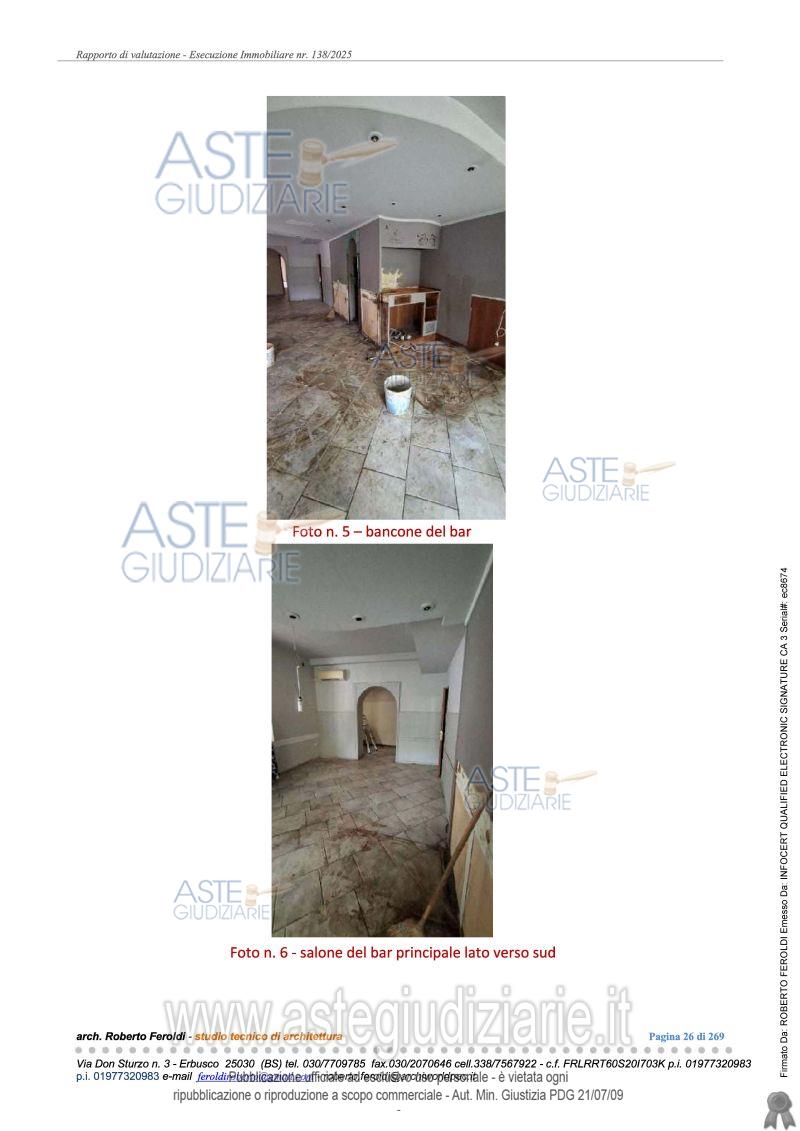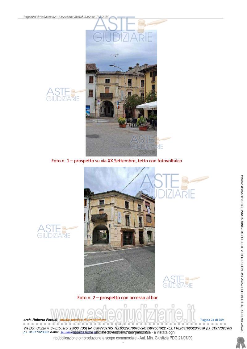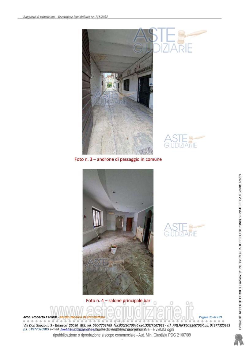 Vendita all'asta Senza incanto, con gara telematica asincrona - LOTTO 1: Piena proprietà di bar posto al piano terra di un edificio di tre piani. All’interno del locale principale sono collocati i banconi del bar e l’arredo, attualmente in cattivo stato di conservazione. Tramite un disimpegno, si raggiunge un salone comunicante con i servizi igienici e una cantina; inoltre, mediante alcuni gradini, si accede a un ripostiglio che era precedentemente un garage separato da un muro. Non occupato. Prezzo base € 135.258,00 (offerta minima € 101.443,50). Data inizio operazioni di vendita: 21/04/2026 ore 12:00. Professionista delegato alla vendita Avv. Carmen Duca - Email "avv.carmenduca@gmail.com"; Tel. 3402683246. Custode Giudiziario Avv. Carmen Duca - Email "avv.carmenduca@gmail.com"; Tel. 3402683246. Rif. Tribunale di Brescia - Espropriazione immobiliare (cartabia) n. 138/2025