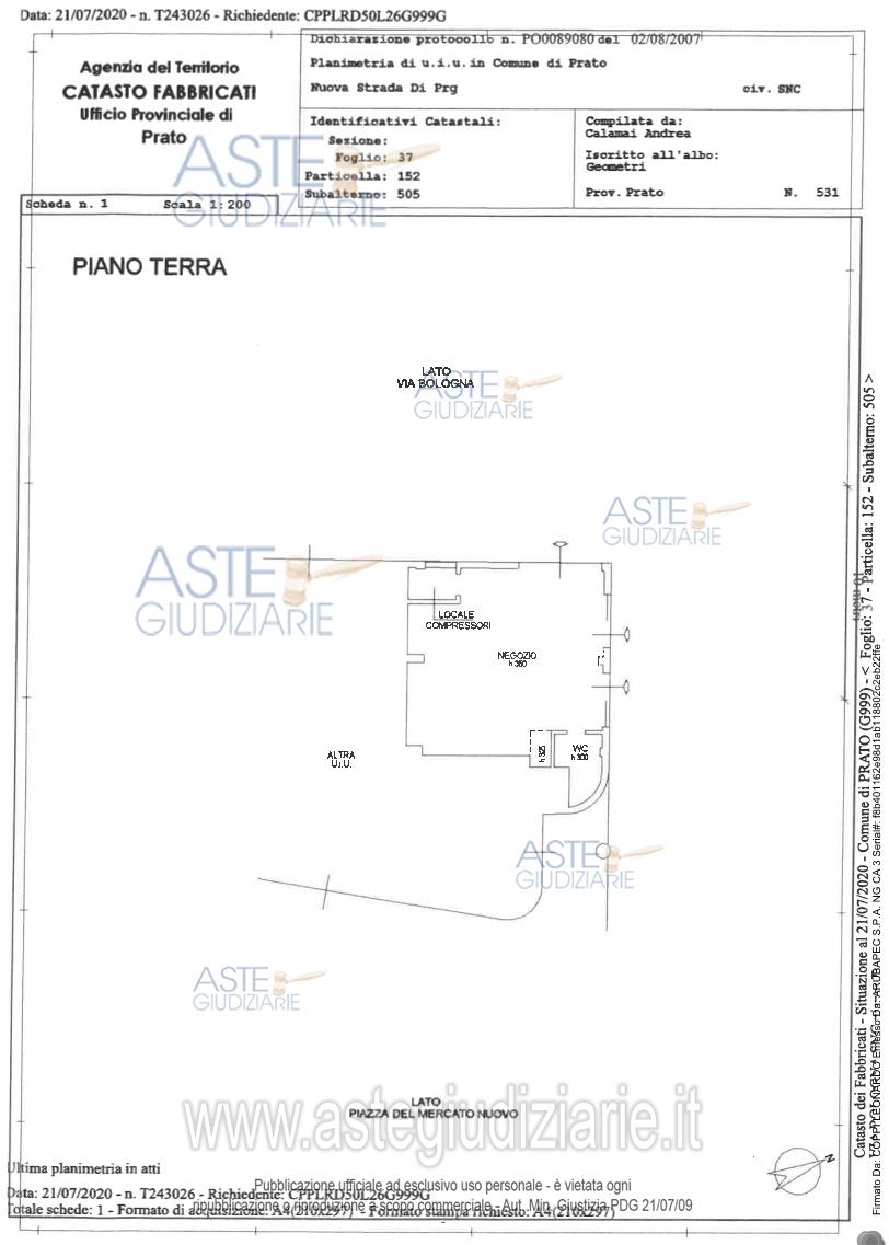 Vendita all'asta Competitiva - LOTTO 2: Diritto di piena proprietà su porzione di complesso immobiliare posto nel Comune di Prato (PO), con accesso da Via Bologna n. 66/11 e, precisamente, negozio al piano terra, sulla destra ed in angolo per chi proviene da Via Bologna ed entra nella diramazione di detta Via, composto da grande locale oltre bagno e locale tecnico. Prezzo base € 113.350,00 (offerta minima € 90.680,00). Data vendita 10/07/2026 ore 15:15. Giudice Enrico Capanna. Professionista delegato alla vendita Not. Luca D'agliana - Email "LDAGLIANA@NOTARIATO.IT"; Tel. 0574757340. Custode Giudiziario Geom. Leonardo Coppi - Email "STUDIOCOPPI@STUDIO-COPPI.IT"; Tel. 0574595221. Rif. Tribunale di Prato - Fallimentare (nuovo rito) n. 26/2020