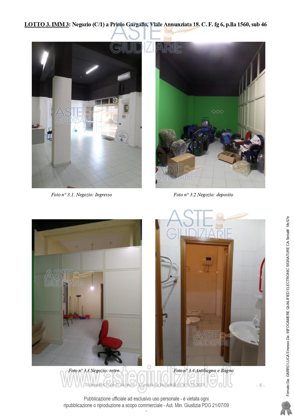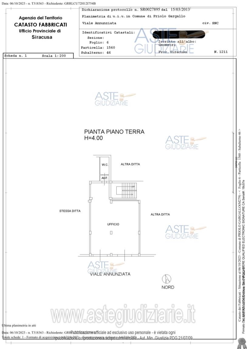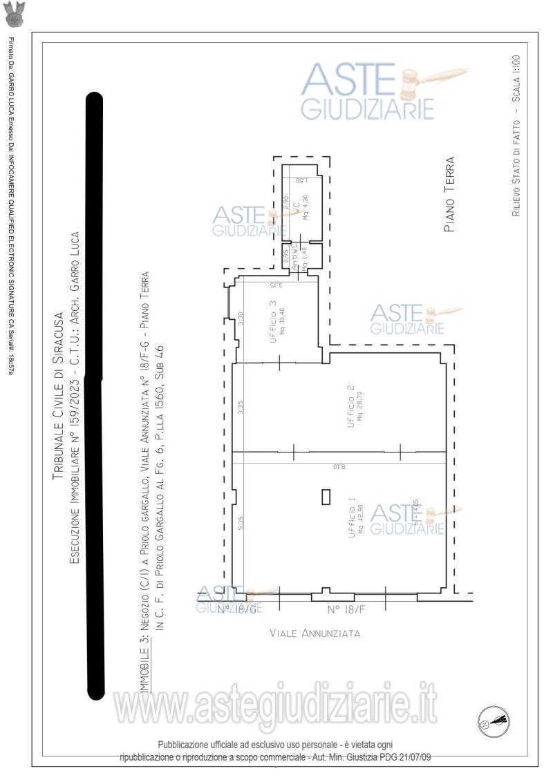 Vendita all'asta Senza incanto, con gara telematica sincrona mista - LOTTO 3: Intera proprietà di ufficio in Priolo Gargallo (SR), Viale Annunziata n. 18/F-G, p. T, in N.C.E.U. al foglio 6, p.lla 1560, sub. 46, cat. C/1, mq. 89, superficie catastale totale mq. 100, rendita Euro 905,50. Prezzo base € 54.000,00 (offerta minima € 40.500,00). Data vendita 21/10/2025 ore 10:00. Giudice Dott. Concita Cultrera. Professionista delegato alla vendita Avv. Gabriele Galota - Email "galota.gabriele@gmail.com"; Tel. 09311562510. Custode Giudiziario Avv. Gabriele Galota - Email "galota.gabriele@gmail.com"; Tel. 09311562510. Rif. Tribunale di Siracusa - Esecuzione immobiliare post legge 80 n. 159/2023