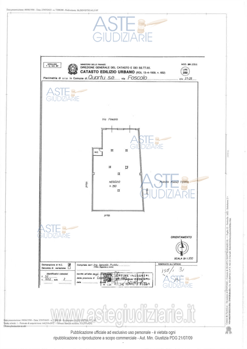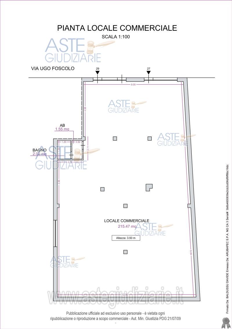 Vendita all'asta Senza incanto, con gara telematica asincrona - LOTTO 1: Quota pari all’intero del diritto di proprietà del locale commerciale al piano terra della Via Foscolo n.27-29, composto da un’area vendita e servizio igienico con disimpegno. Prezzo base € 156.200,00 (offerta minima € 117.150,00). Data inizio operazioni di vendita: 09/06/2026 ore 09:00. Giudice Francesco De Giorgi. Professionista delegato alla vendita Giuditta Grilletti - Email "ufficiouniconotai@pec.it"; Tel. 07060222574. Custode Giudiziario Ivg Cagliari - Email "ivg.visiteimmobili@tiscali.it"; Tel. 0702299036. Rif. Tribunale di Cagliari - Esecuzione immobiliare post legge 80 n. 417/2021