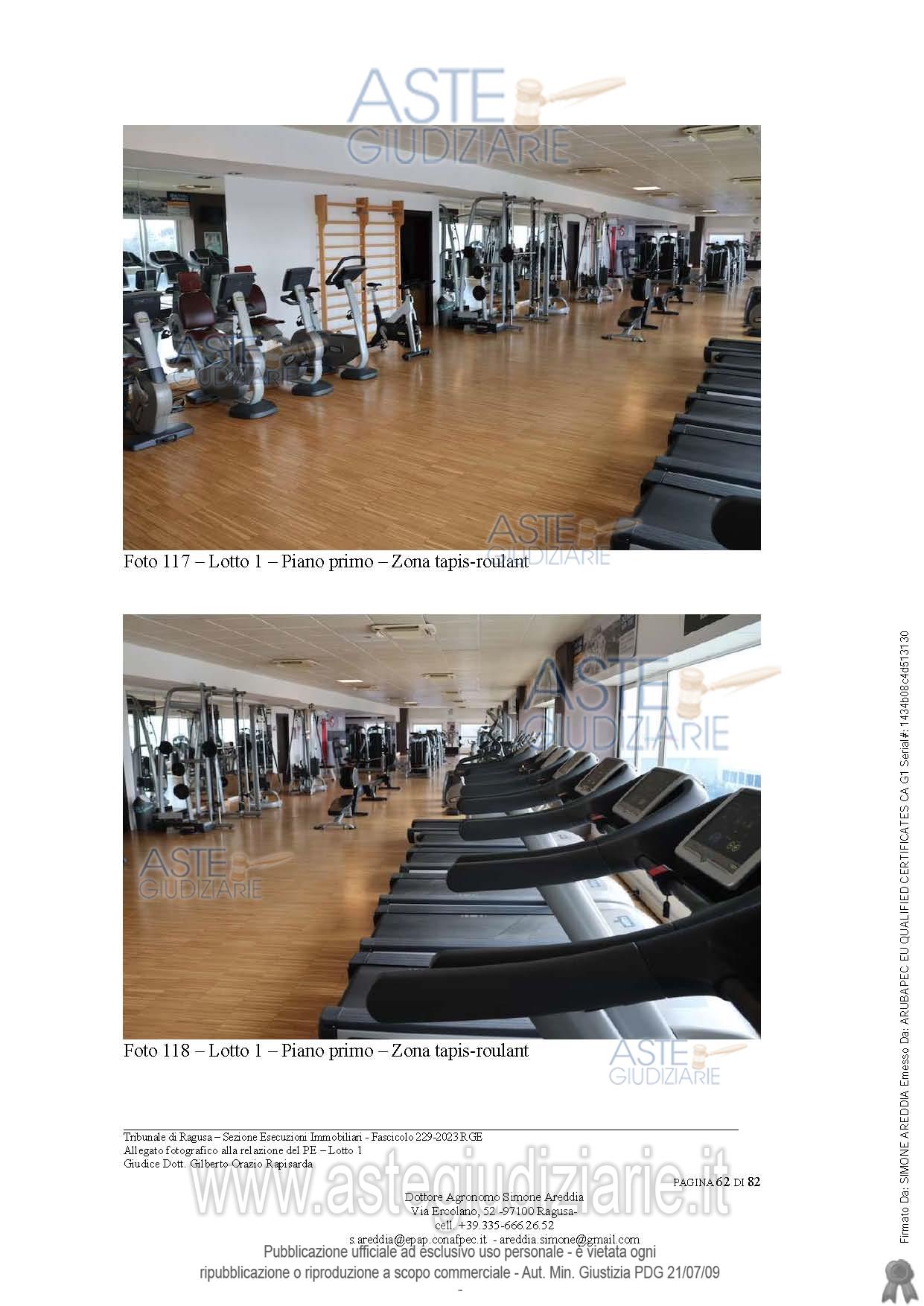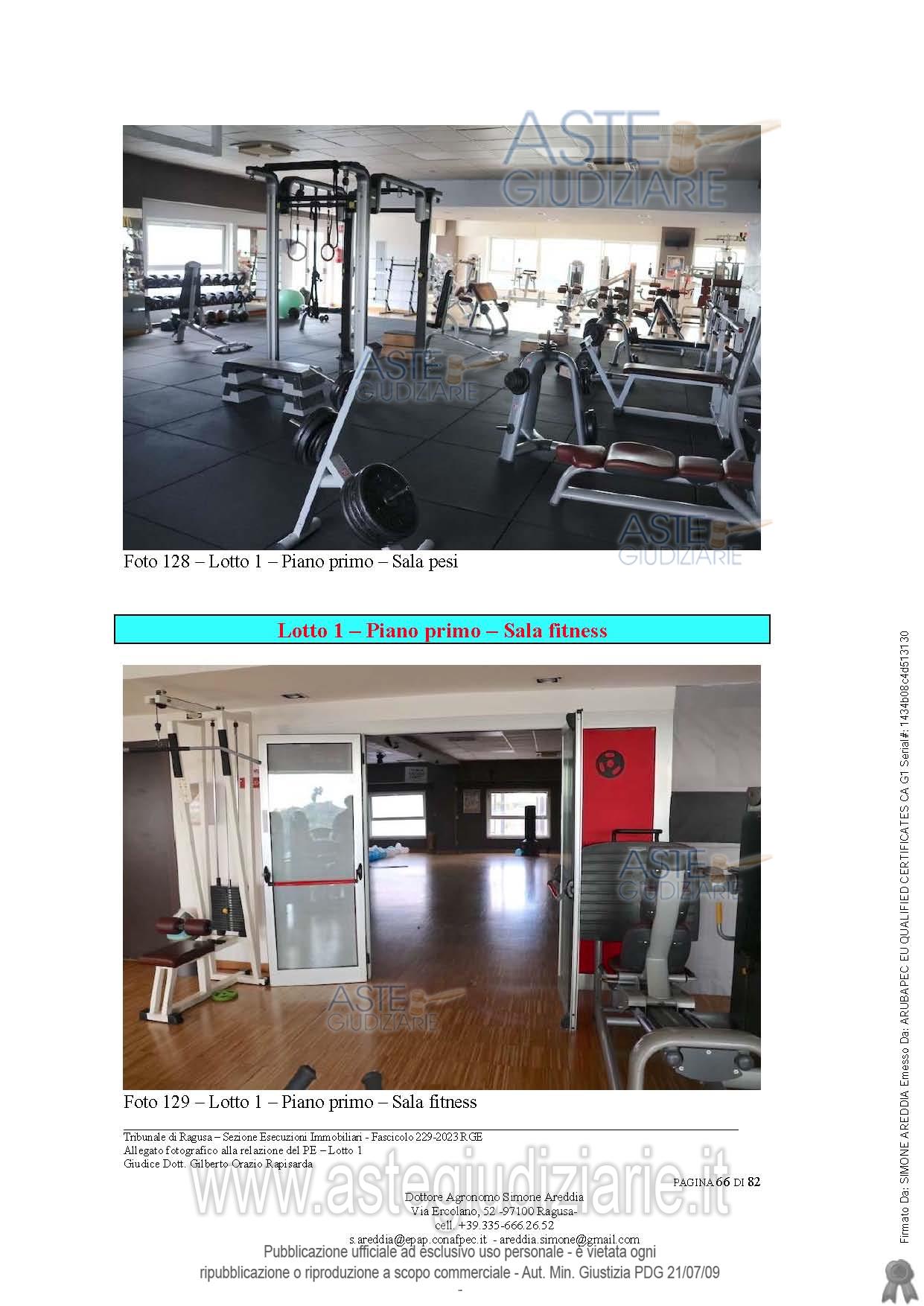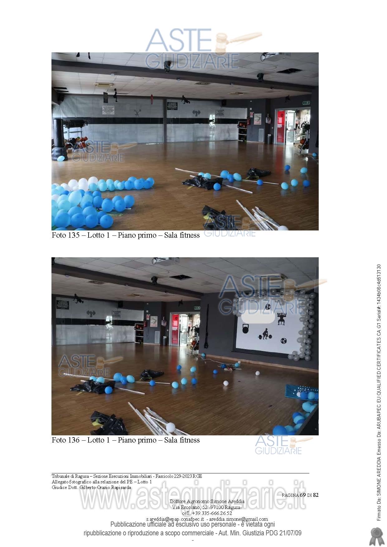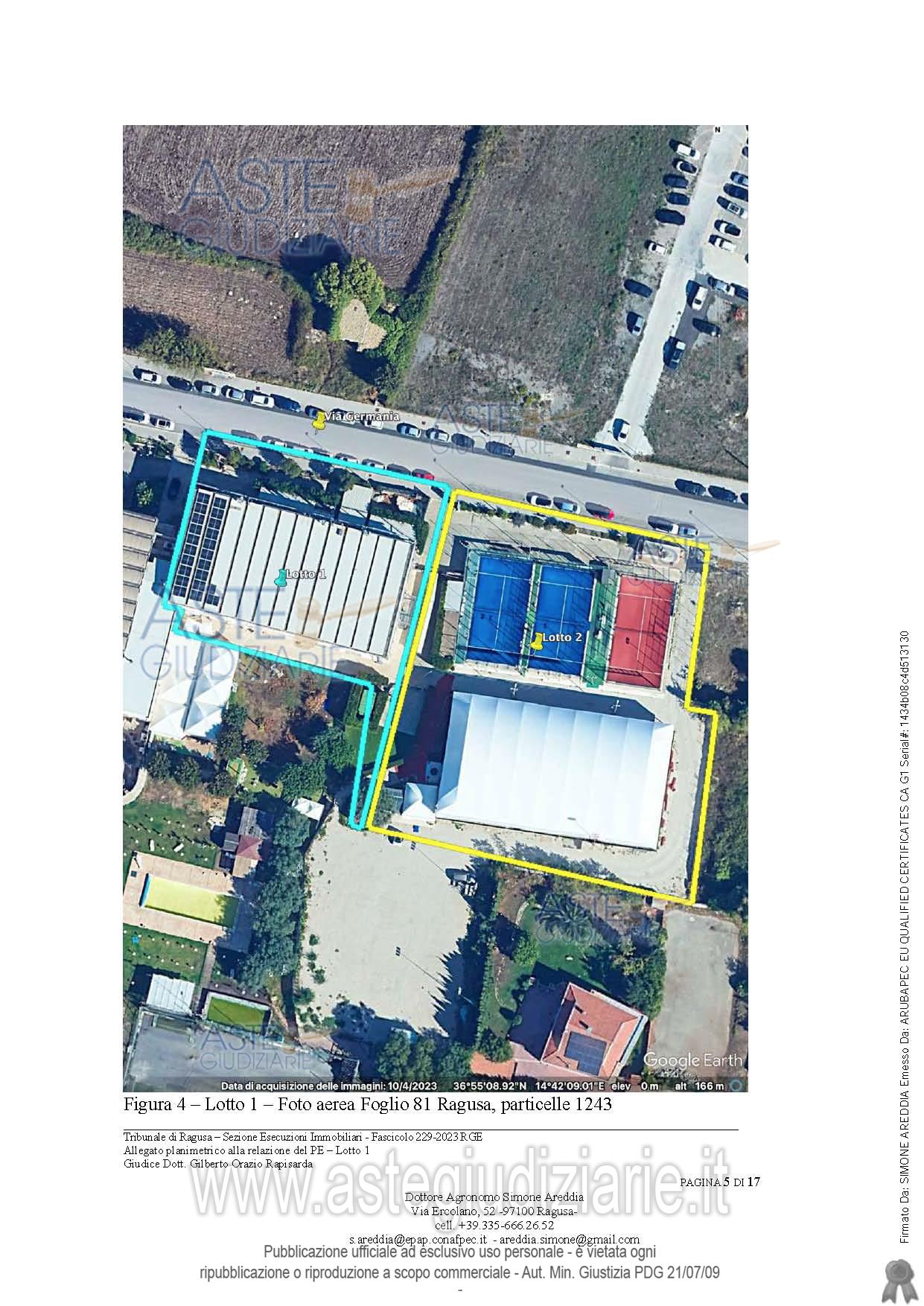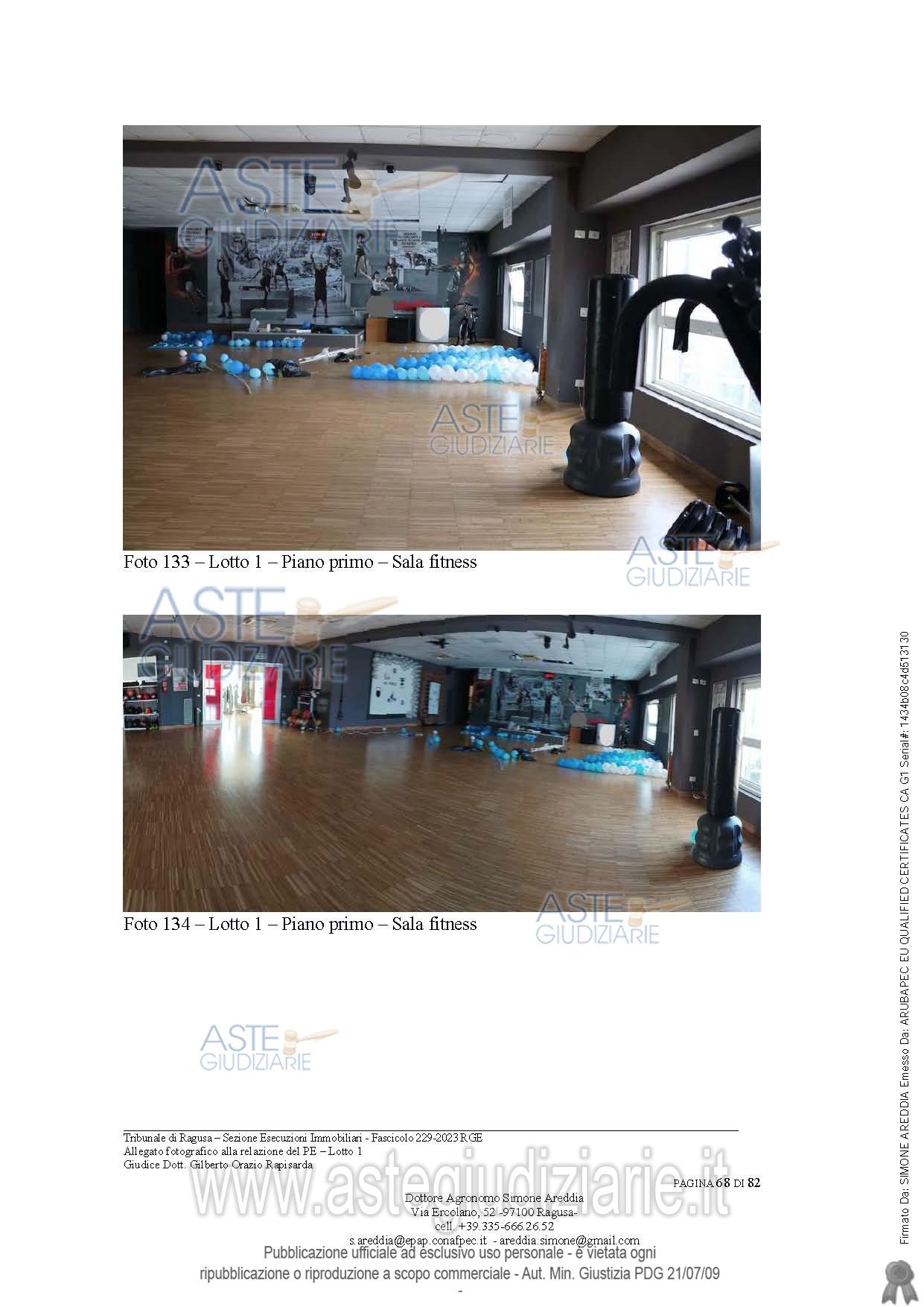 Vendita all'asta Senza incanto, con gara telematica sincrona mista - LOTTO 1: Diritti di piena proprietà di un fabbricato per esercizio sportivo, su due livelli, adibito aCentro fitness, con pertinenziale corte di accesso, sito in Ragusa Via Germania N.12, meglioidentificato al N.C.E.U del predetto Comune alla Sez. A, Foglio 81, particella 1243, sub. 5Cat. D6. Prezzo base € 622.312,00 (offerta minima € 466.734,00). Data vendita 13/02/2026 ore 16:00. Giudice Antonio Pianoforte. Professionista delegato alla vendita Dott. Giovanna Scifo - Email "g.scifo@gmail.com". Custode Giudiziario Dott. Giovanna Scifo - Email "g.scifo@gmail.com"; Tel. 3392519150. Rif. Tribunale di Ragusa - Espropriazione immobiliare (cartabia) n. 229/2023