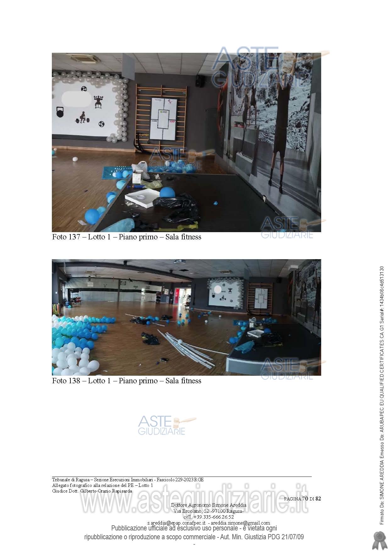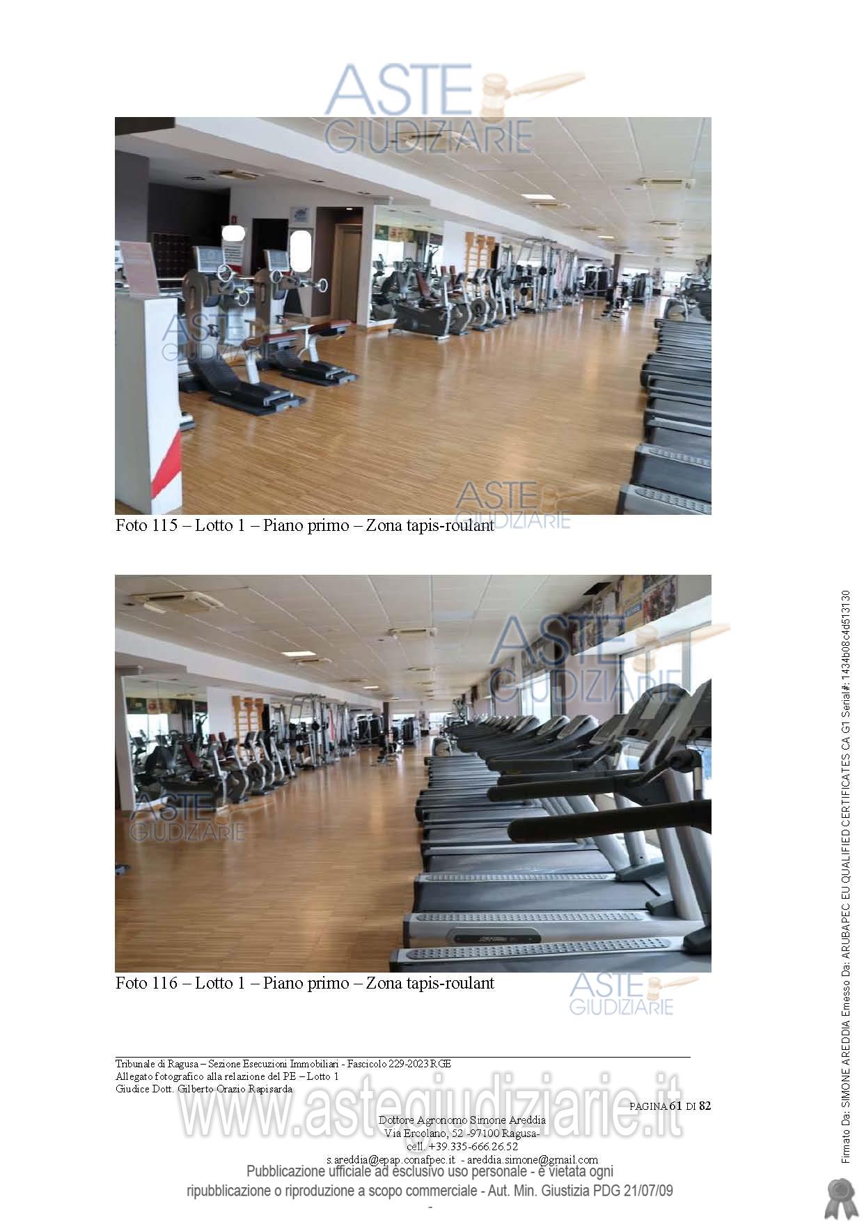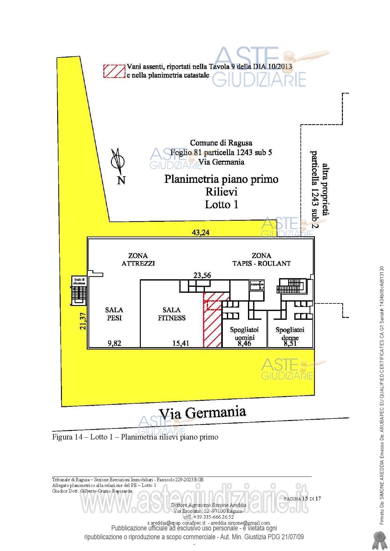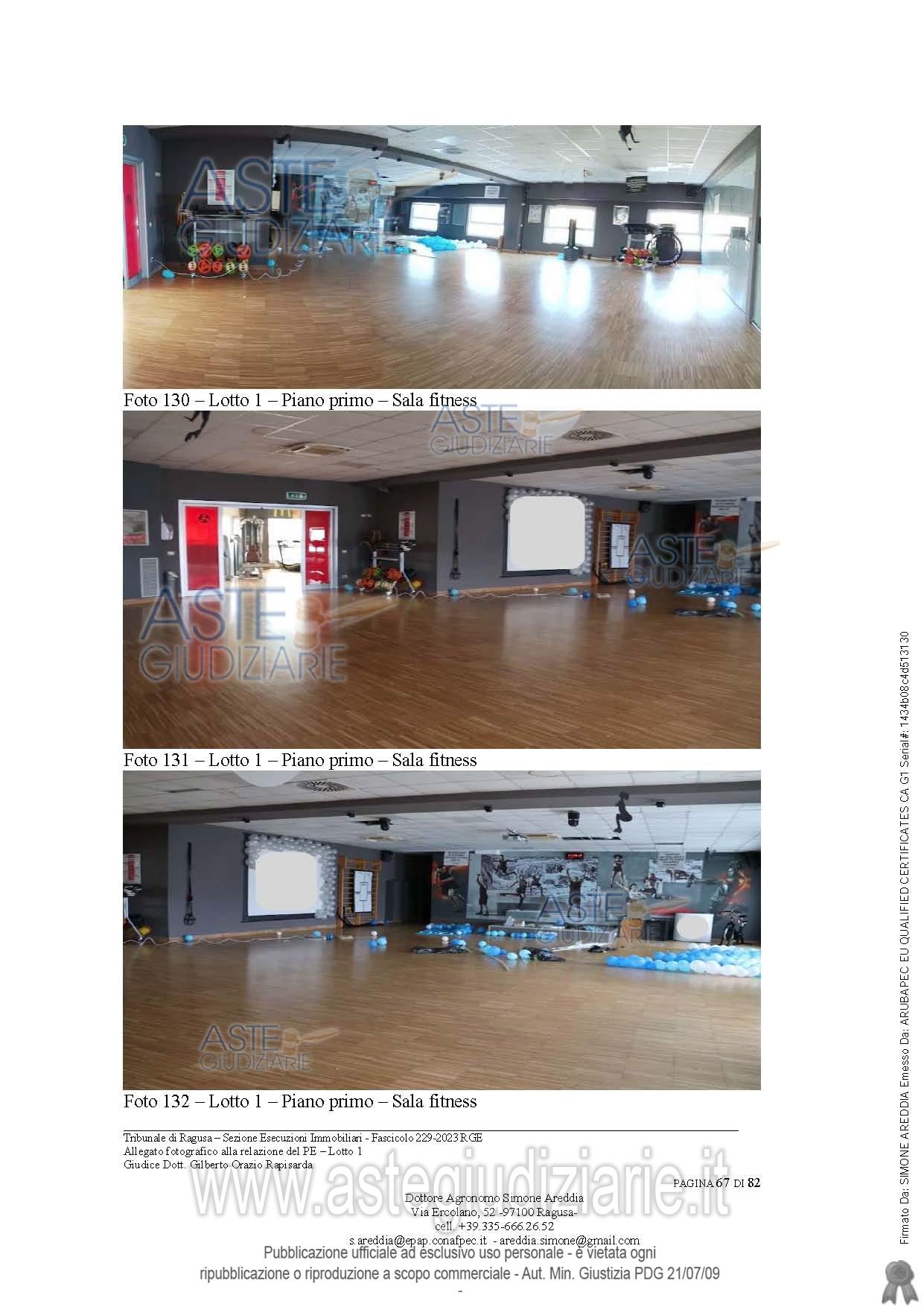 Vendita all'asta Senza incanto, con gara telematica sincrona mista - LOTTO 1: Diritti di piena proprietà di un fabbricato per esercizio sportivo, su due livelli, adibito aCentro fitness, con pertinenziale corte di accesso, sito in Ragusa Via Germania N.12, meglioidentificato al N.C.E.U del predetto Comune alla Sez. A, Foglio 81, particella 1243, sub. 5Cat. D6. Prezzo base € 622.312,00 (offerta minima € 466.734,00). Data vendita 13/02/2026 ore 16:00. Giudice Antonio Pianoforte. Professionista delegato alla vendita Dott. Giovanna Scifo - Email "g.scifo@gmail.com". Custode Giudiziario Dott. Giovanna Scifo - Email "g.scifo@gmail.com"; Tel. 3392519150. Rif. Tribunale di Ragusa - Espropriazione immobiliare (cartabia) n. 229/2023