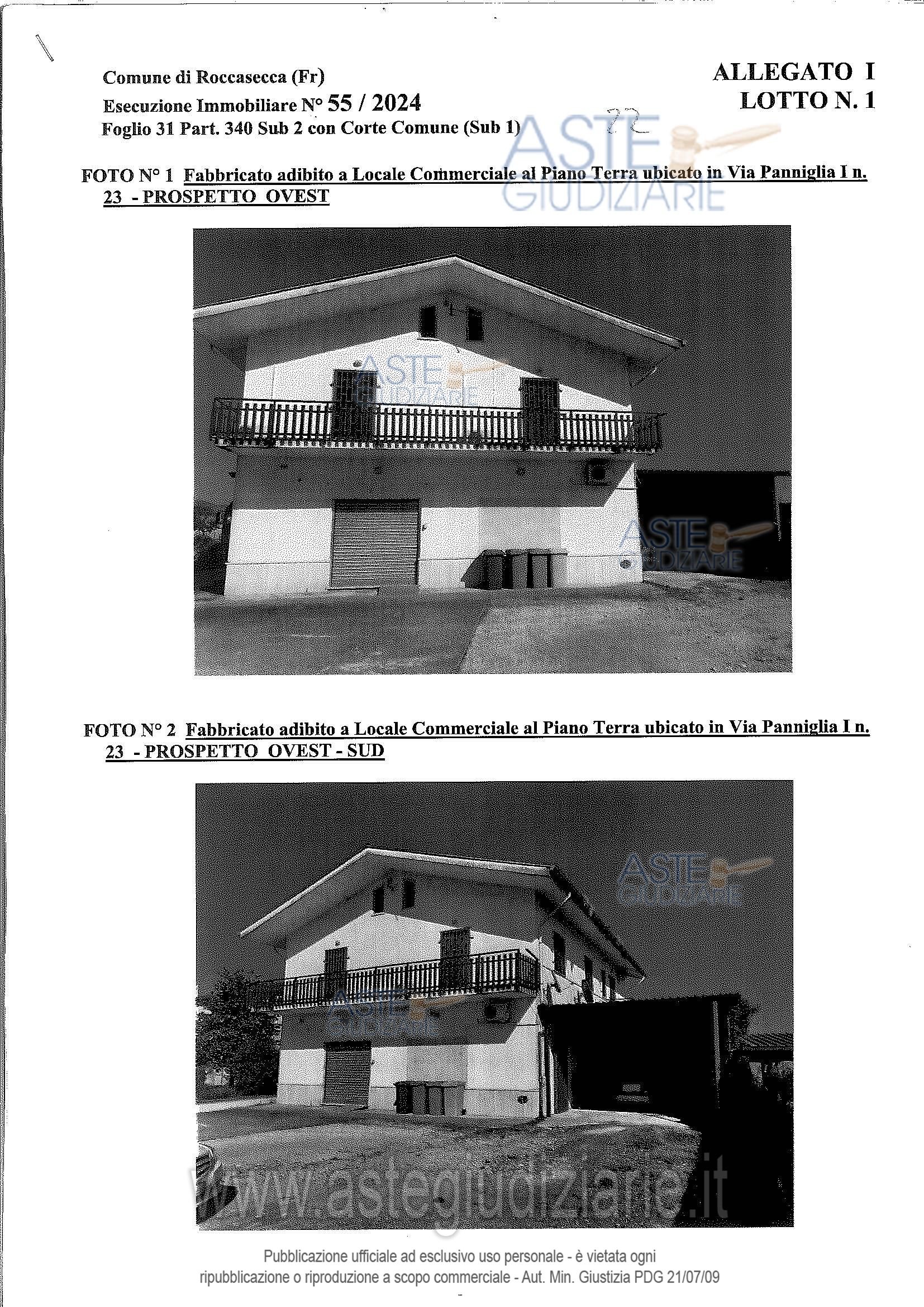Vendita all'asta Senza incanto, con gara telematica asincrona - LOTTO 01: Diritto di proprietà 1/1 su Porzione di Fabbricato adibito a locale commerciale negozio C/1 ubicato nel Comune di Roccasecca Fr in Via Panniglia I n. 23 al piano Terra mq 135,98. Distinto al N.C.E.U. al fg. 31 part. 340 sub. 02 con diritto alla corte ed ingresso comune ( fg.31, part. 340, sub.1). Immobile occupato dagli esecutati e dai suoi familiari. Prezzo base € 36.044,00 (offerta minima € 27.033,00). Data inizio operazioni di vendita: 09/06/2026 ore 10:30. Professionista delegato alla vendita Avv. Mario Franco Conte - Email "avvocatocontemario@gmail.com"; Tel. 077621115. Custode Giudiziario Avv. Mario Franco Conte - Email "avvocatocontemario@gmail.com"; Tel. 077621115. Rif. Tribunale di Cassino - Espropriazione immobiliare (cartabia) n. 55/2024