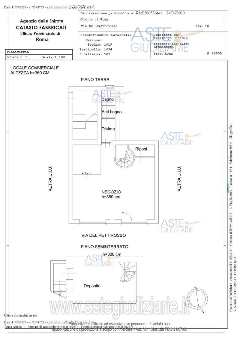 Vendita all'asta Senza incanto, con gara telematica asincrona - LOTTO UNICO: Quota pari a 100 / 100 del diritto di intera proprietà di locale ad uso negozio con annesso sottostante magazzino / deposito, sito in Roma alla via del Pettirosso n. 10, piano T - S1, identificato al Catasto Fabbricati del Comune di Roma al foglio n. 1019 p.lla 150 sub 502 graffato al foglio 1019 p.lla 1034 sub 503, Zona censuaria 6, categoria C/1, classe 8, piano S01-TE, consistenza di mq. 58, r.c. Euro 1.401,87. Prezzo base € 73.600,00 (offerta minima € 55.200,00). Data inizio operazioni di vendita: 19/11/2025 ore 10:00. Giudice Lauropoli. Professionista delegato alla vendita Dott. Gabriele Felici. Custode Giudiziario Ivg Di Roma Srl - Email "pvp@visiteivgroma.it"; Tel. 0689569801. Rif. Tribunale di Roma - Espropriazione immobiliare (cartabia) n. 1023/2023