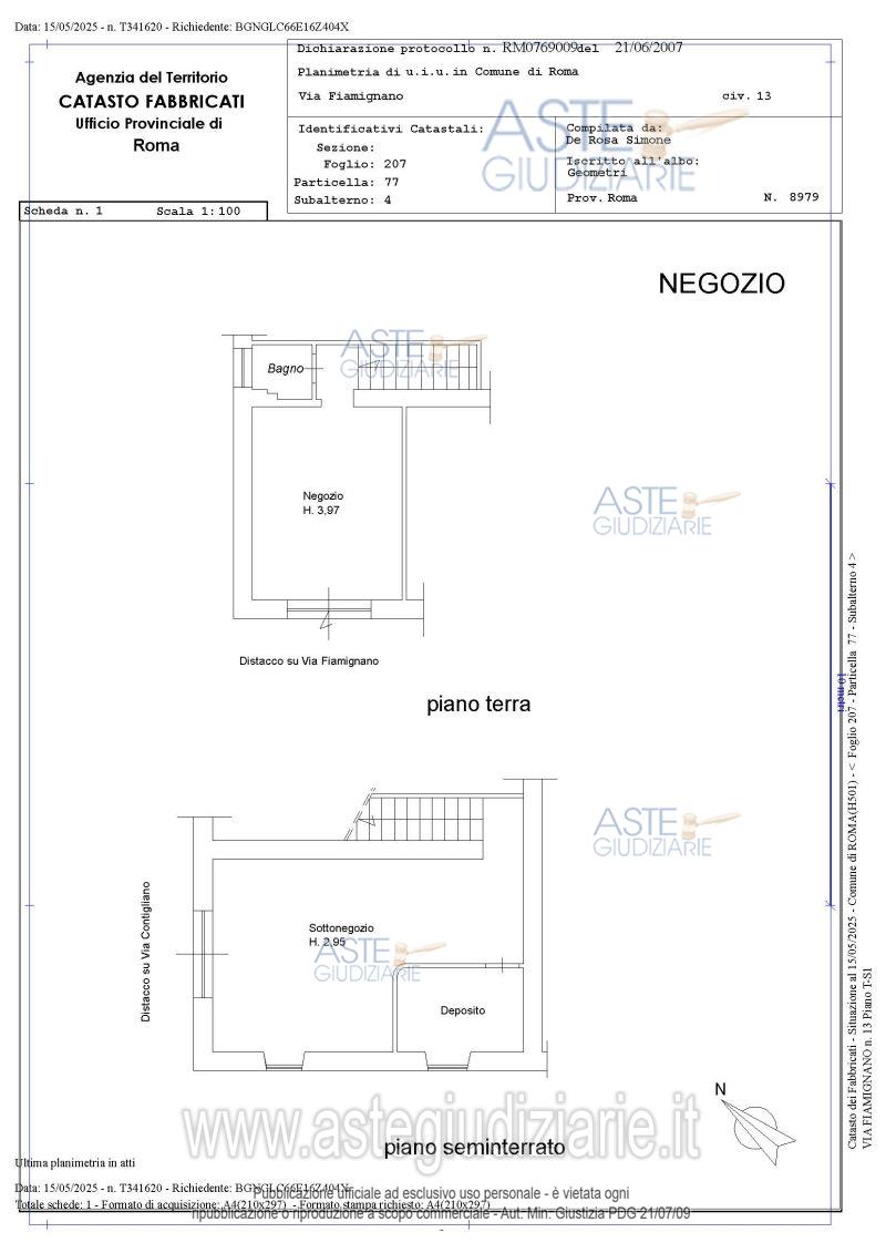 Vendita all'asta Senza incanto, con gara telematica asincrona - LOTTO 1: Bene 1: piena proprietà di negozio ubicato in Roma Via Fiamignano n.15, piano T-S1. Bene 2: piena proprietà di magazzino ubicato in via Fiamignano n.15 posto al piano S1. Prezzo base € 87.000,00 (offerta minima € 65.250,00). Data inizio operazioni di vendita: 16/06/2026 ore 14:00. Giudice Dott. Miriam Iappelli. Professionista delegato alla vendita Avv. Paolo Tomassini. Custode Giudiziario Istituto Vendite Giudiziarie Di Roma Srl - Email "pvp@visiteivgroma.it"; Tel. 0689569801. Rif. Tribunale di Roma - Espropriazione immobiliare (cartabia) n. 1304/2024