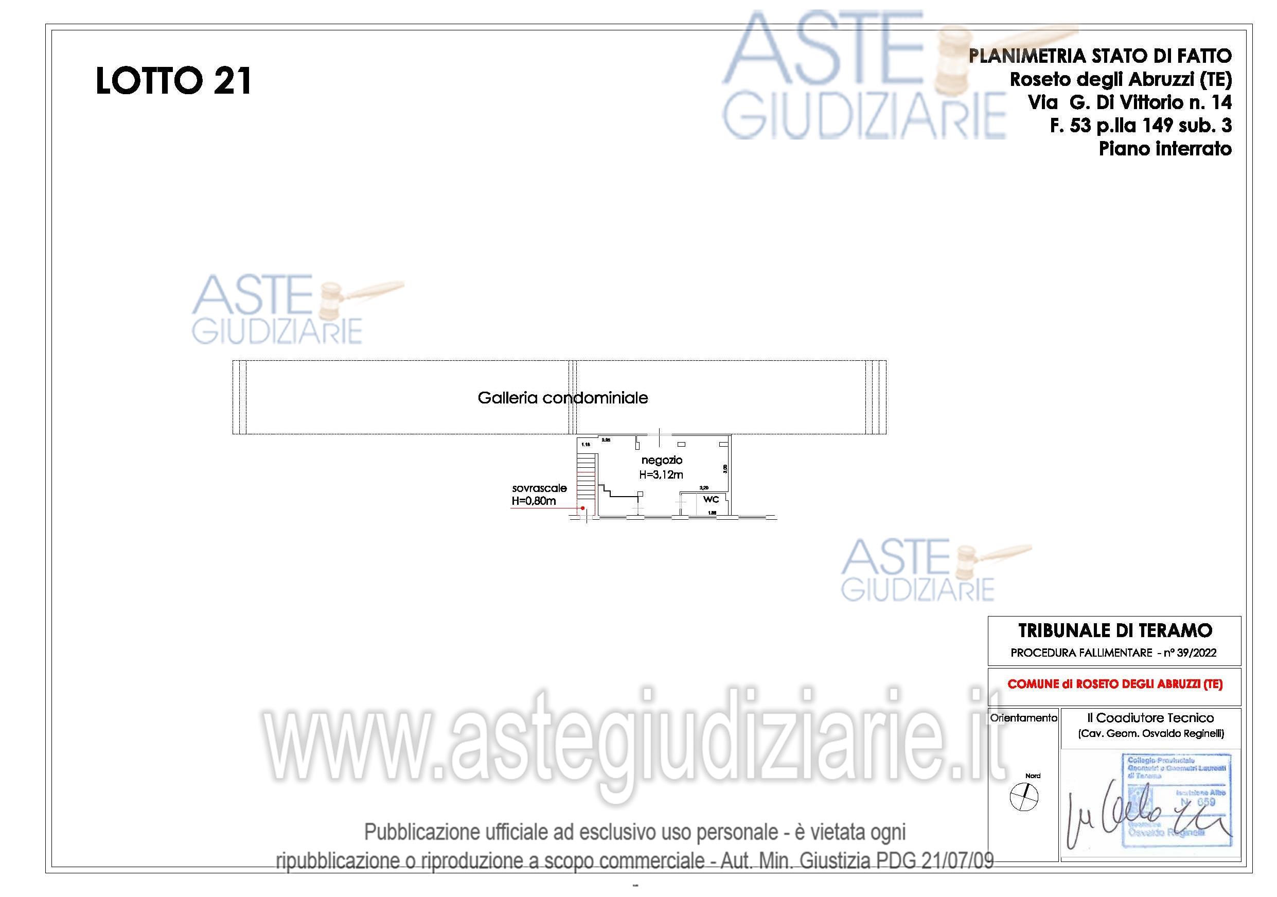 Vendita all'asta Senza incanto, con gara telematica asincrona - LOTTO 21: Diritti pari alla piena proprietà per la quota di 1/1 di Negozio sito in Roseto degli Abruzzi (TE), Via Giuseppe di Vittorio n. 12, int. B, piano terra, censito al Catasto Fabbricati del predetto Comune al Foglio 53, p.lla 149, sub. 3, cat. C/1, Classe 2, Zona Cens. 2, Rendita € 664,68, superficie convenzionale mq 49,50.L'immobile, inserito in un contesto condominiale, risulta in buono stato conservativo. Prezzo base € 31.500,00 (offerta minima € 31.500,00). Data inizio operazioni di vendita: 22/04/2026 ore 15:30. Giudice Flavio Conciatori. Custode Giudiziario Geom. Osvaldo Reginelli - Email "info@reginelliandpartners.com"; Tel. 0861587190. Curatore Avv. Caterina Crescenzo - Email "caterina.crescenzo@gmail.com"; Cell. 3485840594; Tel. 0861416166. Rif. Tribunale di Teramo - Fallimentare (nuovo rito) n. 39/2022