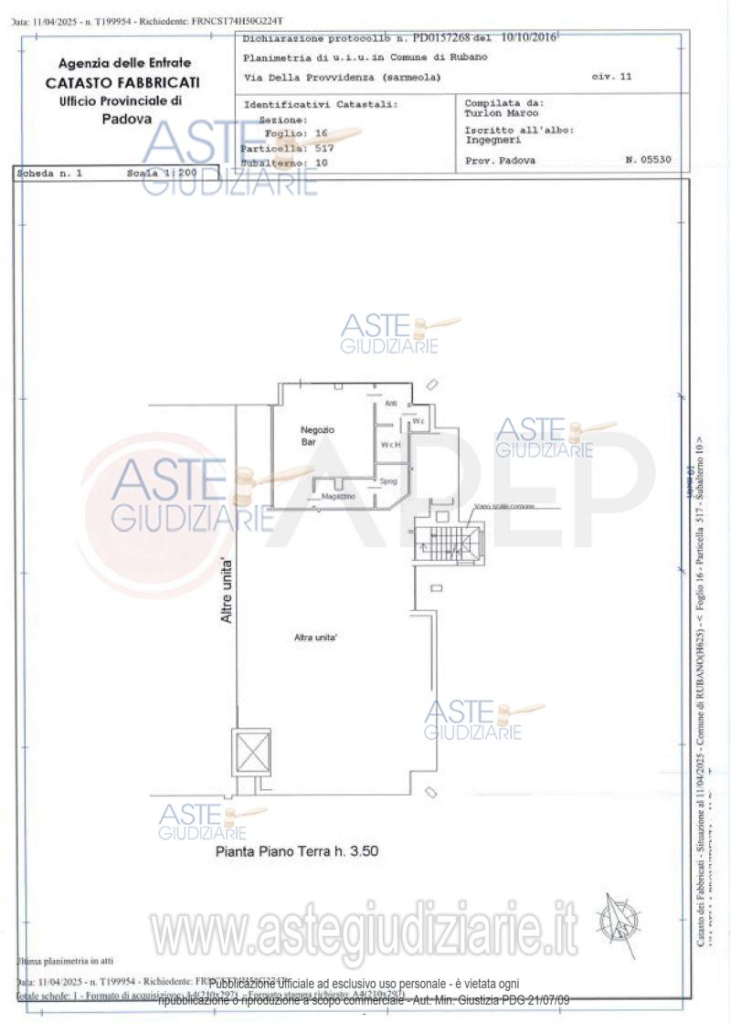 Vendita all'asta Senza incanto, con gara telematica sincrona - LOTTO 3: Lotto 3 - piena proprietà di unità immobiliare ad uso bar, facente parte del fabbricato condominiale sito in Comune di Rubano (PD), località Sarmeola, via Della Provvidenza con ingresso dai civici nn. 13 e 15 e precisamente consiste in un negozio adibito a bar al piano terra, con bagno e antibagno, due ripostigli per una superficie commerciale di mq. 58. Occupato con titolo. Prezzo base € 44.500,00 (offerta minima € 33.375,00). Data vendita 21/04/2026 ore 10:30. Giudice Rossi. Professionista delegato alla vendita Not. Michelangelo Casciano - Email "aste@apepnotai.it"; Tel. 049651228. Custode Giudiziario Apep - Email "visita@apepnotai.it"; Tel. 049651228. Rif. Tribunale di Padova - Espropriazione immobiliare (cartabia) n. 36/2025
